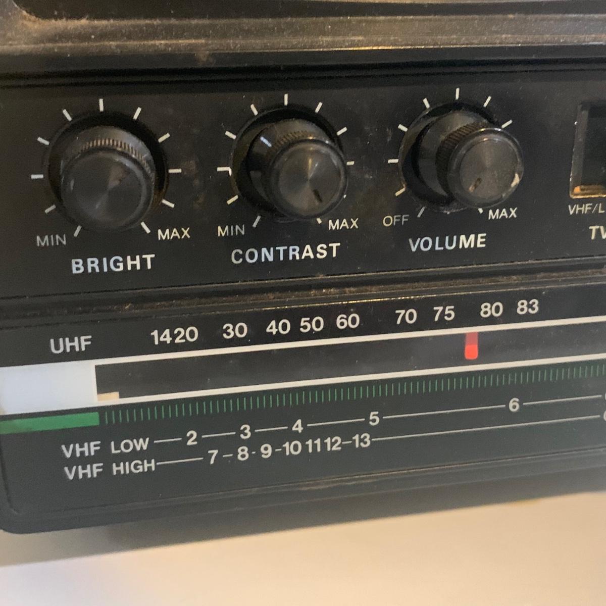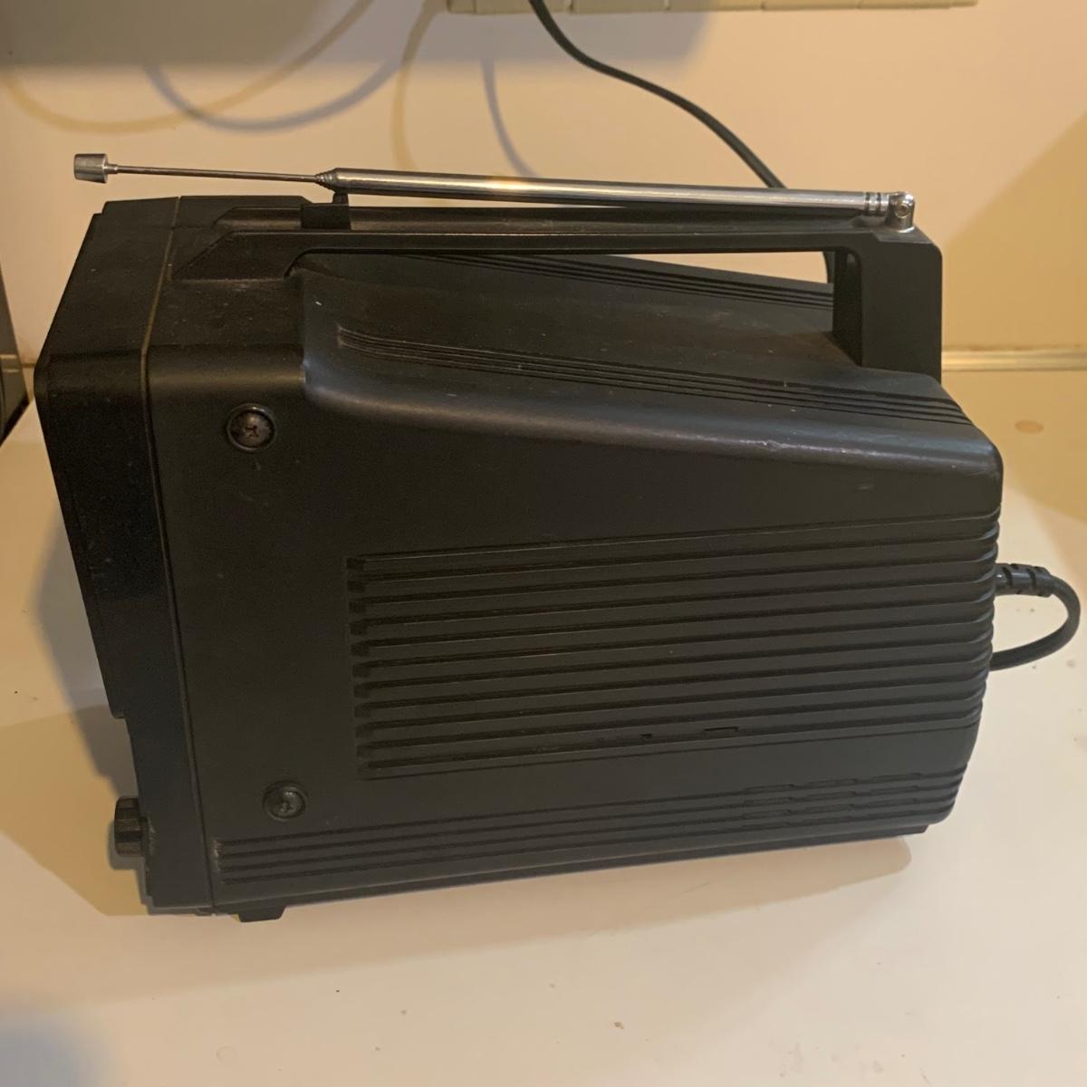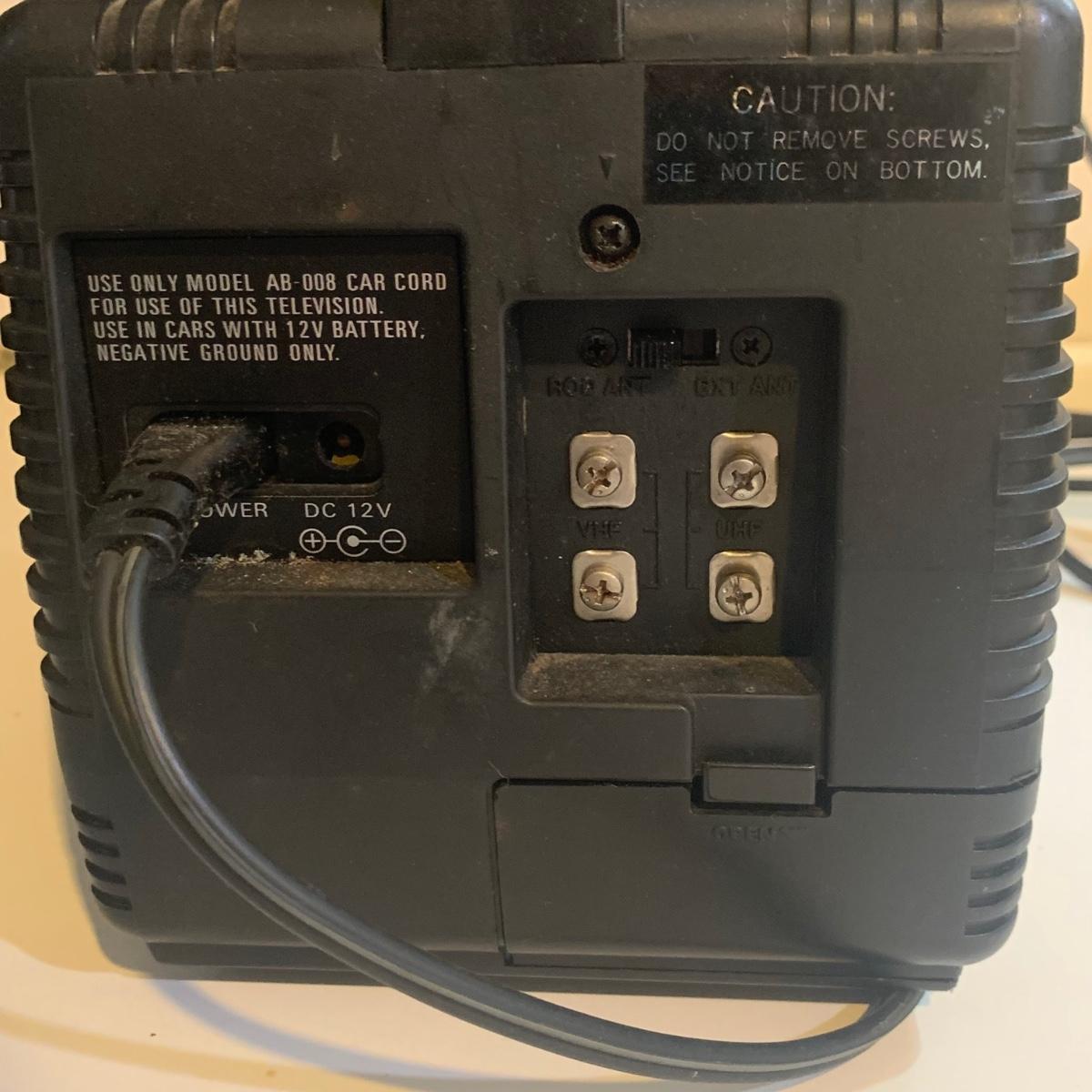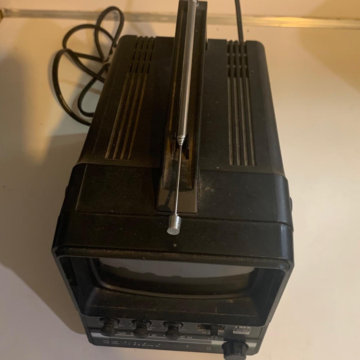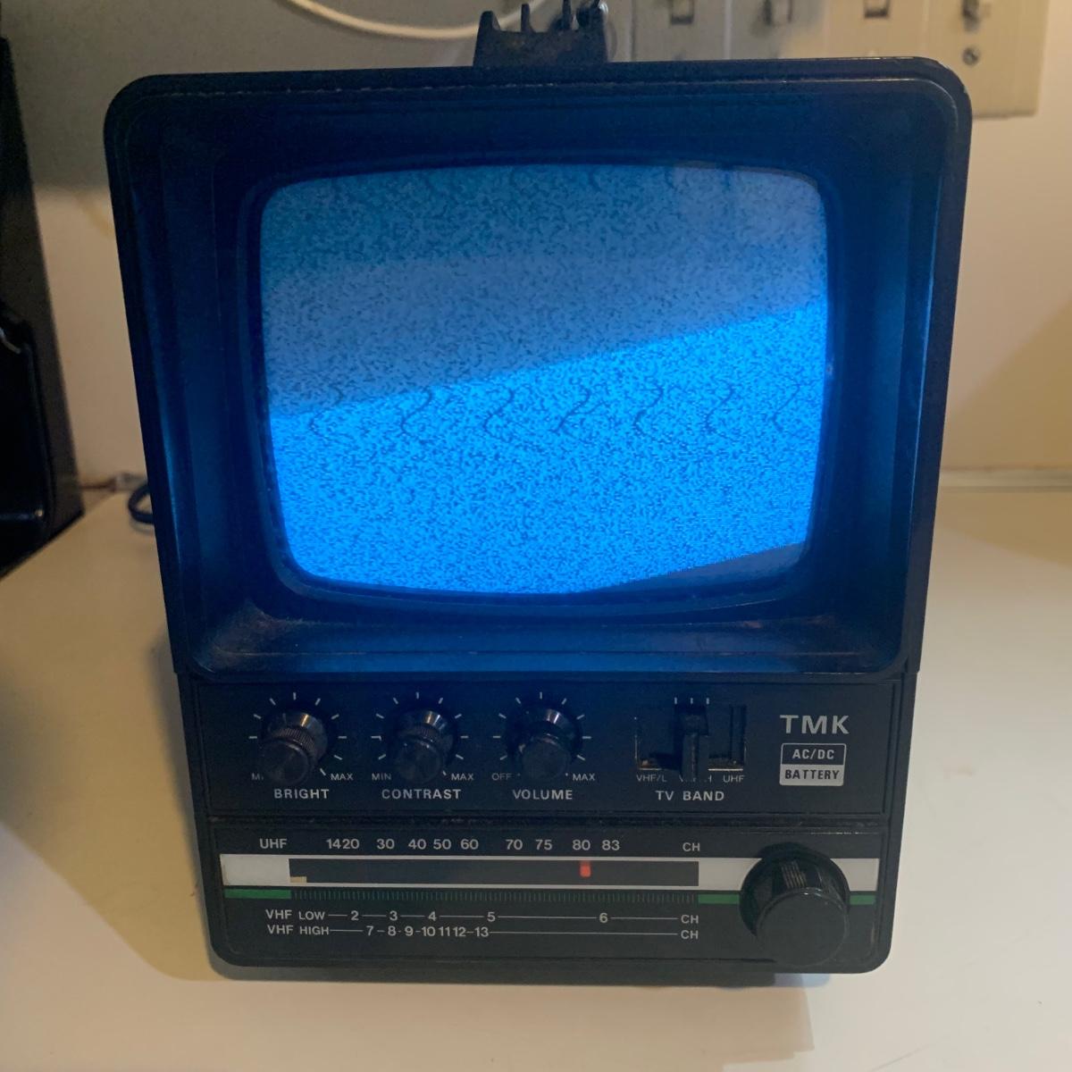 TMK Model 700 portable TV measures approximately 6” x 10” x 7.5”H. Unit powered on when plugged in.