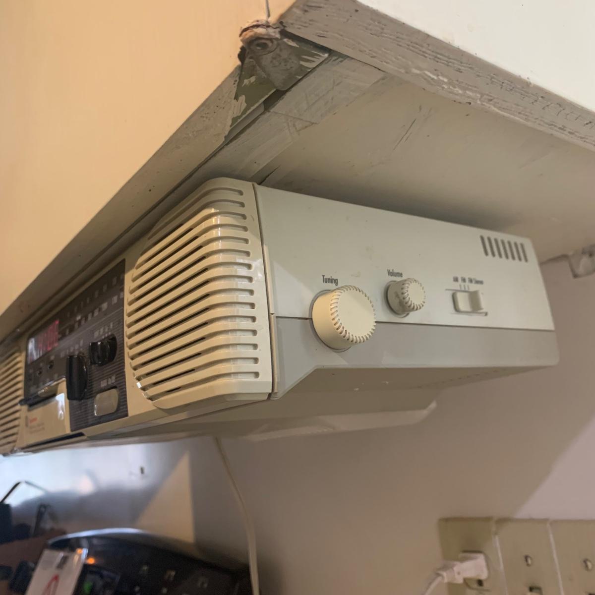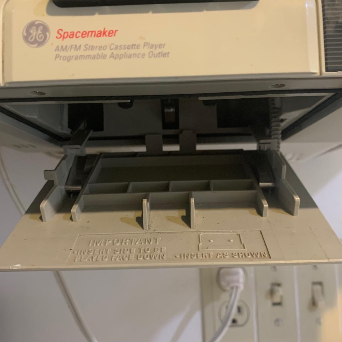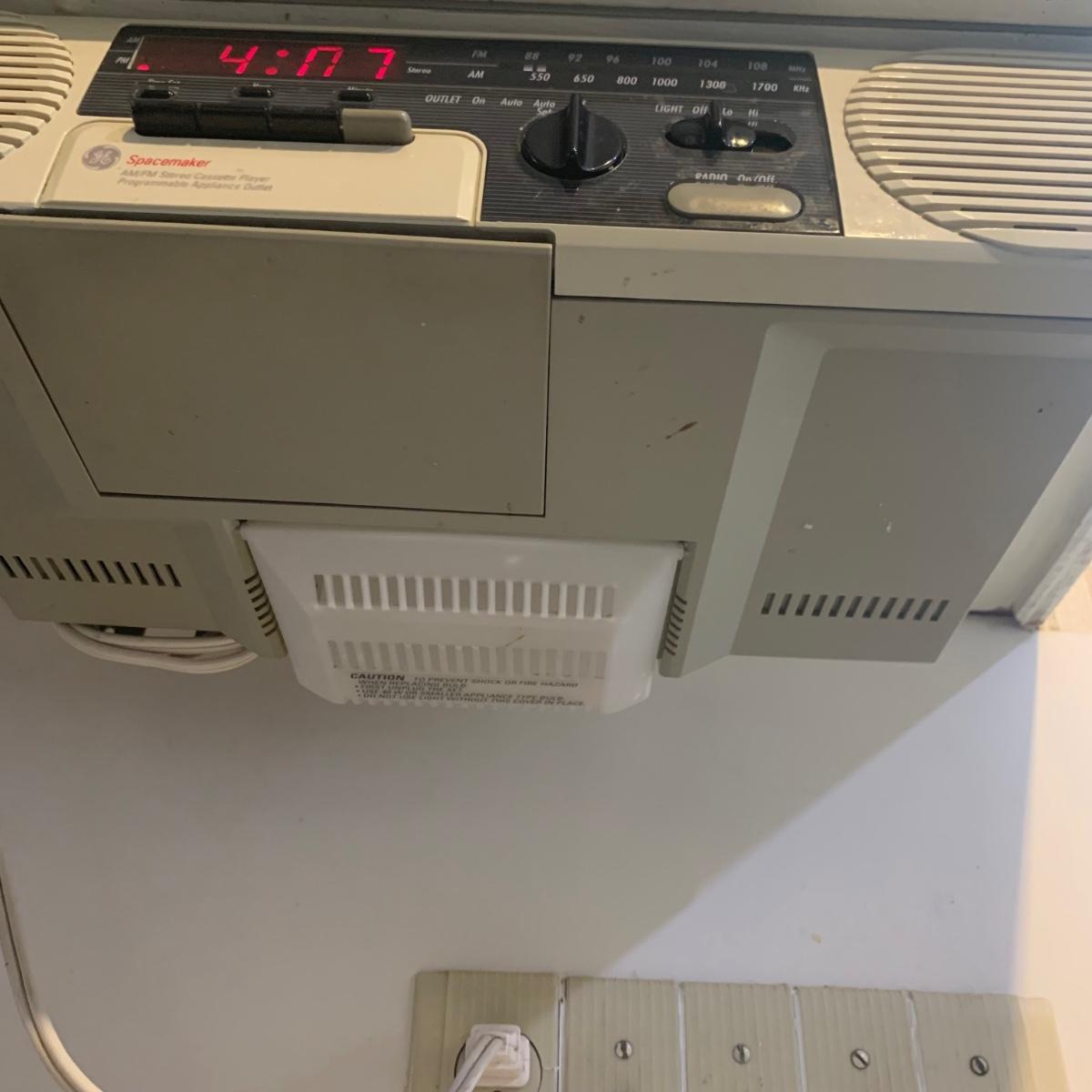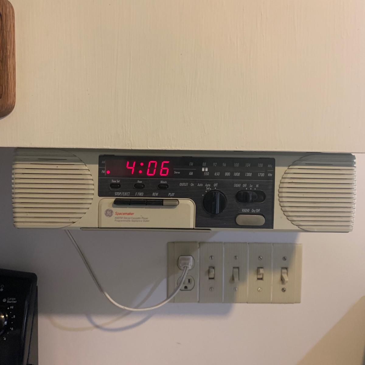 GE Spacemaker AM/FM Stereo Cassette Player Programmable Appliance Outlet can install in a kitchen cabinet to save countertop space. This unit measures 14” x 9” x 3.5”H. It powered on and radio functioned. Winning bidder will need to remove from cabinet it is currently in. Please bring appropriate screwdrivers.