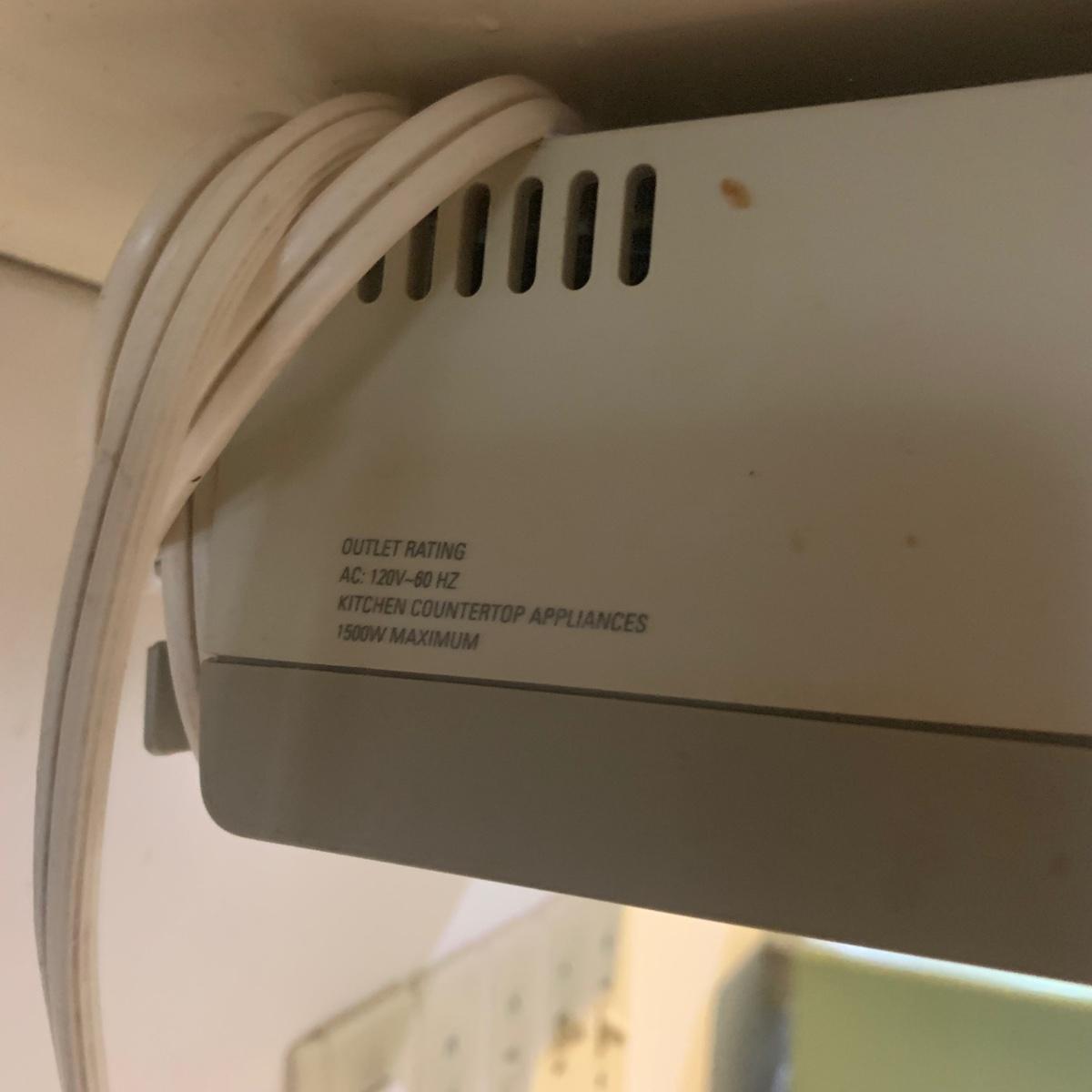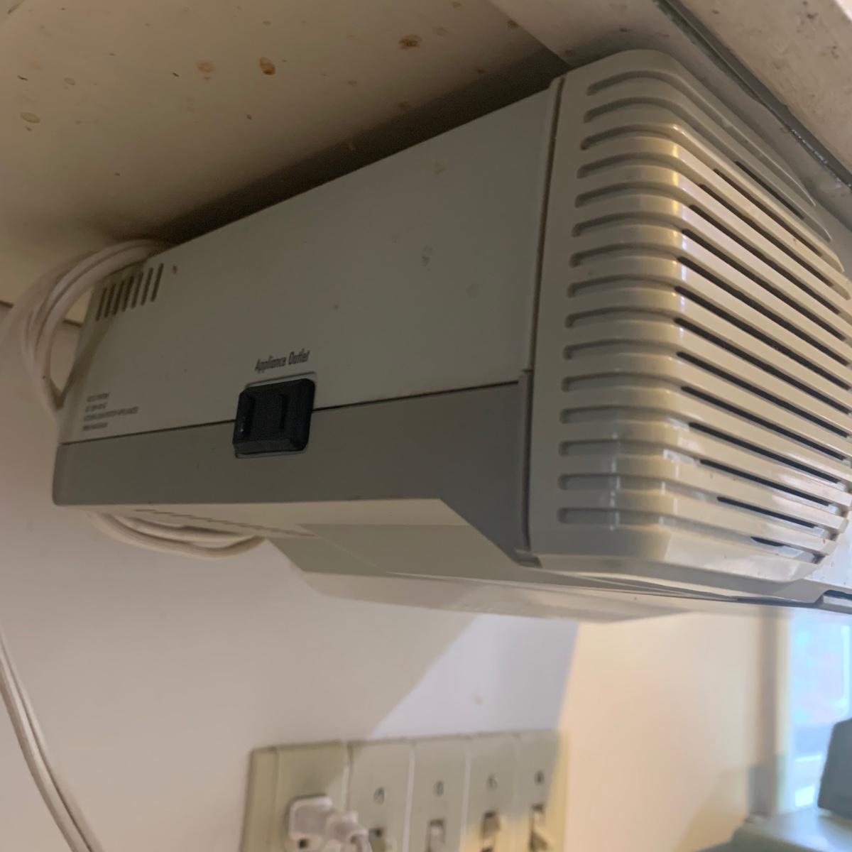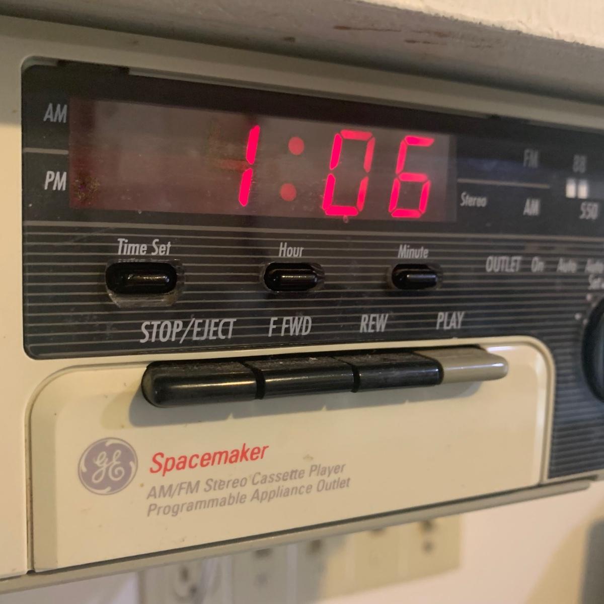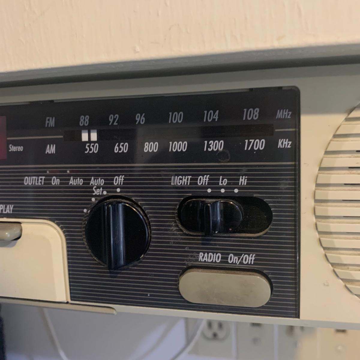 GE Spacemaker AM/FM Stereo Cassette Player Programmable Appliance Outlet can install in a kitchen cabinet to save countertop space. This unit measures 14” x 9” x 3.5”H. It powered on and radio functioned. Winning bidder will need to remove from cabinet it is currently in. Please bring appropriate screwdrivers.