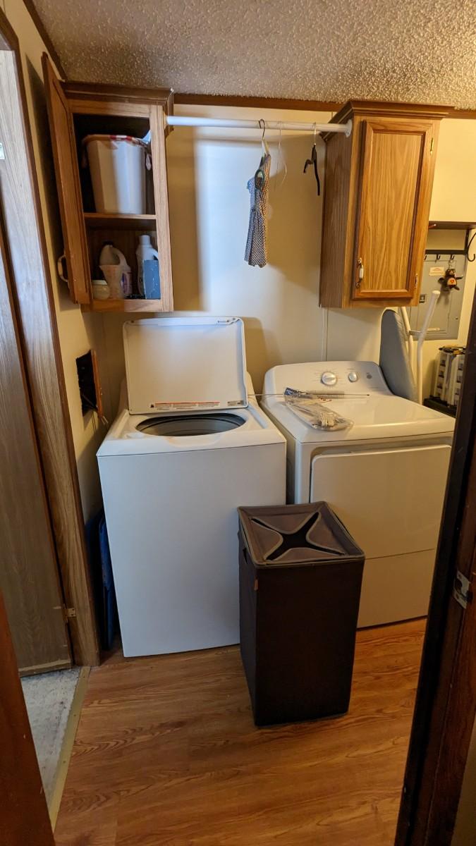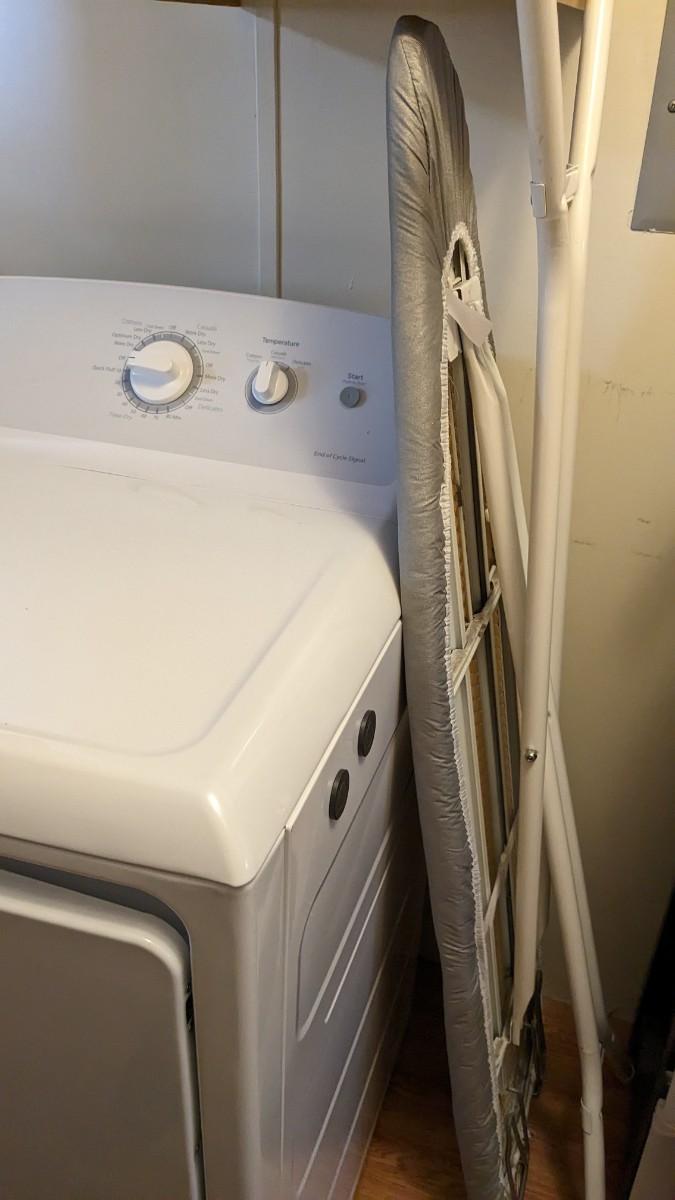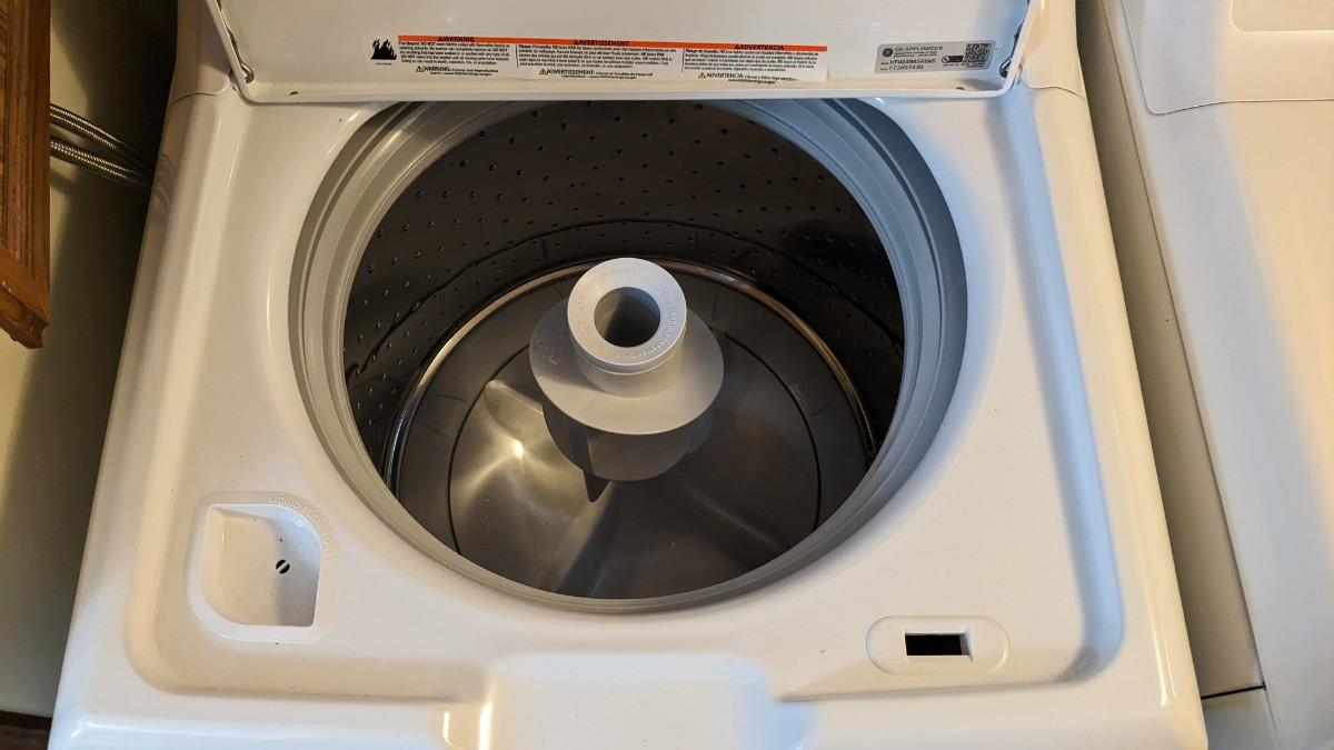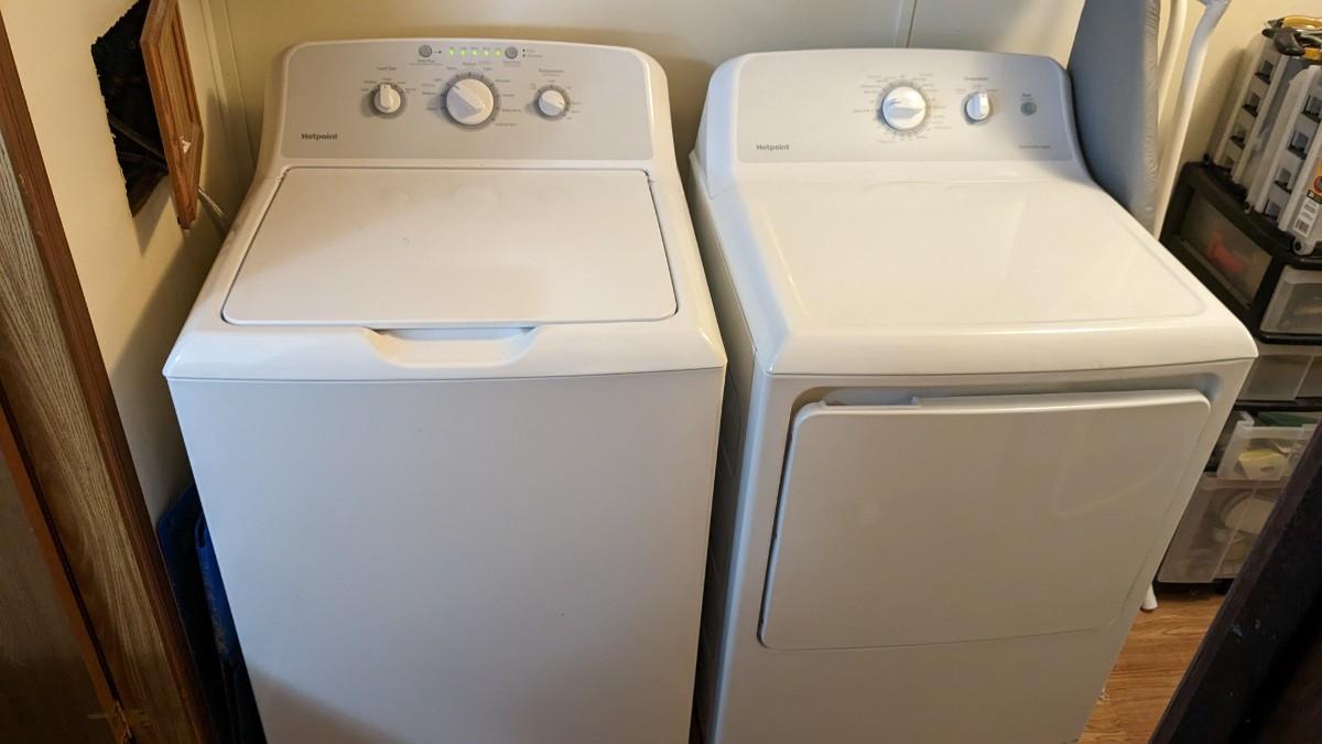 used 3 times before the passing of consignor this set is in PRISTINE condition with no flaws or wear found. Electric dryer. Includes contents of upper cabinet. Washer is approx. 26.75"x27"deepx43" and dryer is approximately 26.5"x 27"deepx43". No shipping. Winning bidder responsible for removal of all items. hallway