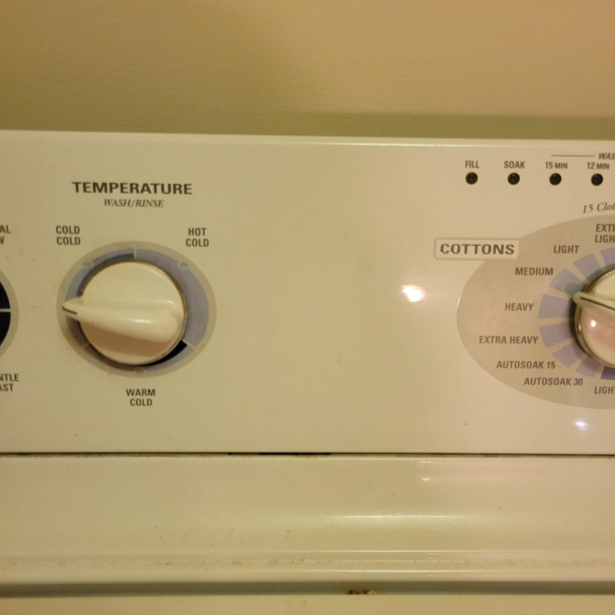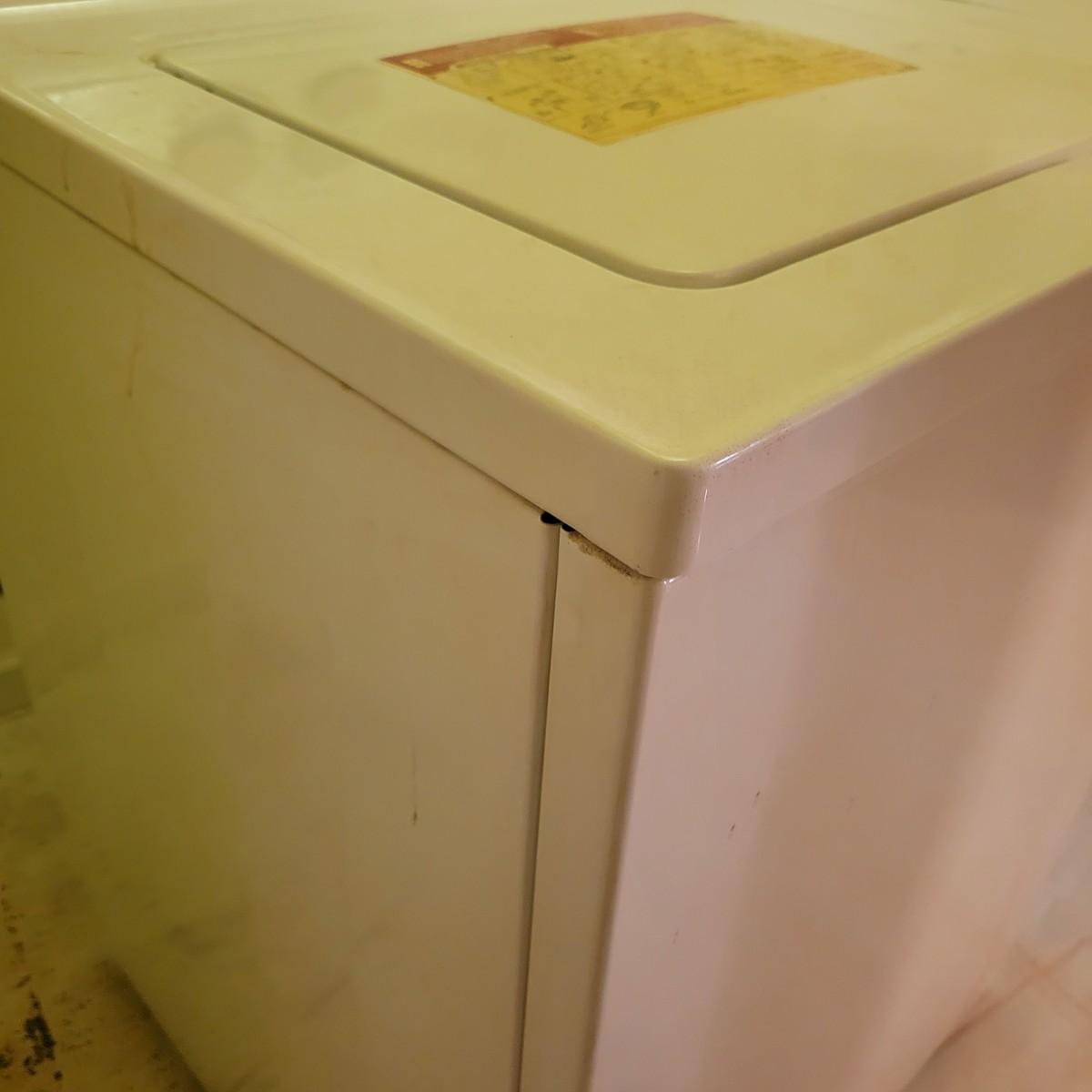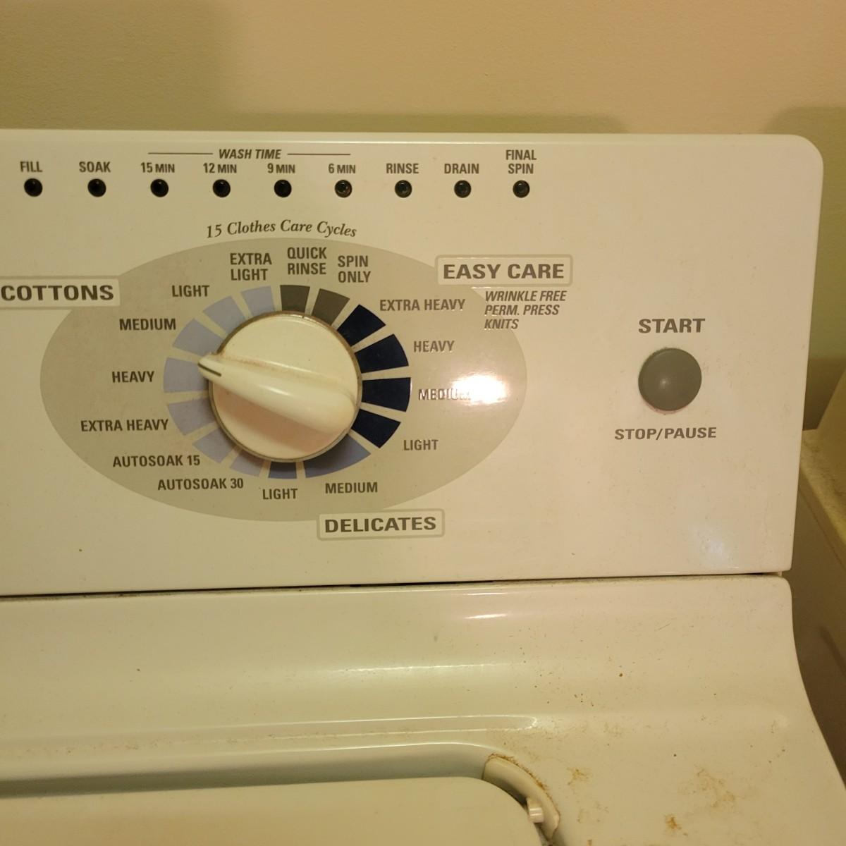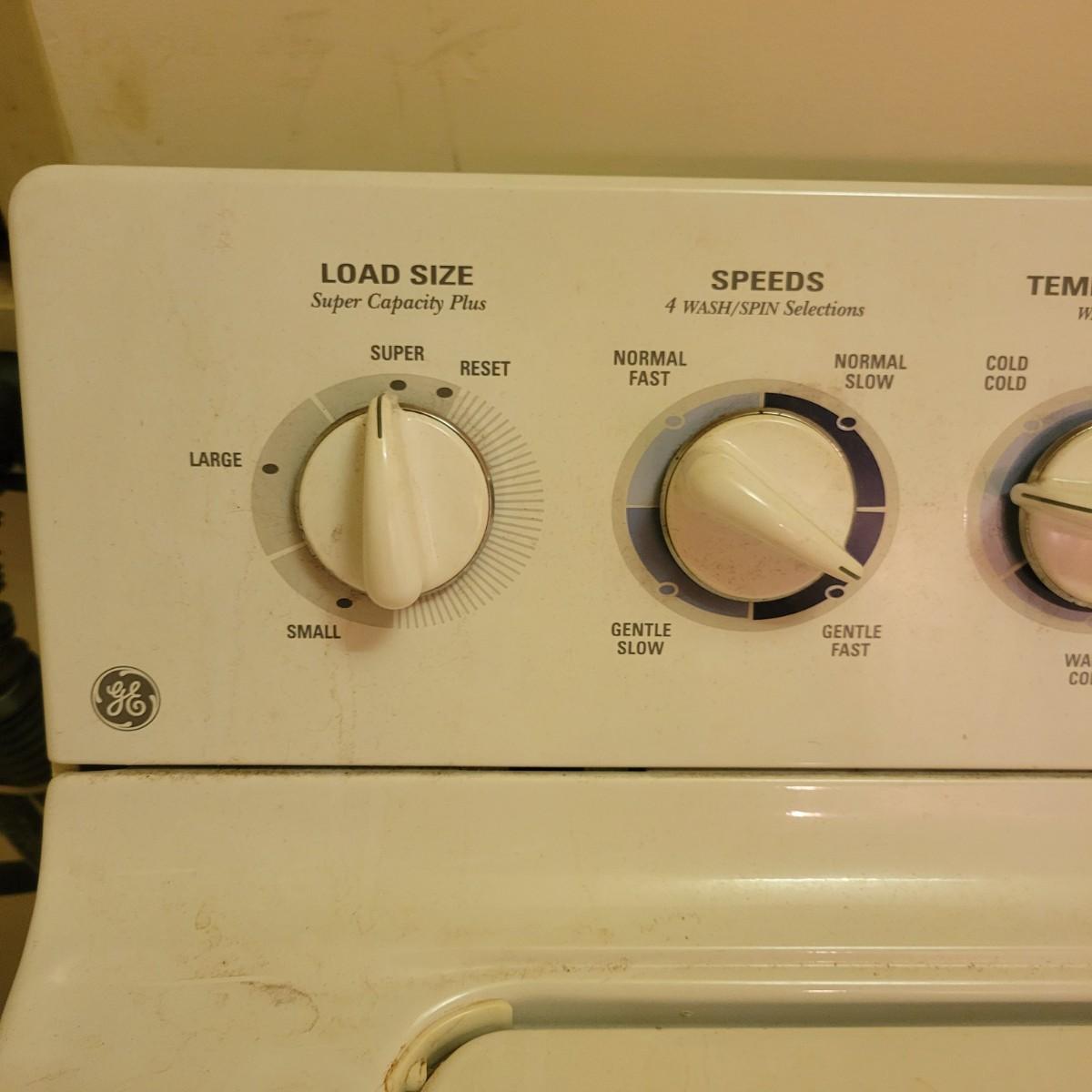A GE washing machine in good condition that worked when tested. The washing machine does have some blemishes on its outer surface, see attached pictures for more detail. The red mark does appear to be permanent. Features a super capacity, four wash/spin selections and fifteen clothes care cycles. Measures approximately 27" x 25.5" x 42" Local pickup only. Please note, this is located downstairs. Buyer can either take up one flight of stairs or move through a small area of grass on same level to remove.