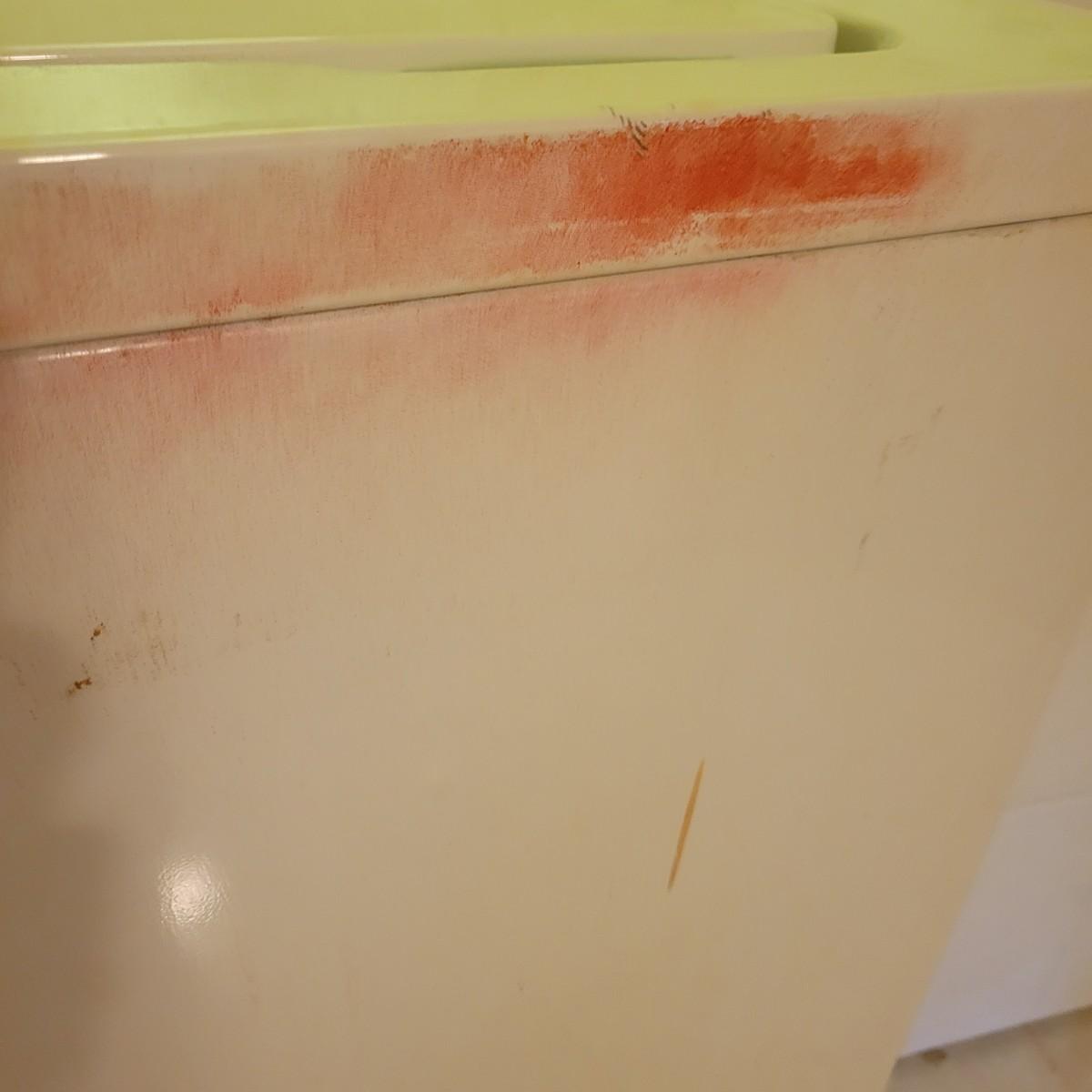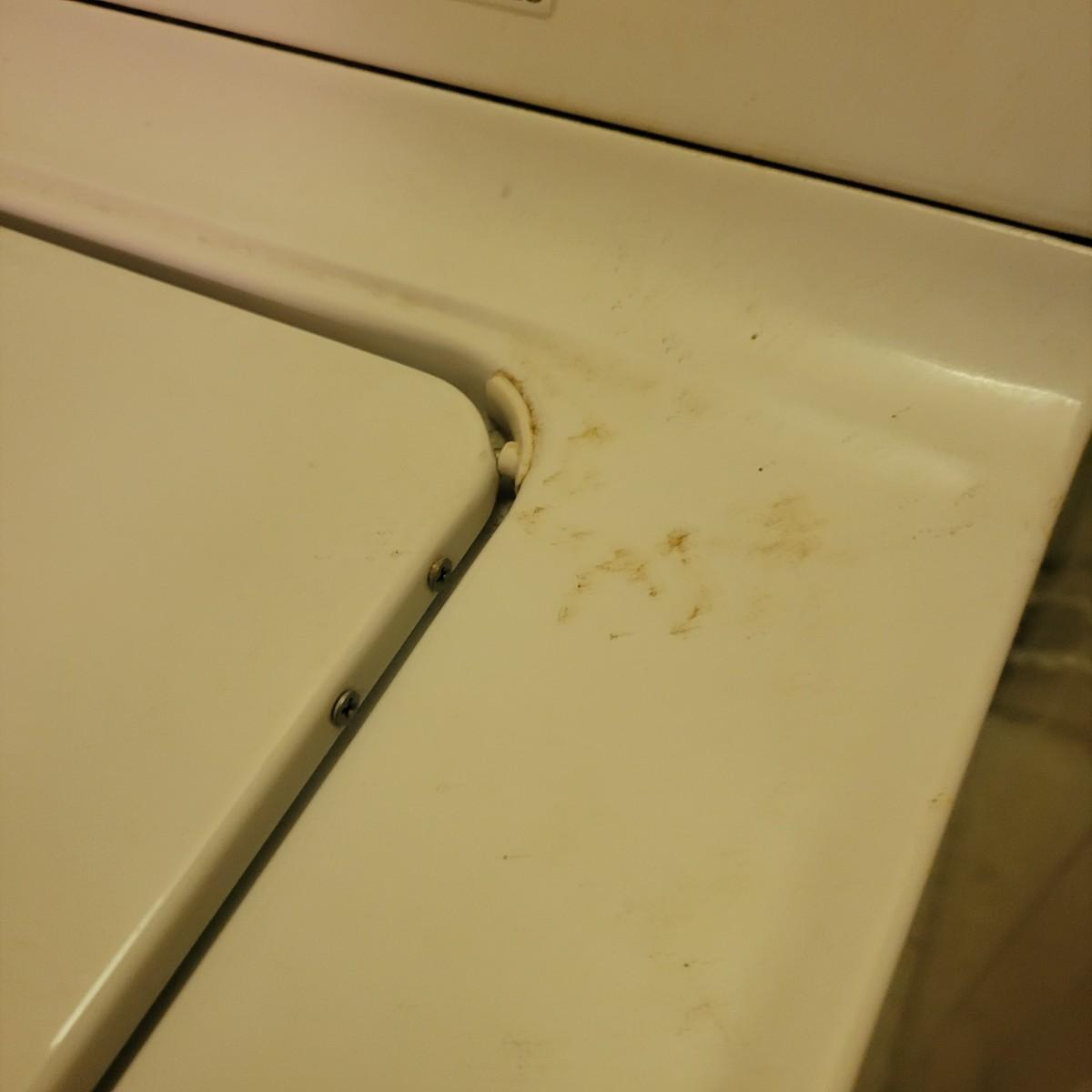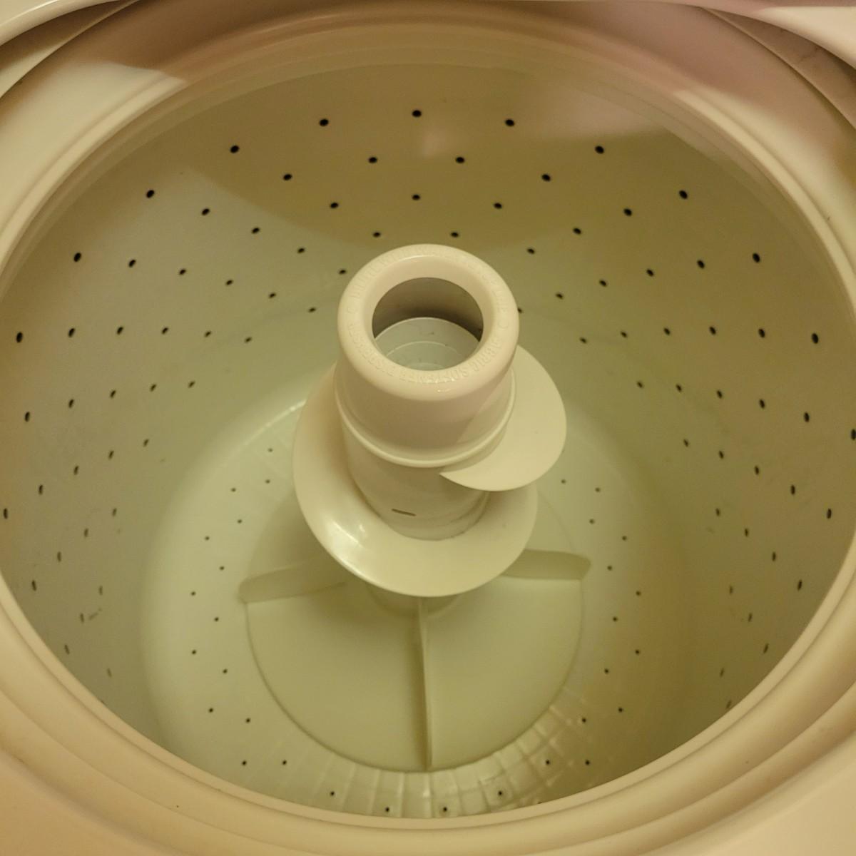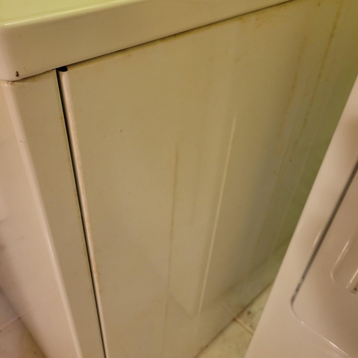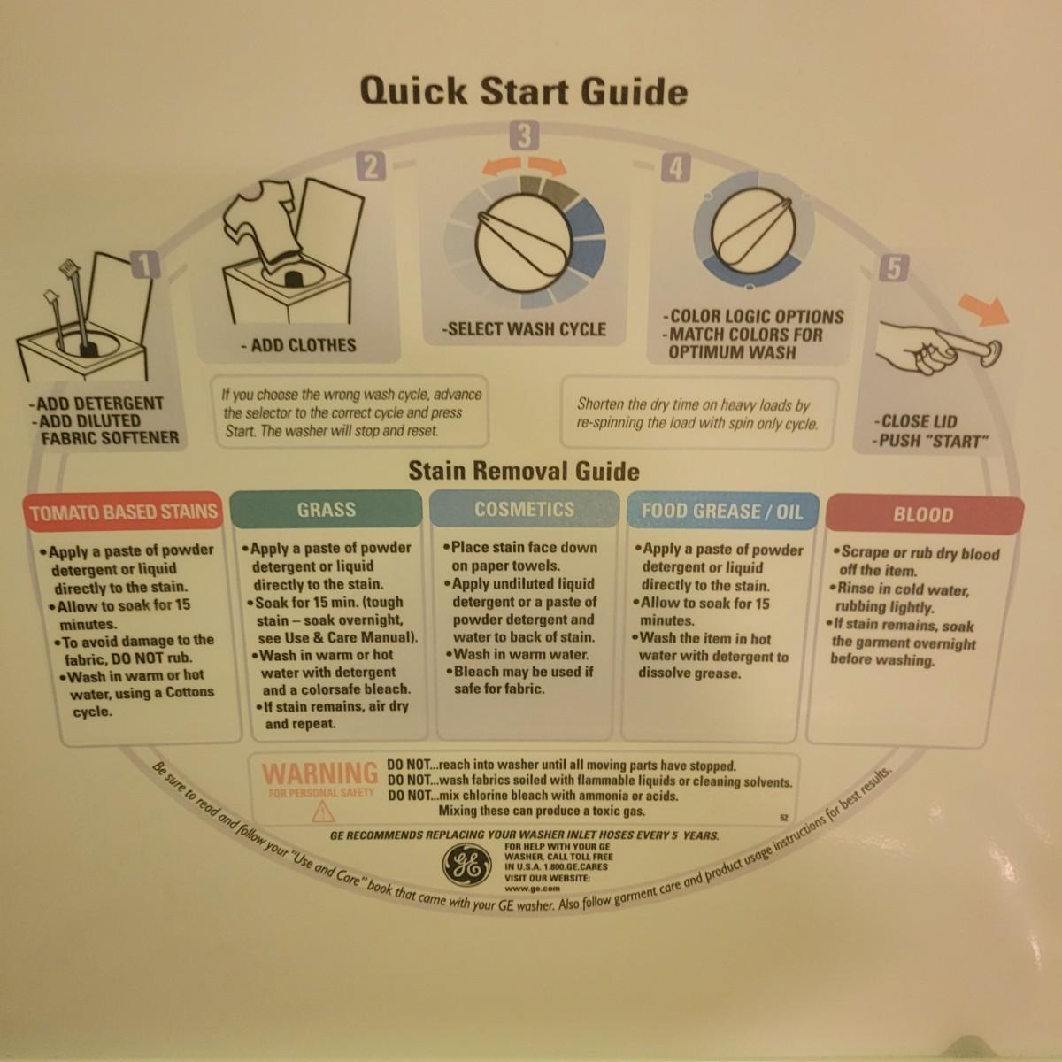 A GE washing machine in good condition that worked when tested. The washing machine does have some blemishes on its outer surface, see attached pictures for more detail. The red mark does appear to be permanent. Features a super capacity, four wash/spin selections and fifteen clothes care cycles. Measures approximately 27" x 25.5" x 42" Local pickup only. Please note, this is located downstairs. Buyer can either take up one flight of stairs or move through a small area of grass on same level to remove.