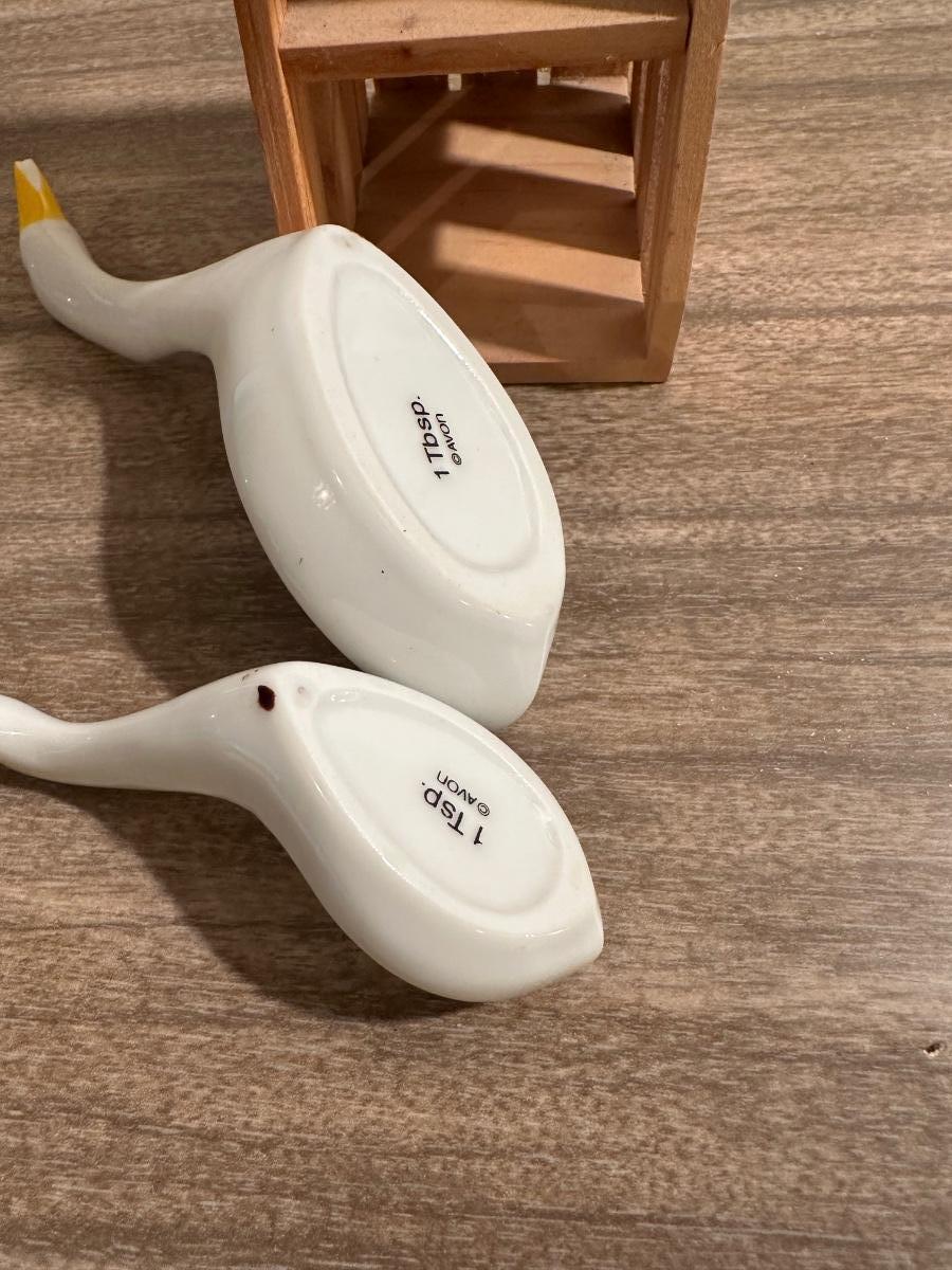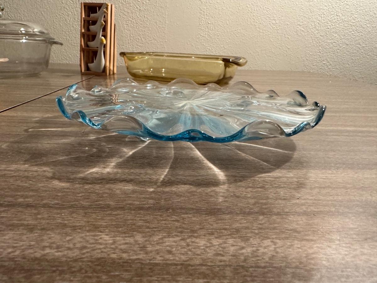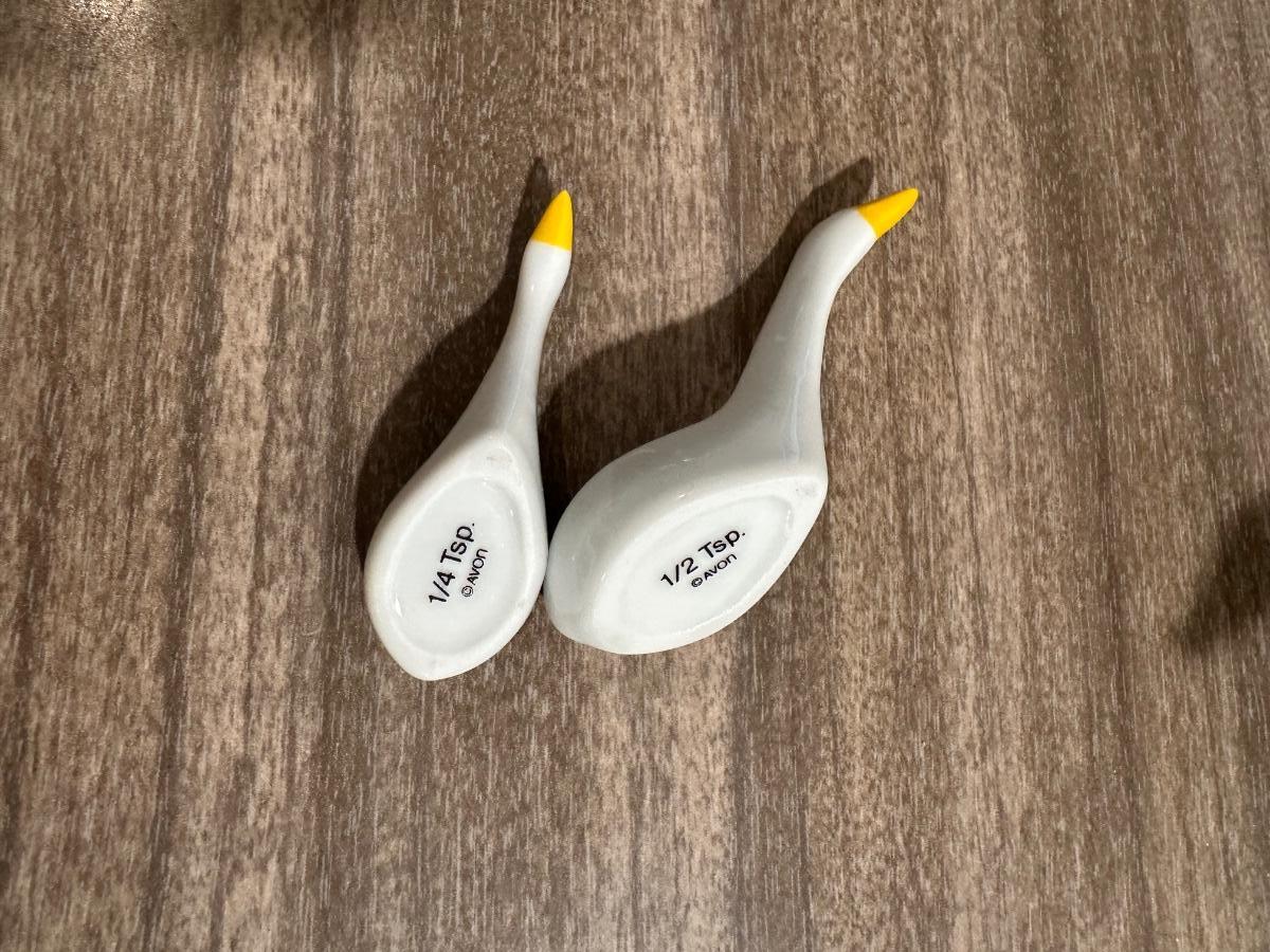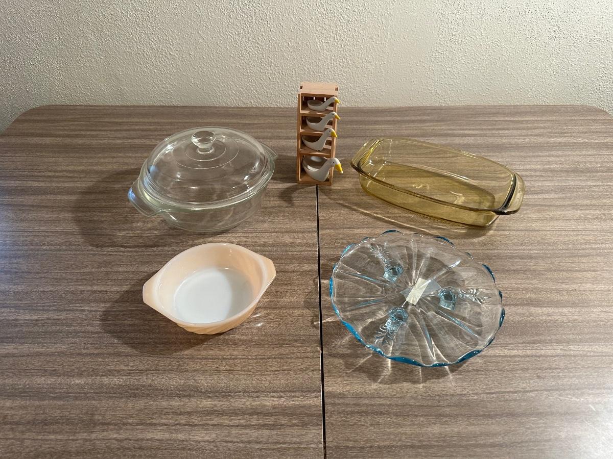 GEESE MEASURING SPOONS, FIRE KING BAKING DISHES AND BLUE GLASS CAKE PLATE