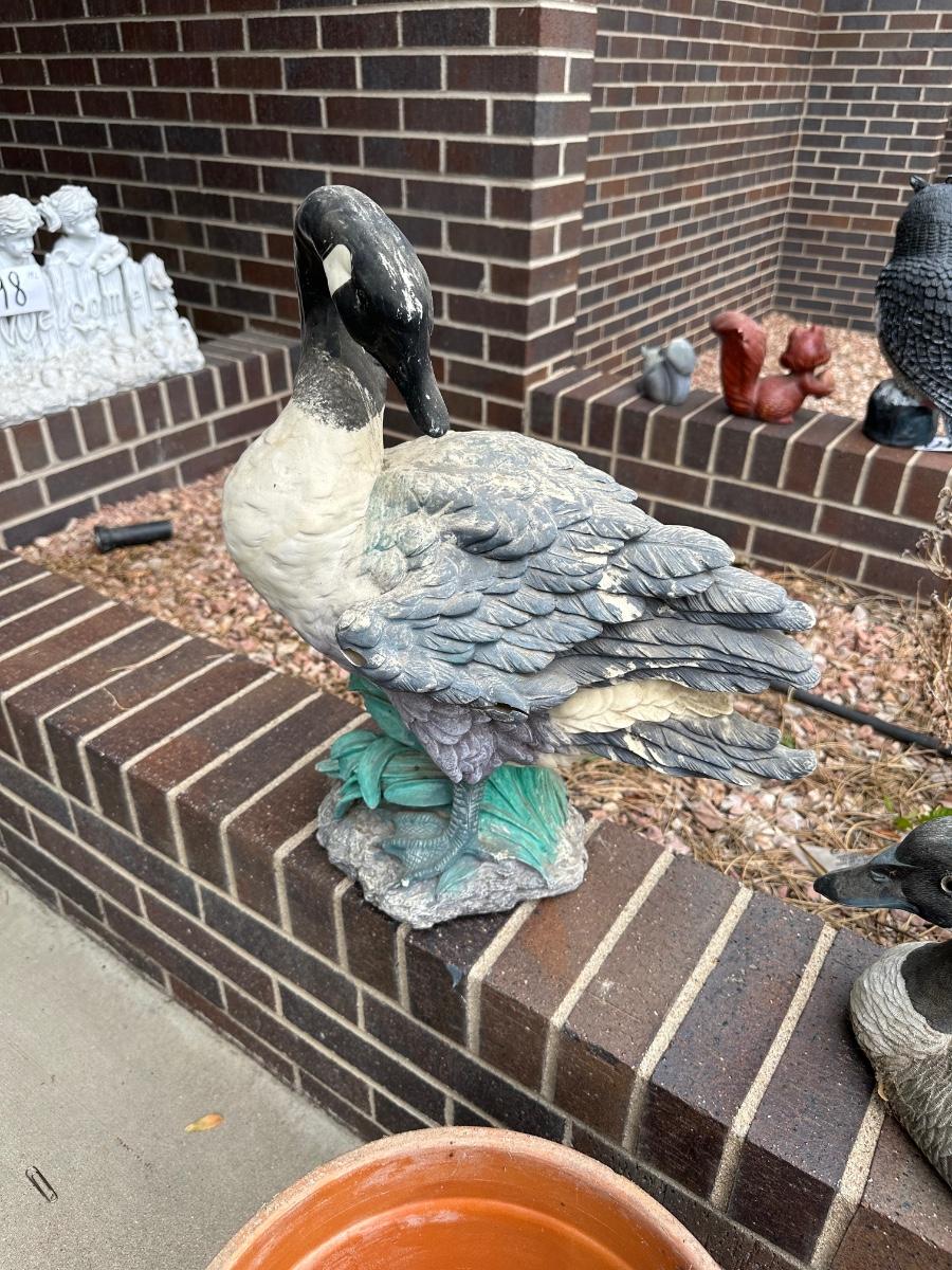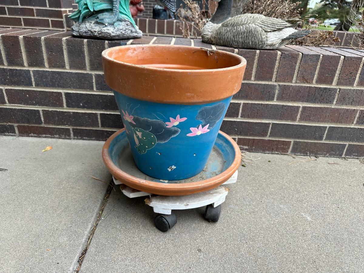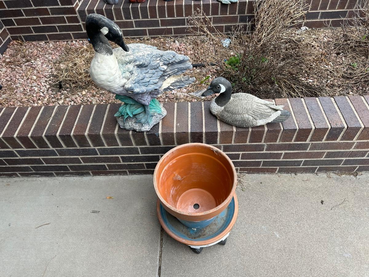 GEESE YARD/GARDEN DECOR AND HAND PAINTED TERRACOTTA PLANTER WITH SAUCER ON PLANT DOLLY