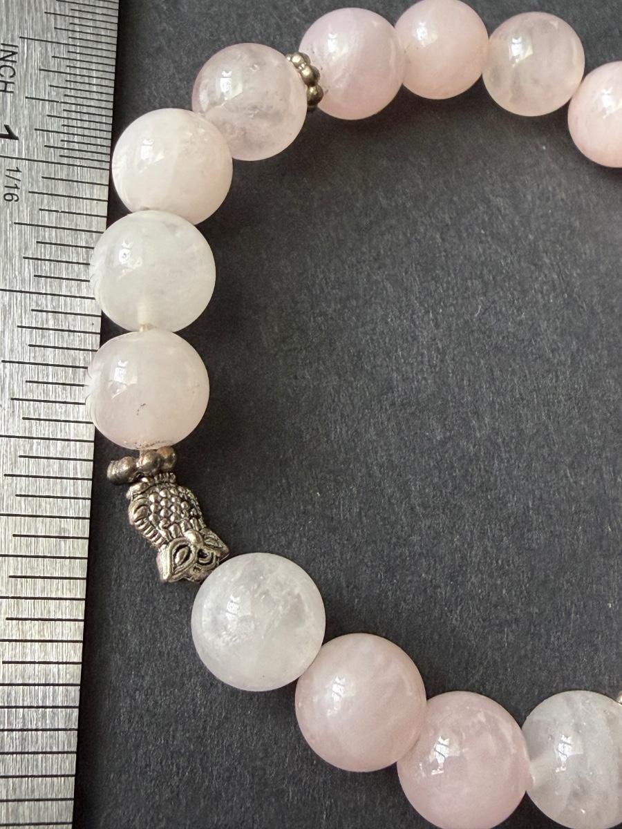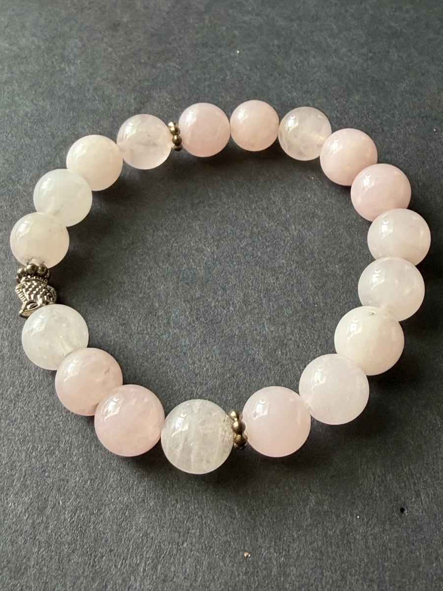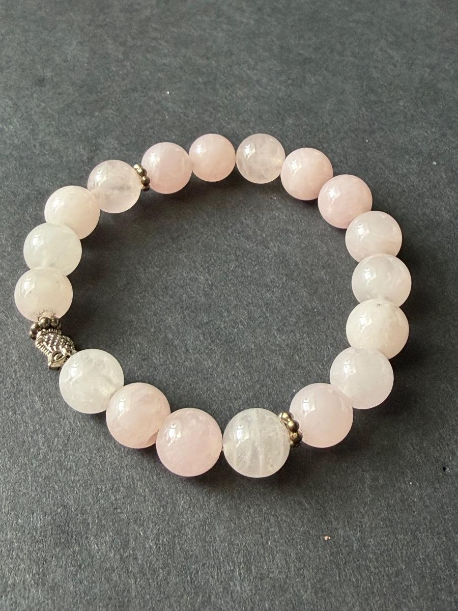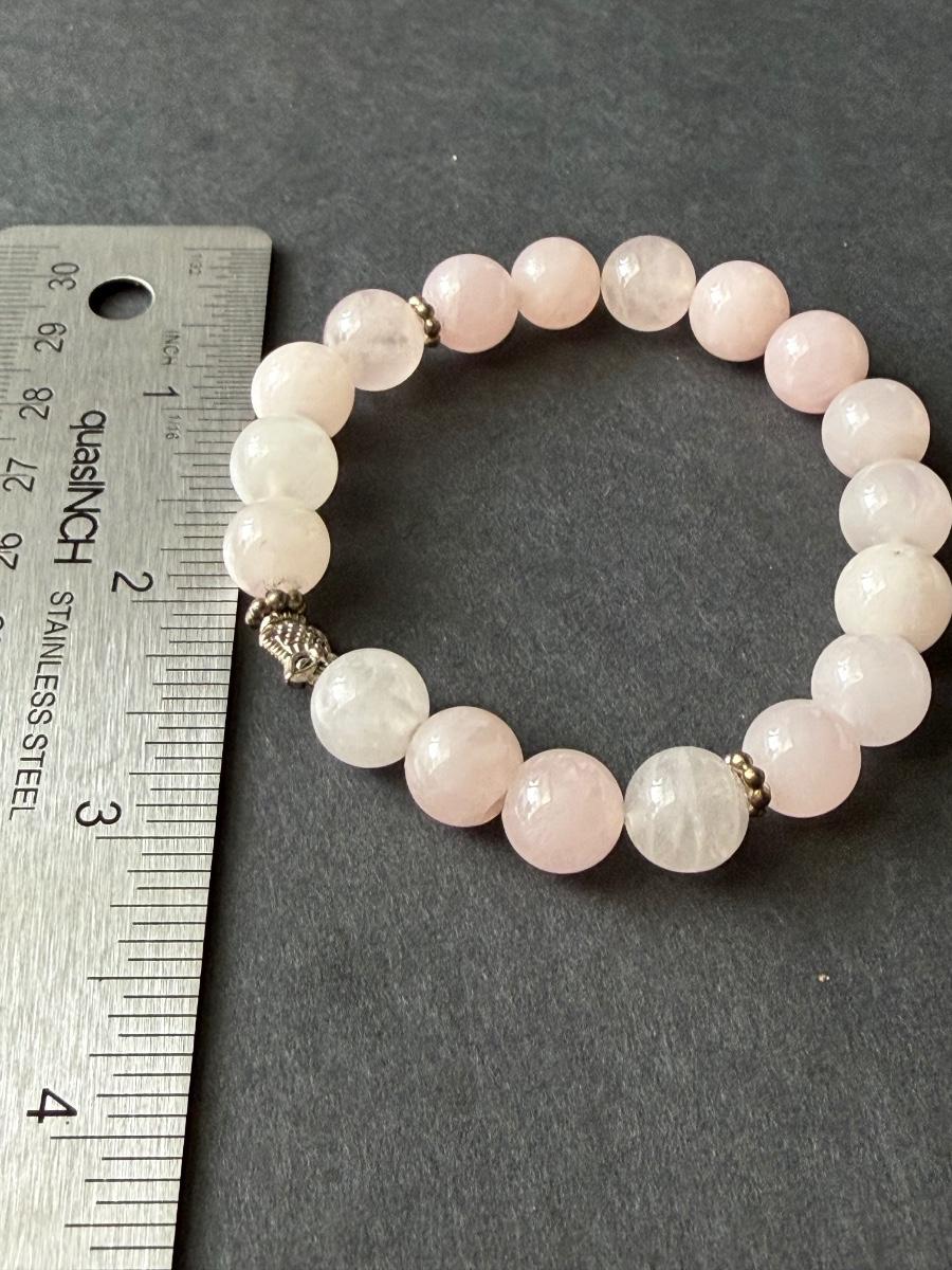 gemstone stretch bracelet featuring light pink glass beads and silver charm accents.
