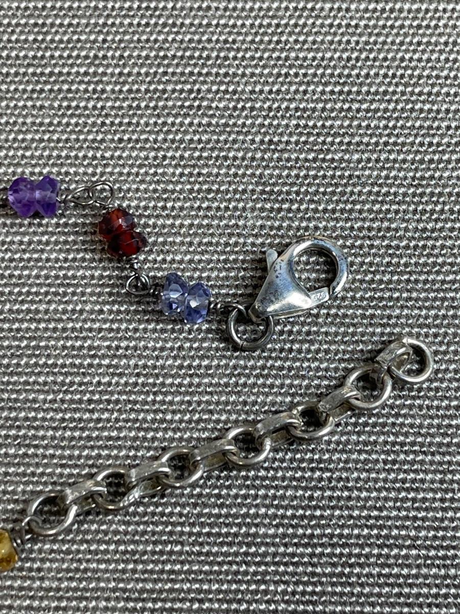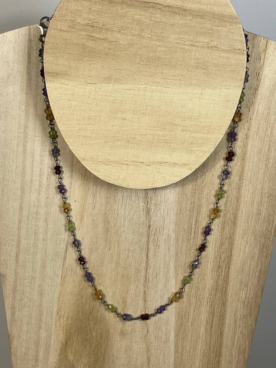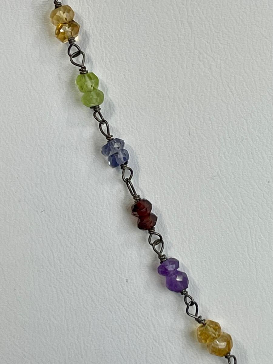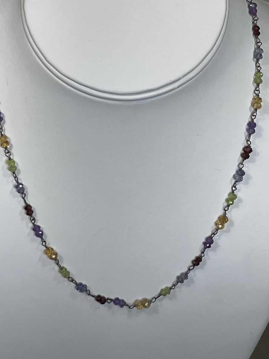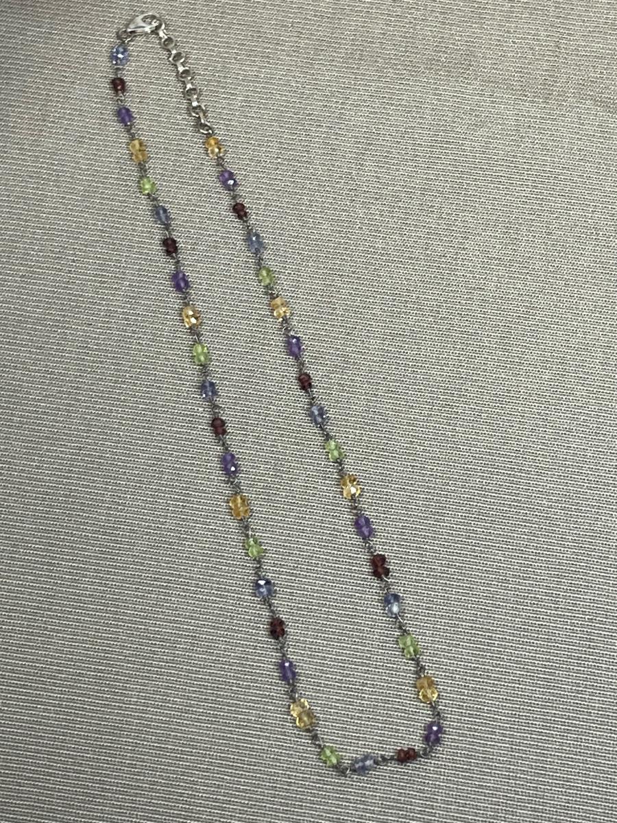 16-18” with peridot, amethyst, citrine, garnet and iolite beads. Dainty