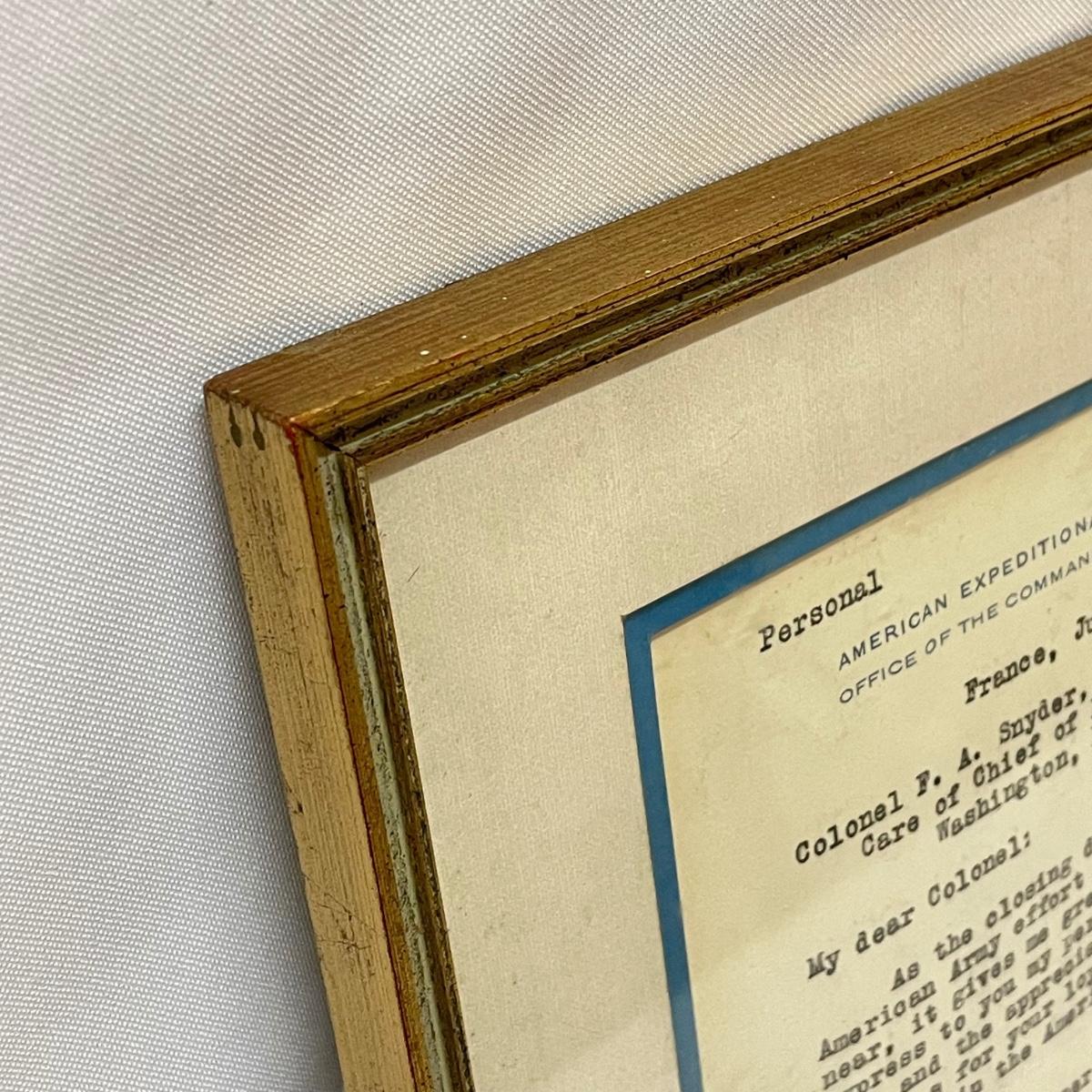 Lot appears to be a WWI letter of appreciation signed by General John J Pershing dated June 7, 1919. There are three spots in the lower section that appear to be on the inner side of the glass and not on the letter. Frame measures 9” x 10.5”H. All sales are final. No returns or refunds. Please bid accordingly. Shipping available.