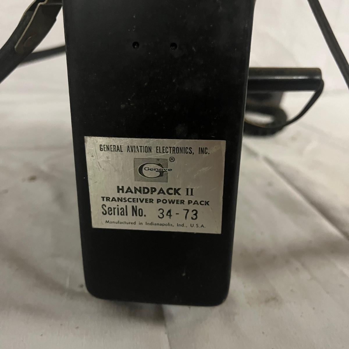 Lot includes a General Aviation Electronics Inc. Handpack II transceiver power pack. With external antenna. Item was not tested. Handpack measures 13” x 2.5” x 8” not including the antenna.
