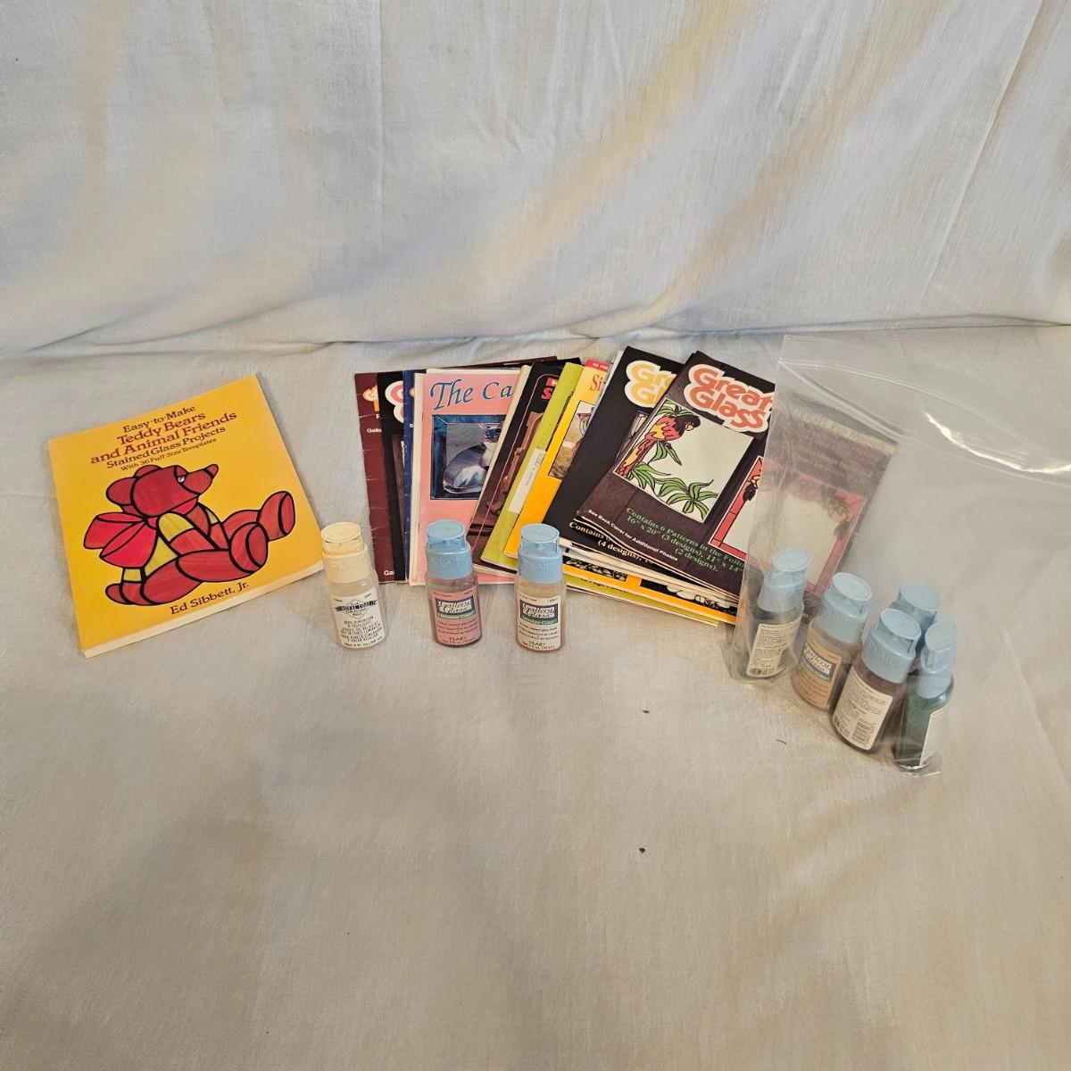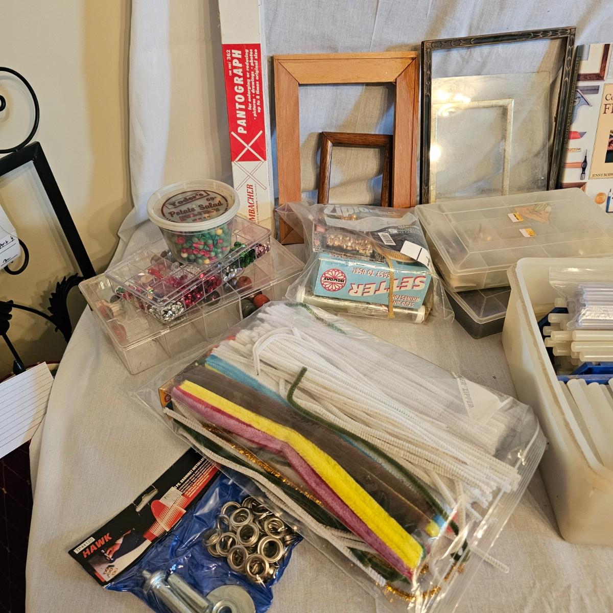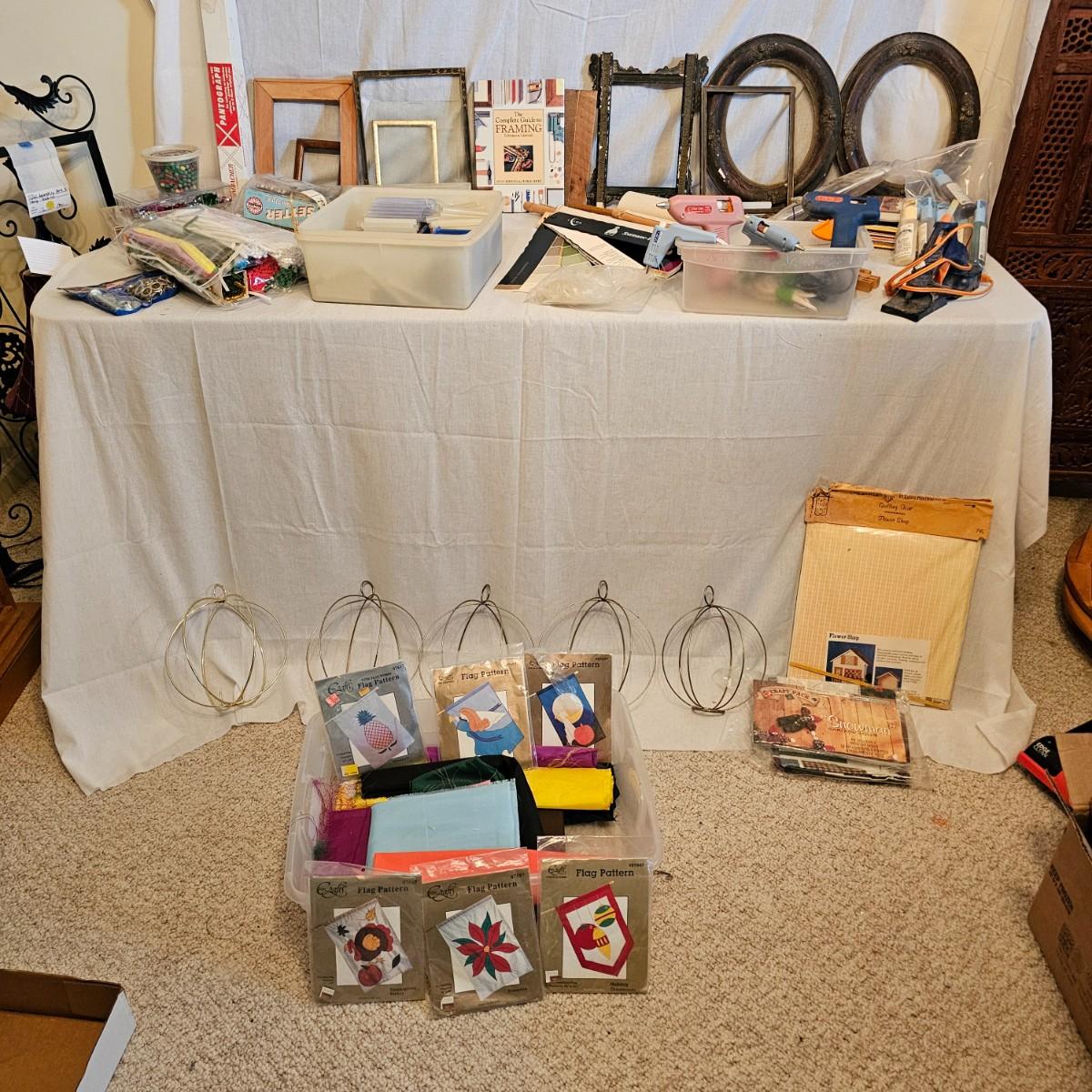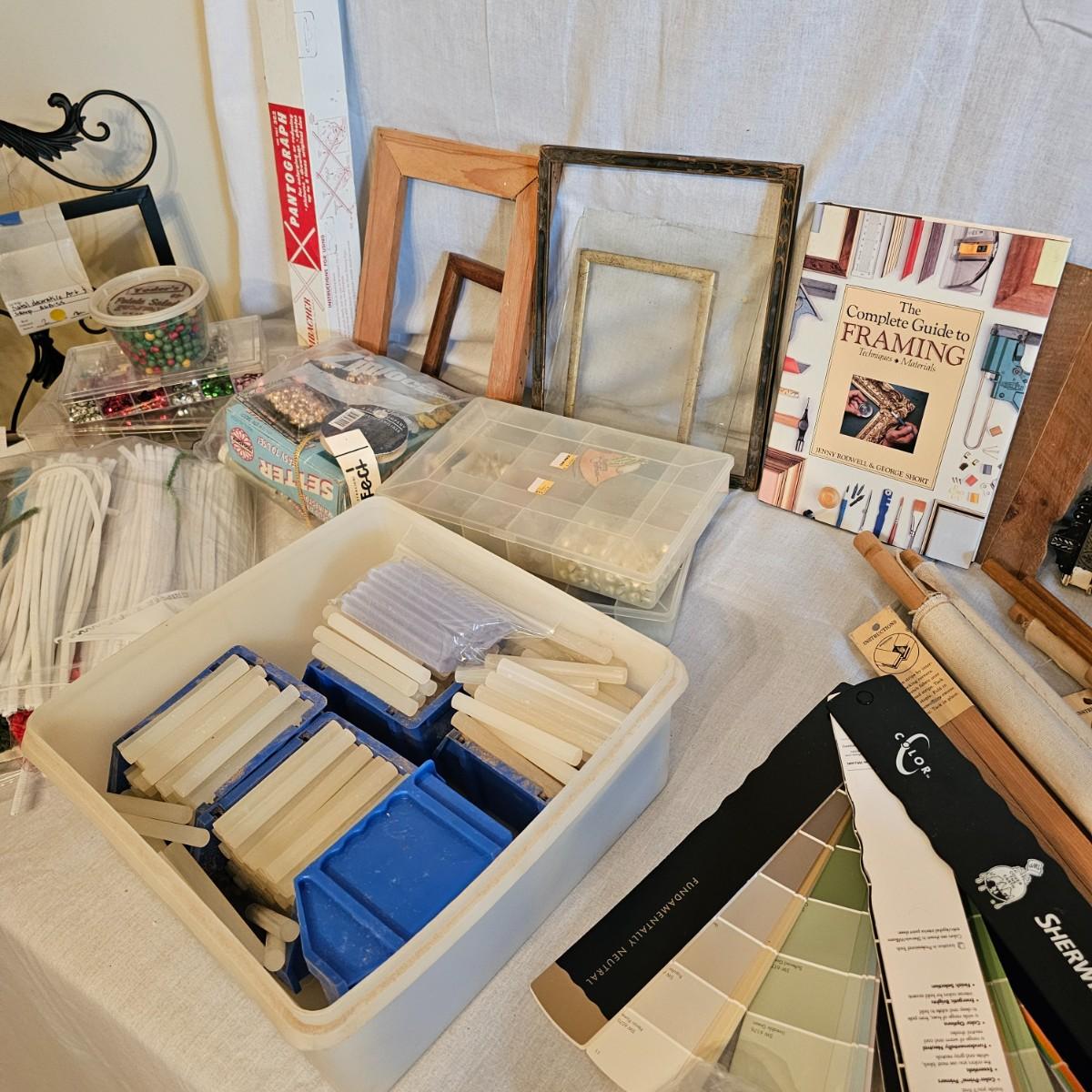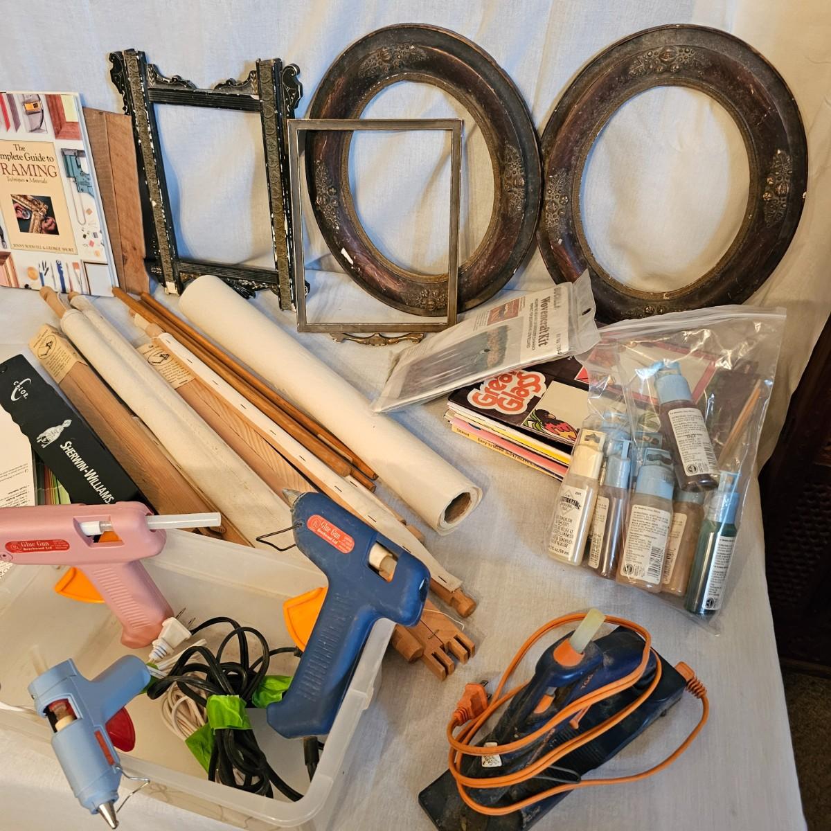 Frames, beads, kits, books and more. Several small wood frames range from 5" x 7"H to 12" x 14.5"H for the vintage oval frames. Wood in varying condition. Pipe cleaners, jewels, grommet setter, four glue guns with extra sticks, all four powered on when plugged in. A Sherwin Williams color book for matching purposes. Patterns for flags includes special outdoor material for construction. Books on Great Glass windows creation and a few bottles of color stain. Round metal spheres measure 8"D x 9.5"H and 9.5"D x 10.5"H. All containers holding items included. See photos for details. Local pickup only.