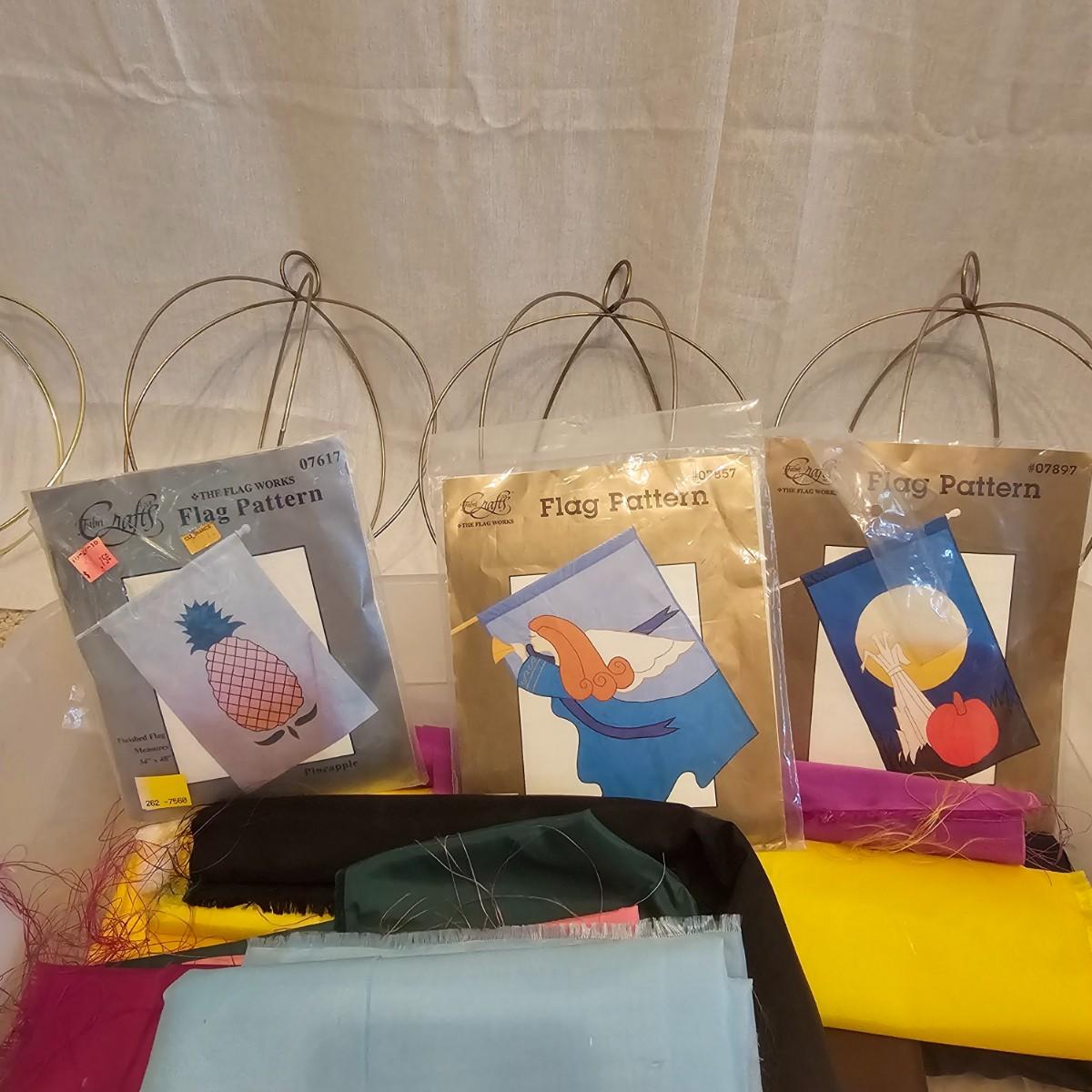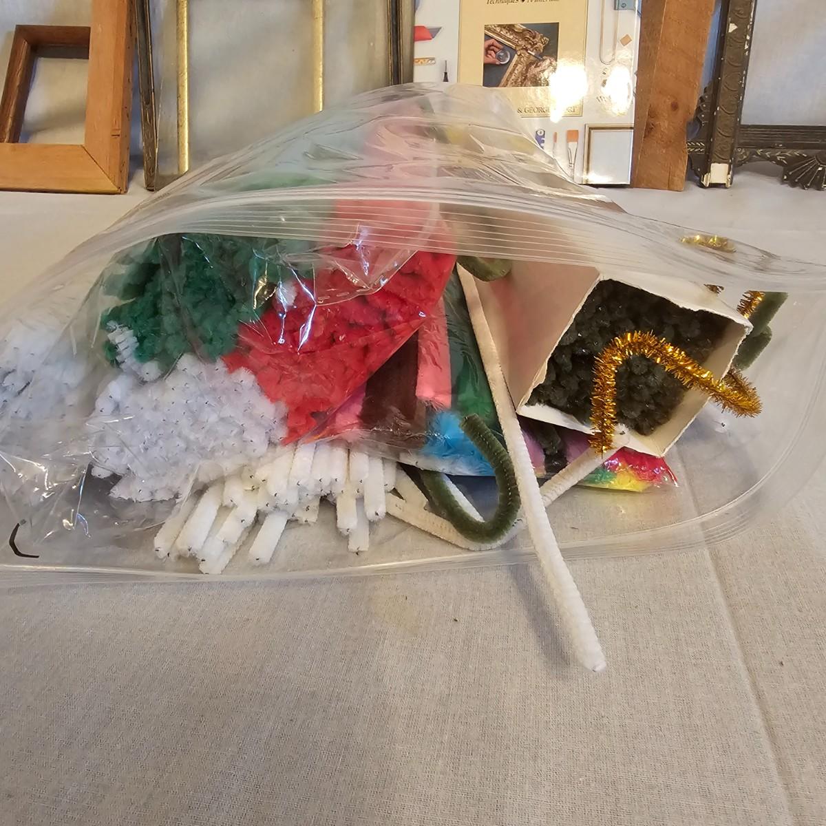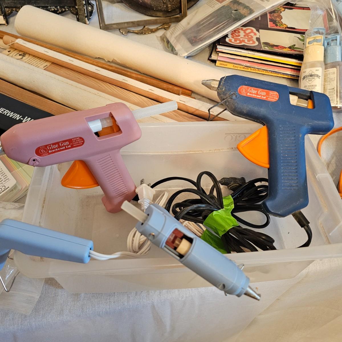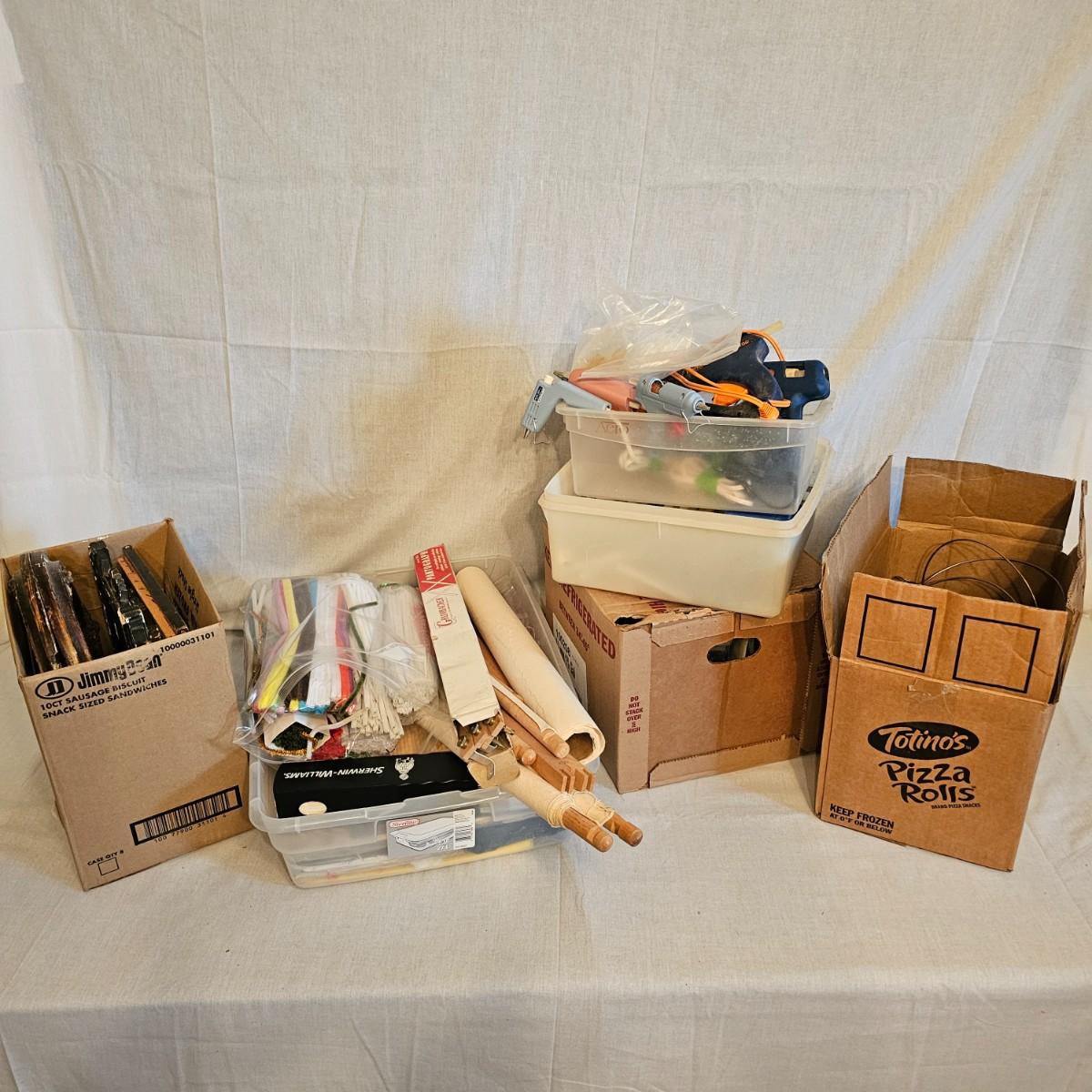 Frames, beads, kits, books and more. Several small wood frames range from 5" x 7"H to 12" x 14.5"H for the vintage oval frames. Wood in varying condition. Pipe cleaners, jewels, grommet setter, four glue guns with extra sticks, all four powered on when plugged in. A Sherwin Williams color book for matching purposes. Patterns for flags includes special outdoor material for construction. Books on Great Glass windows creation and a few bottles of color stain. Round metal spheres measure 8"D x 9.5"H and 9.5"D x 10.5"H. All containers holding items included. See photos for details. Local pickup only.