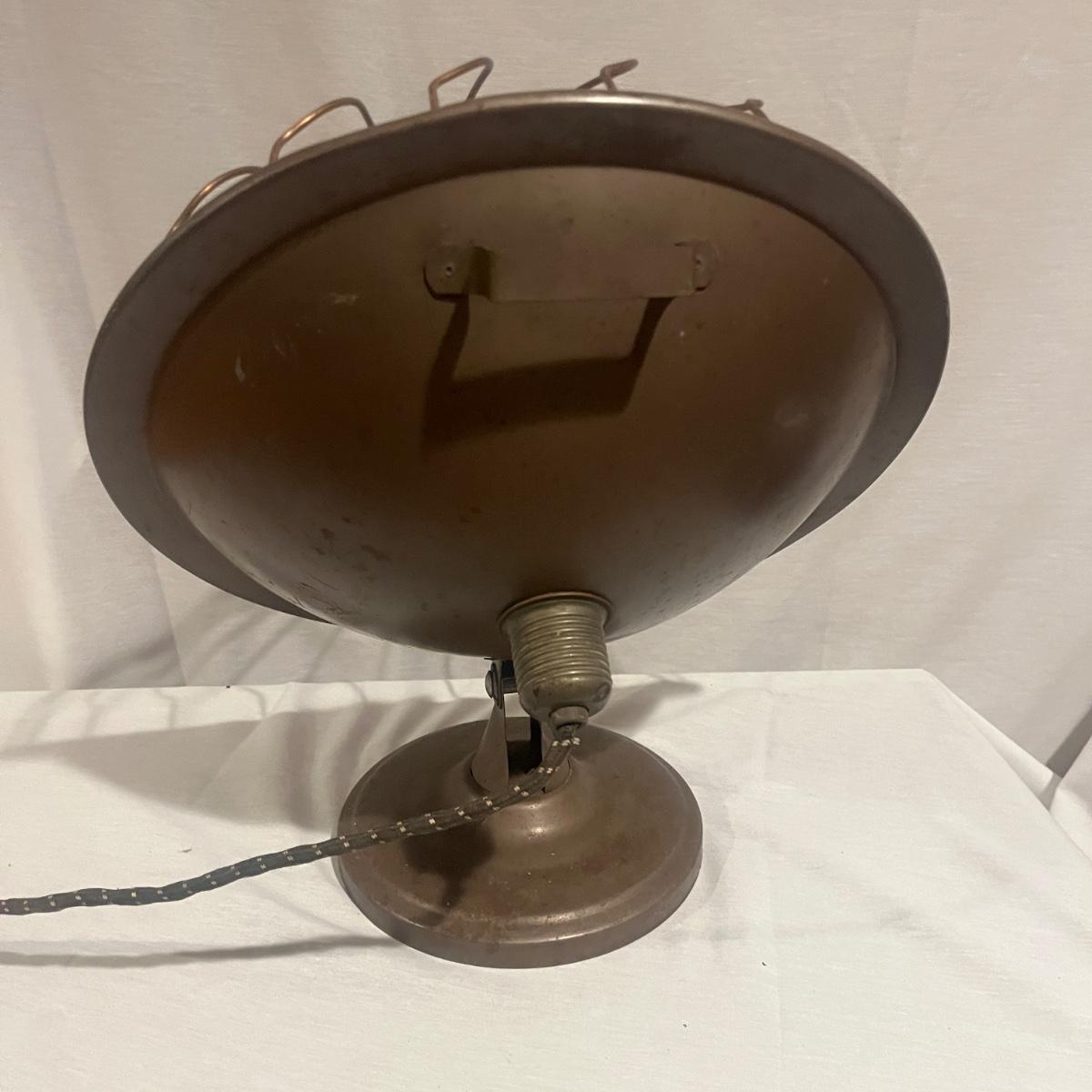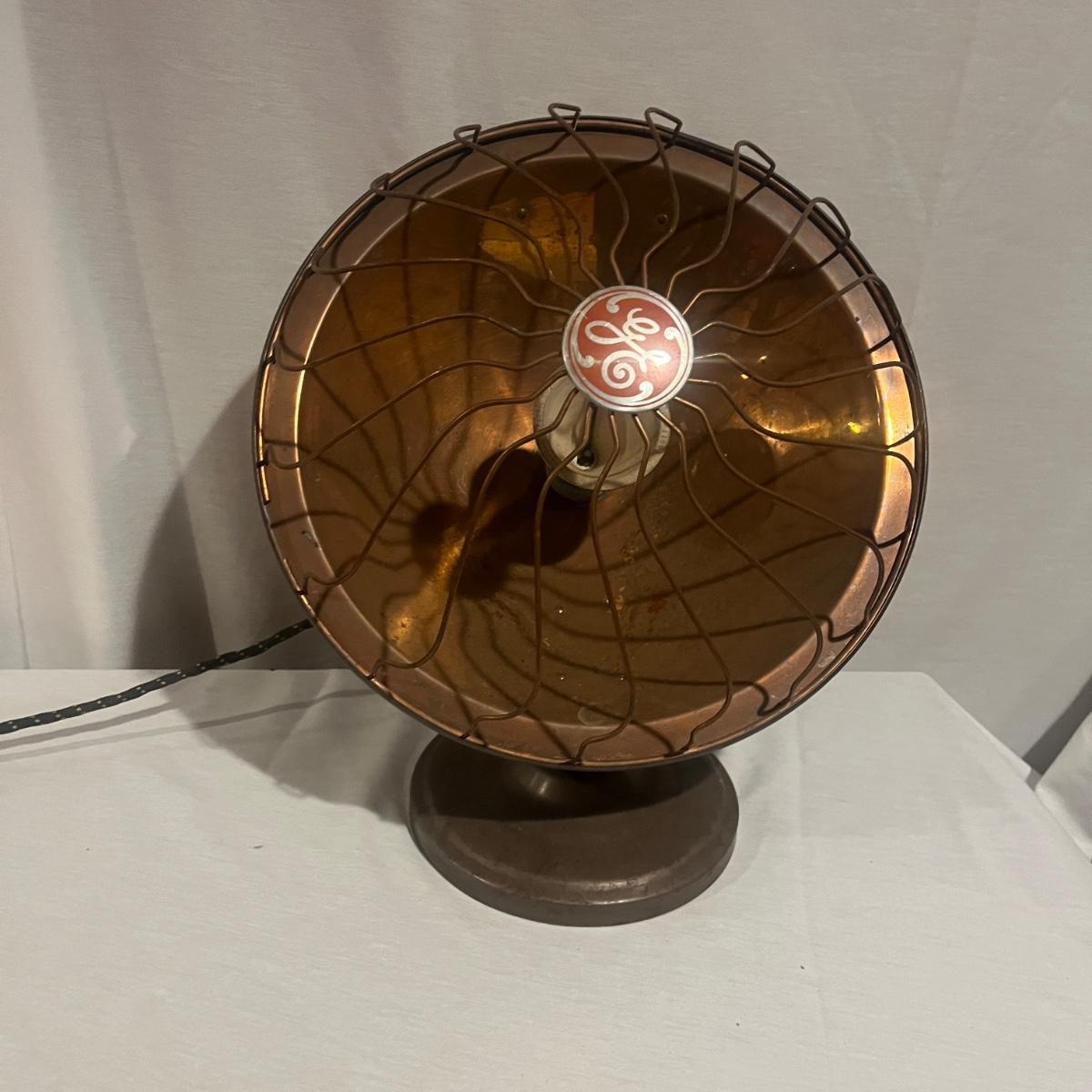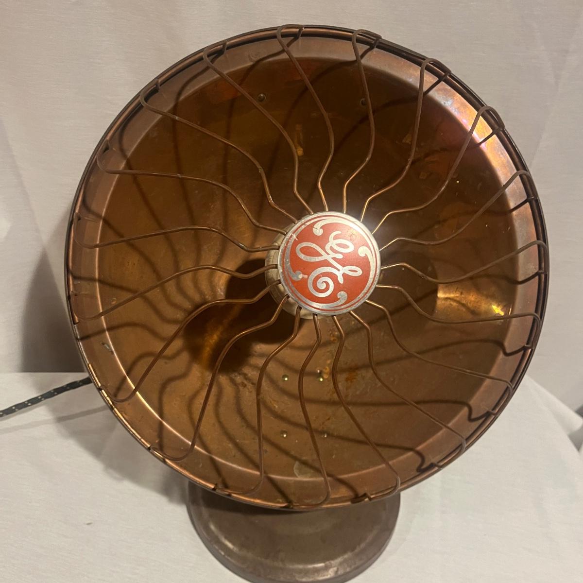 Lot includes a General Electric copper sun disc electric heater that measures 15”D x 16”H. Heater powered on when plugged in.