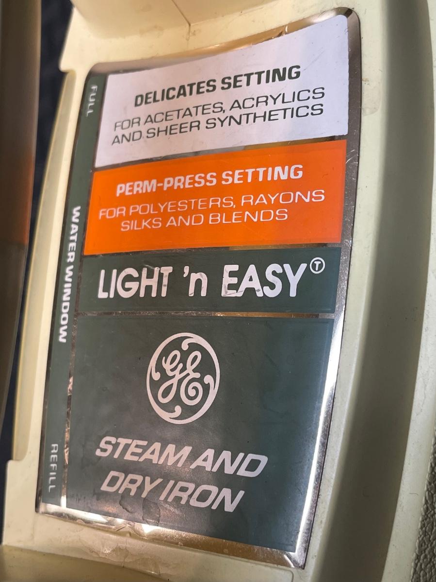 The Iron is in great condition but is untested to see if it works. The delicates setting is made for acetates, acrylics and sheer synthetics. The perm-press setting is for polyesters, rayons, silks, and blends. This item was made in Singapore.
