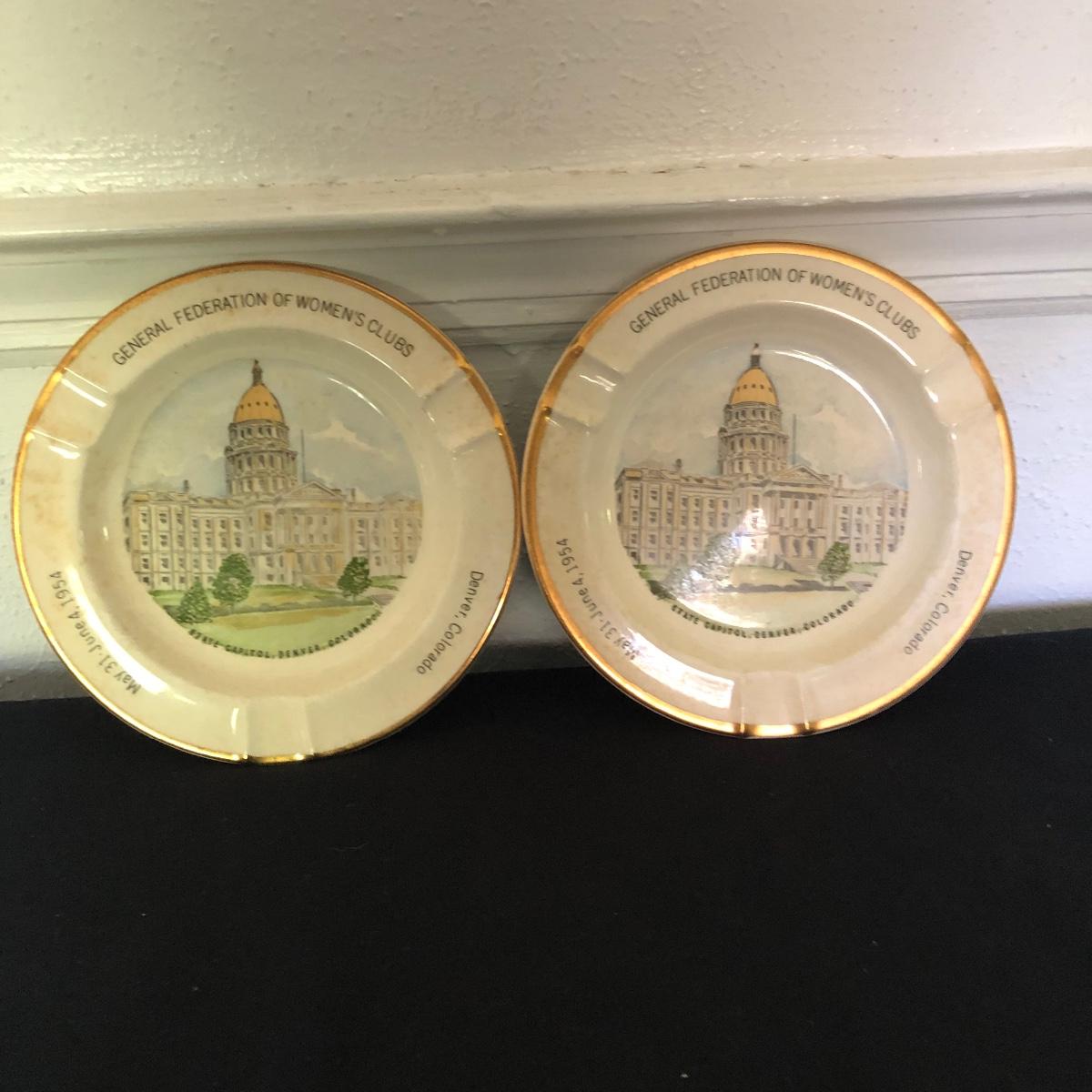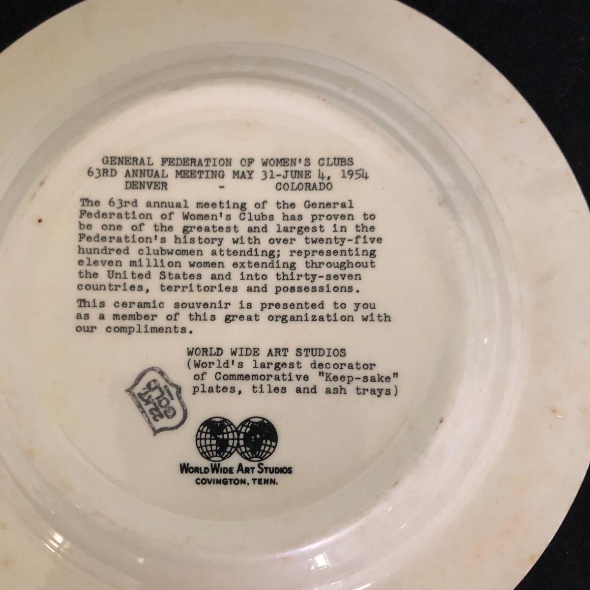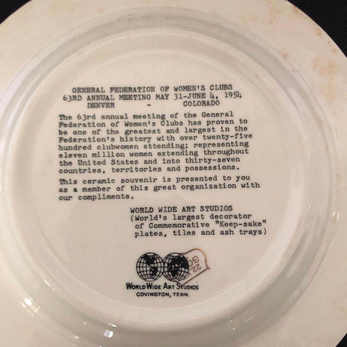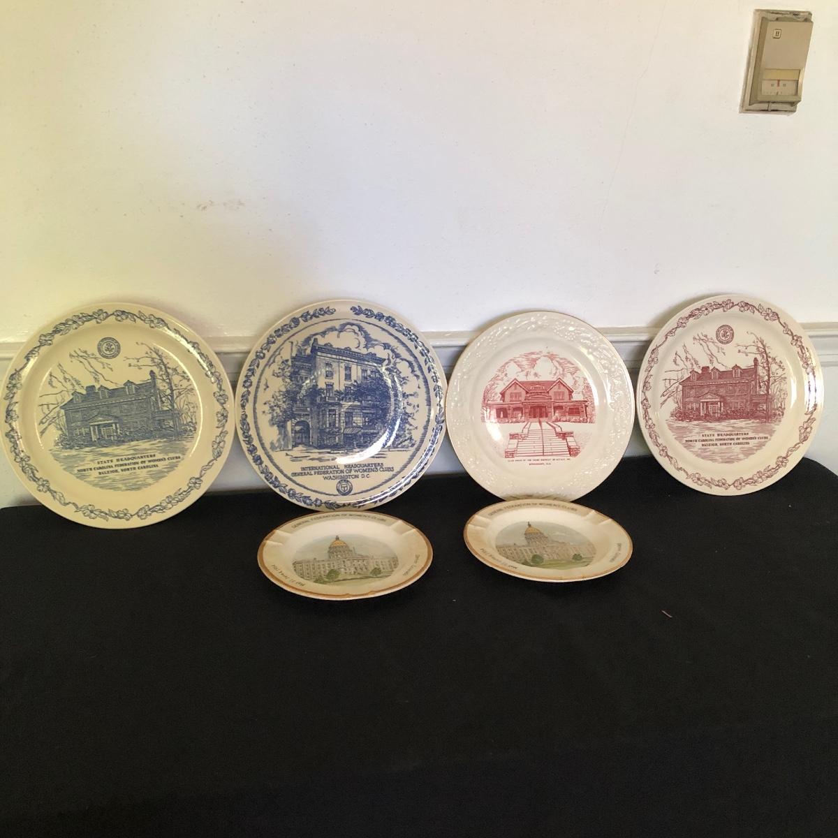 Lot includes General Federation of Women's Club plates that feature two 63rd annual meeting ashtrays, twin state headquarter plates, international headquarters plate and BBC a clubhouse plate. Largest plate measures 10.5”D.