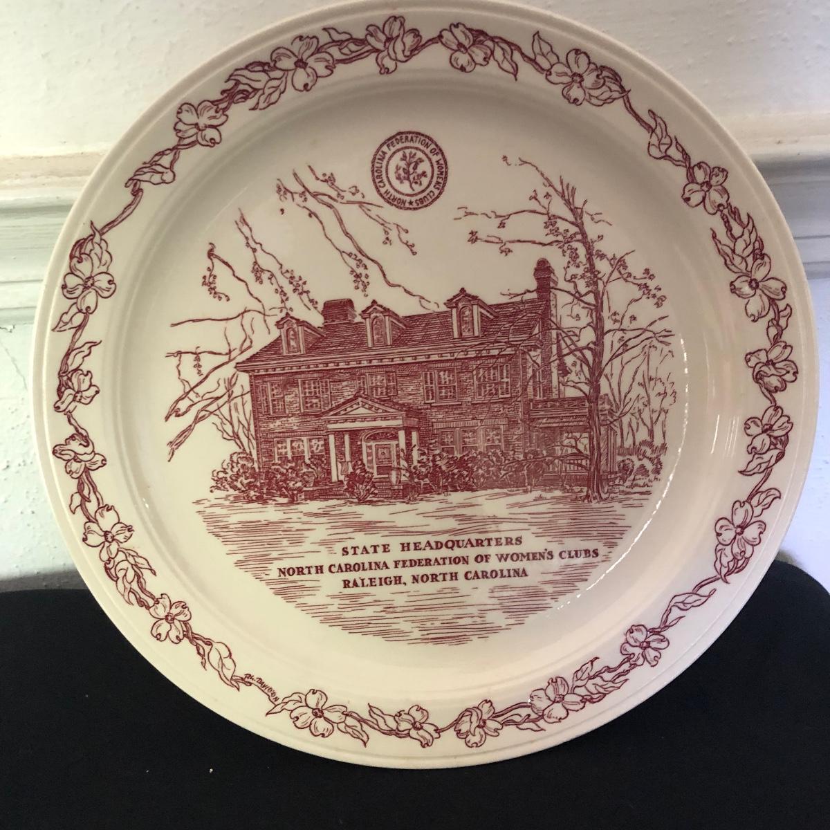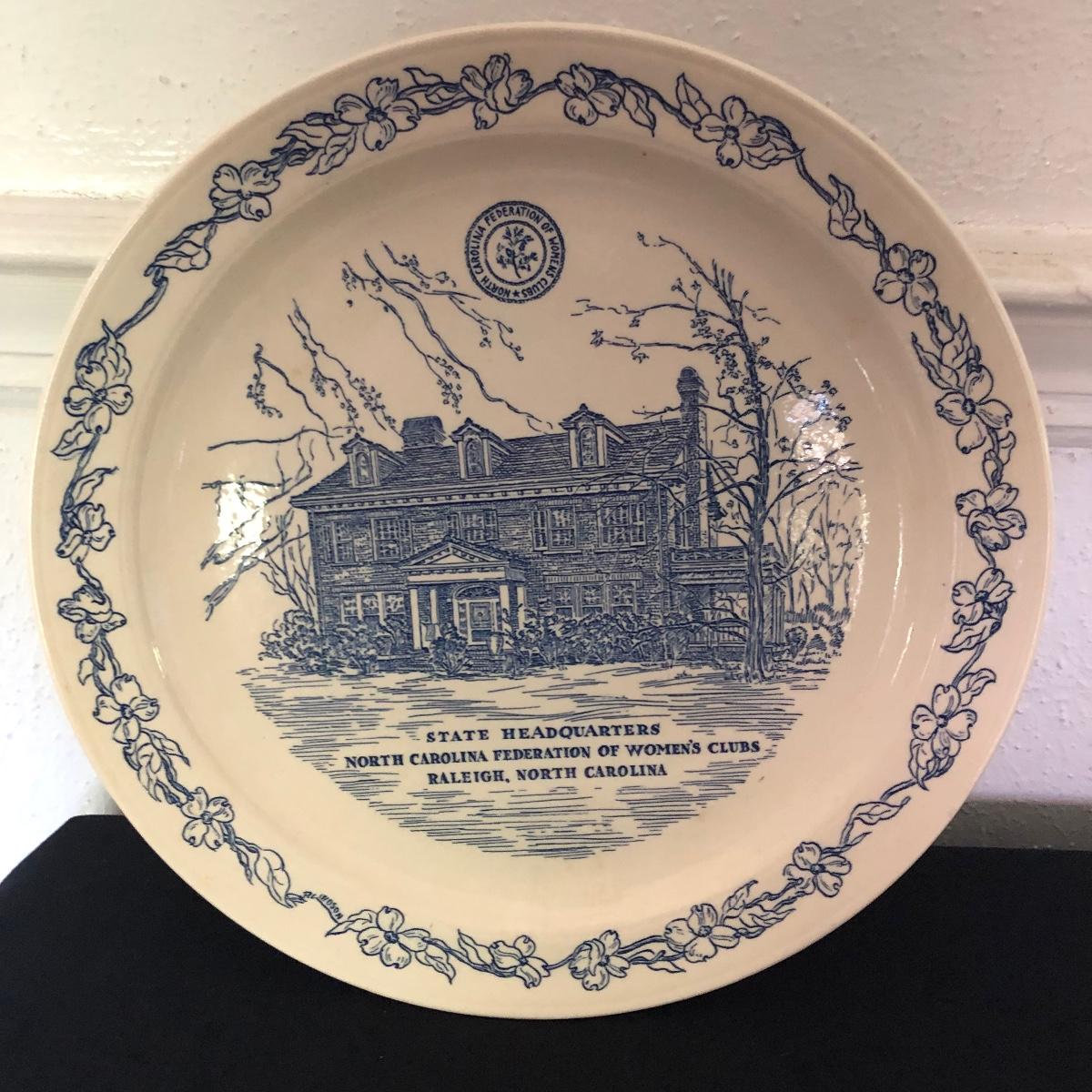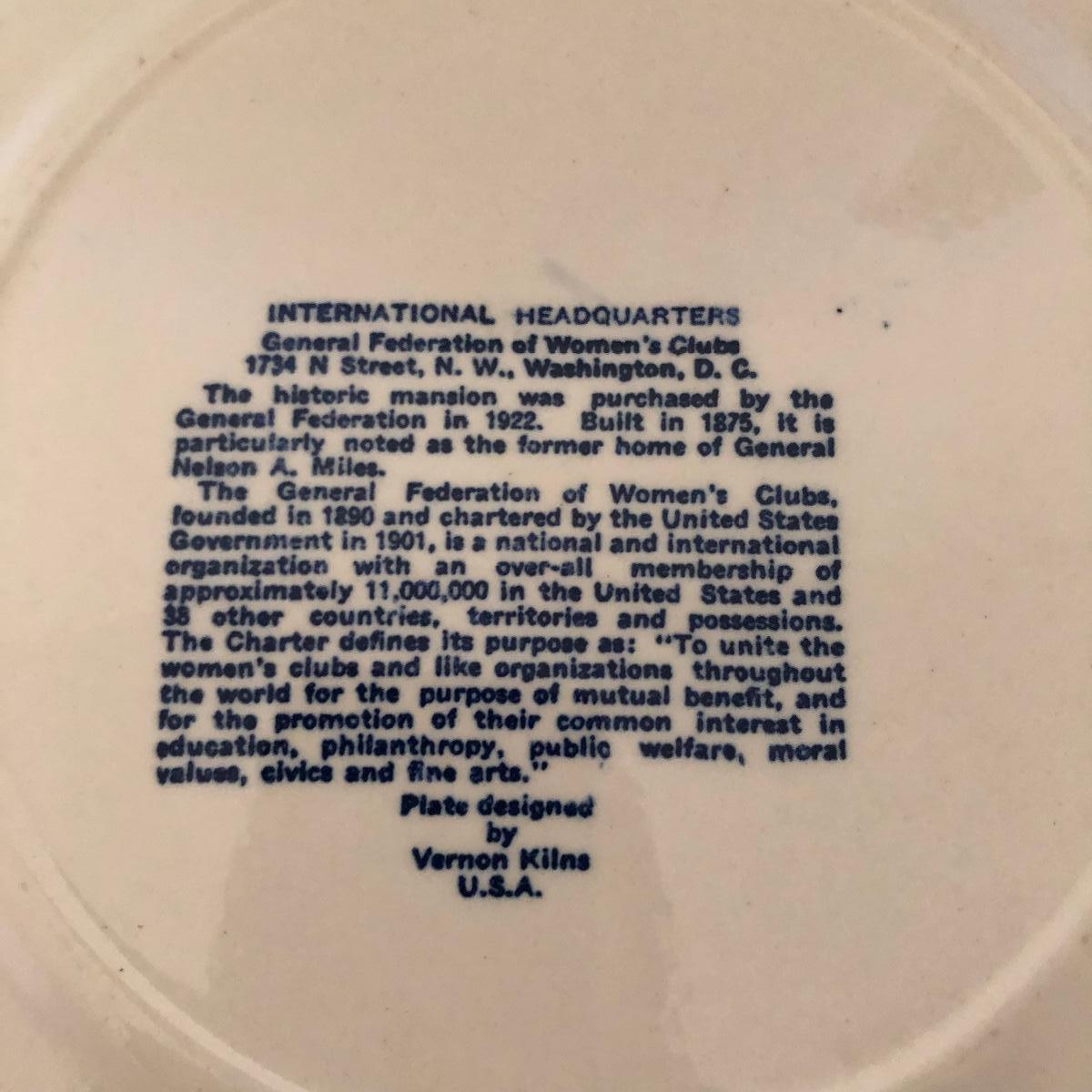 Lot includes General Federation of Women's Club plates that feature two 63rd annual meeting ashtrays, twin state headquarter plates, international headquarters plate and BBC a clubhouse plate. Largest plate measures 10.5”D.