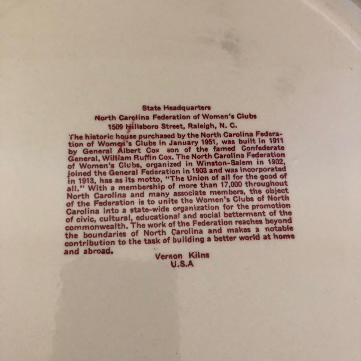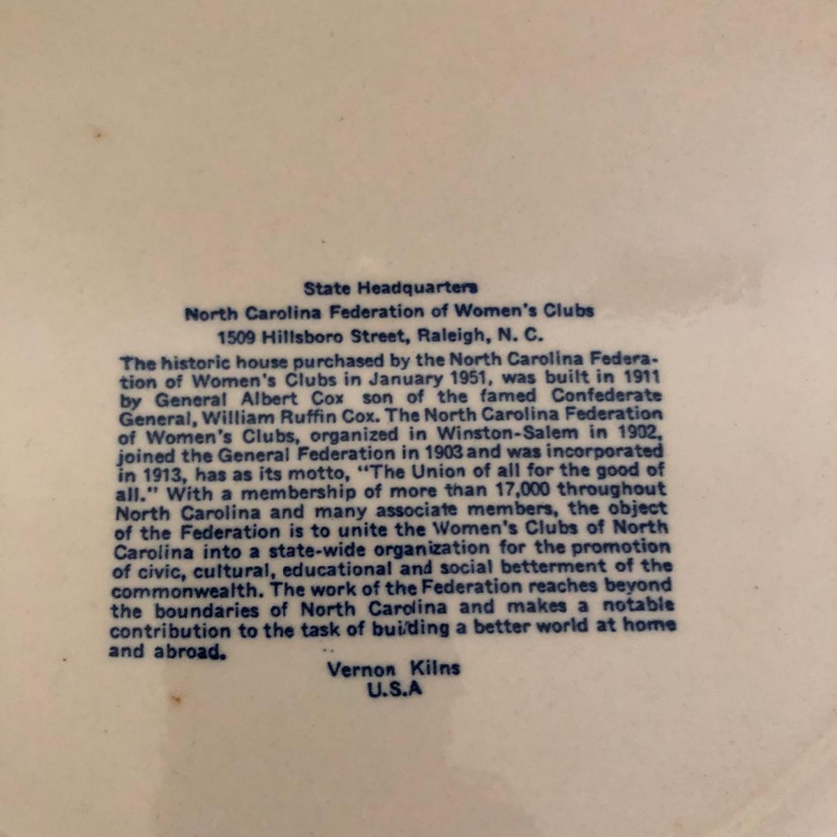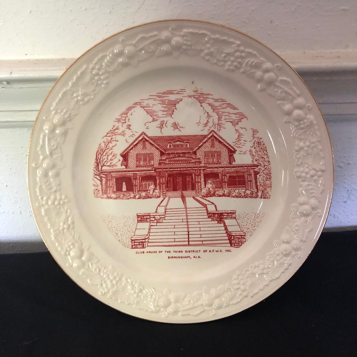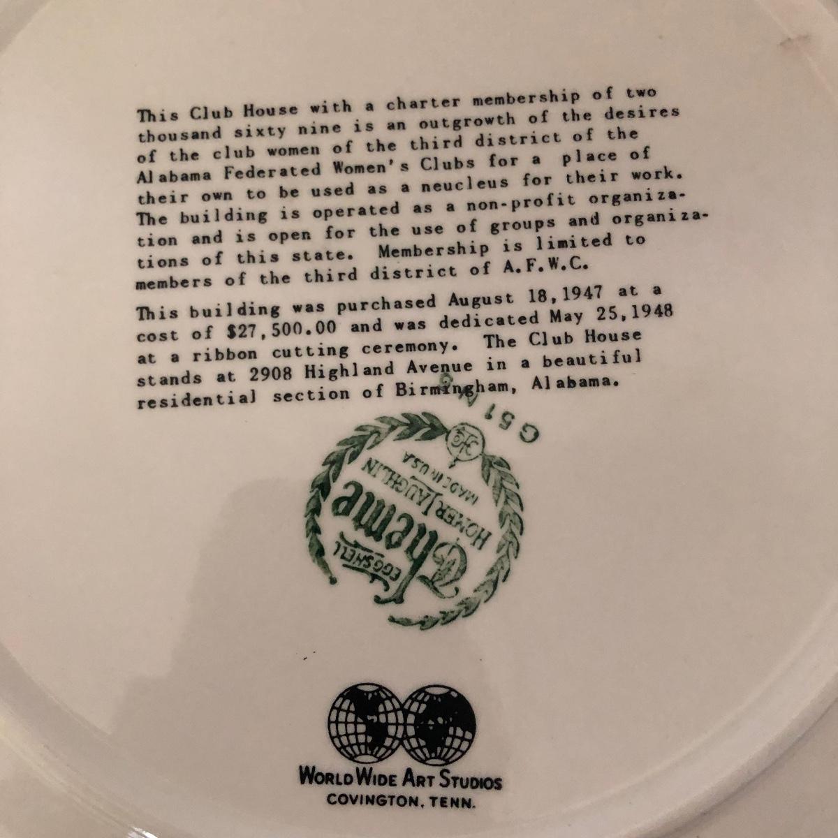 Lot includes General Federation of Women's Club plates that feature two 63rd annual meeting ashtrays, twin state headquarter plates, international headquarters plate and BBC a clubhouse plate. Largest plate measures 10.5”D.