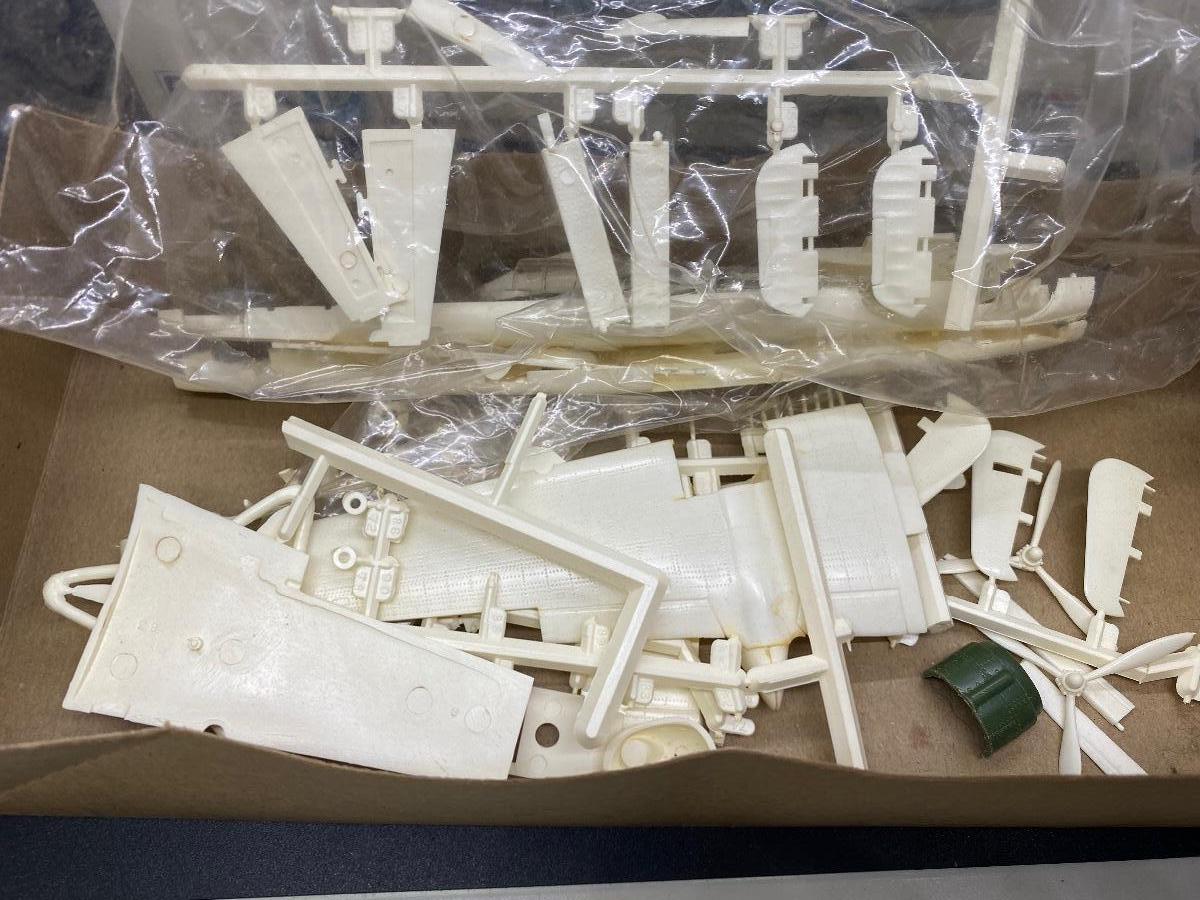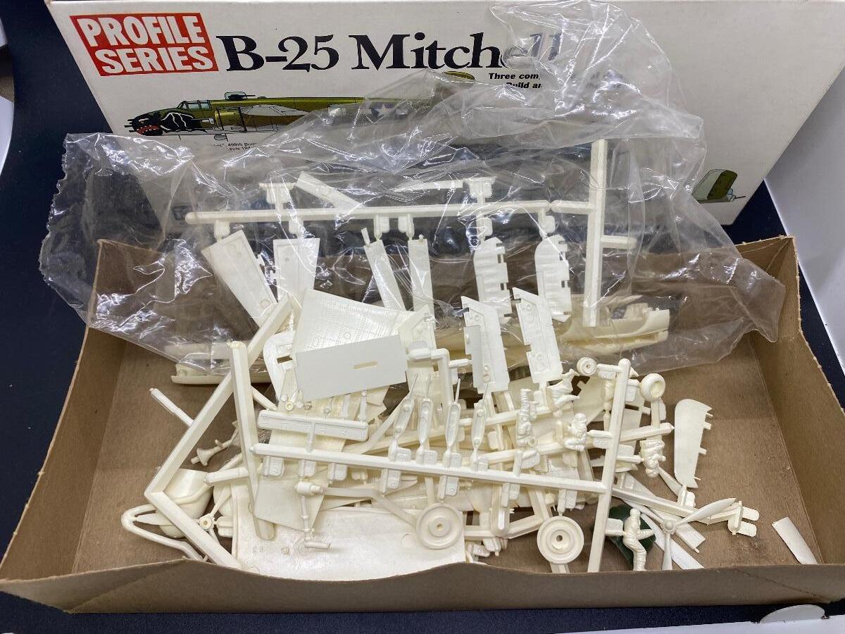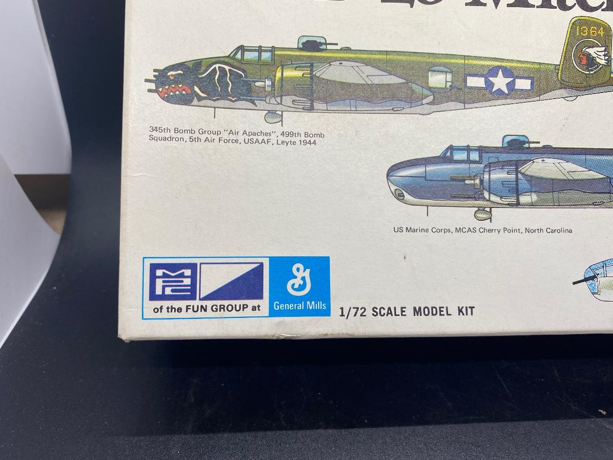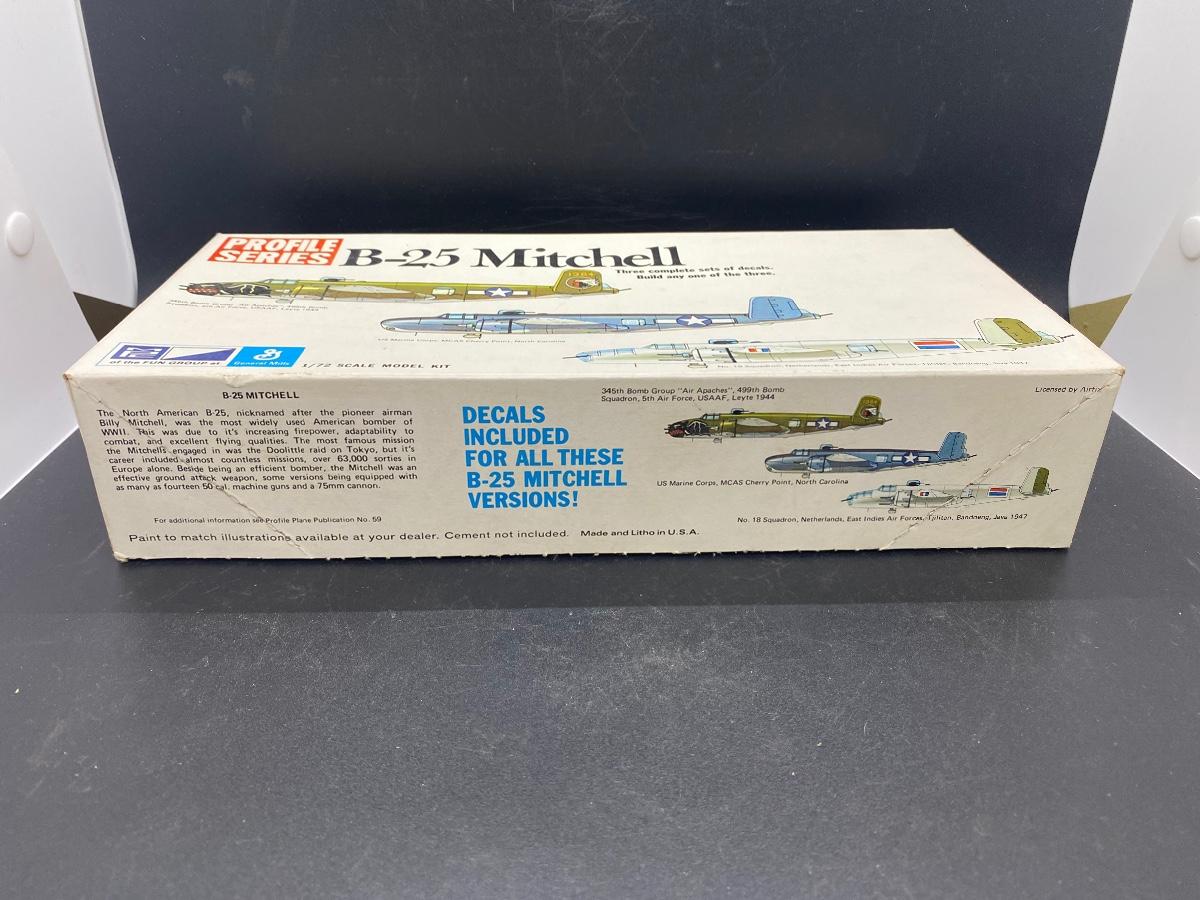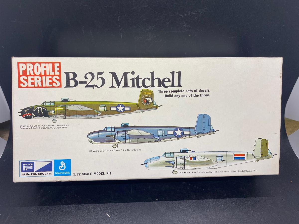 General Mills Profile Series B-25 Mitchell scale model fighter plane kit. 1/72 scale size. One plane with three sticker sets so the builder could chose what plane they wanted. Set has been opened and pieces separated. Not sure how complete it may or may not be. Box has great graphics for display.