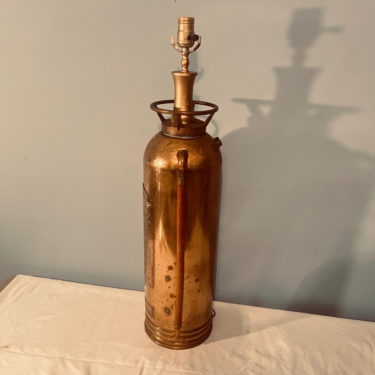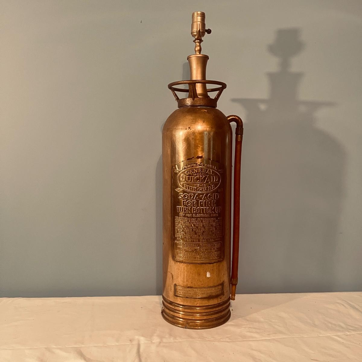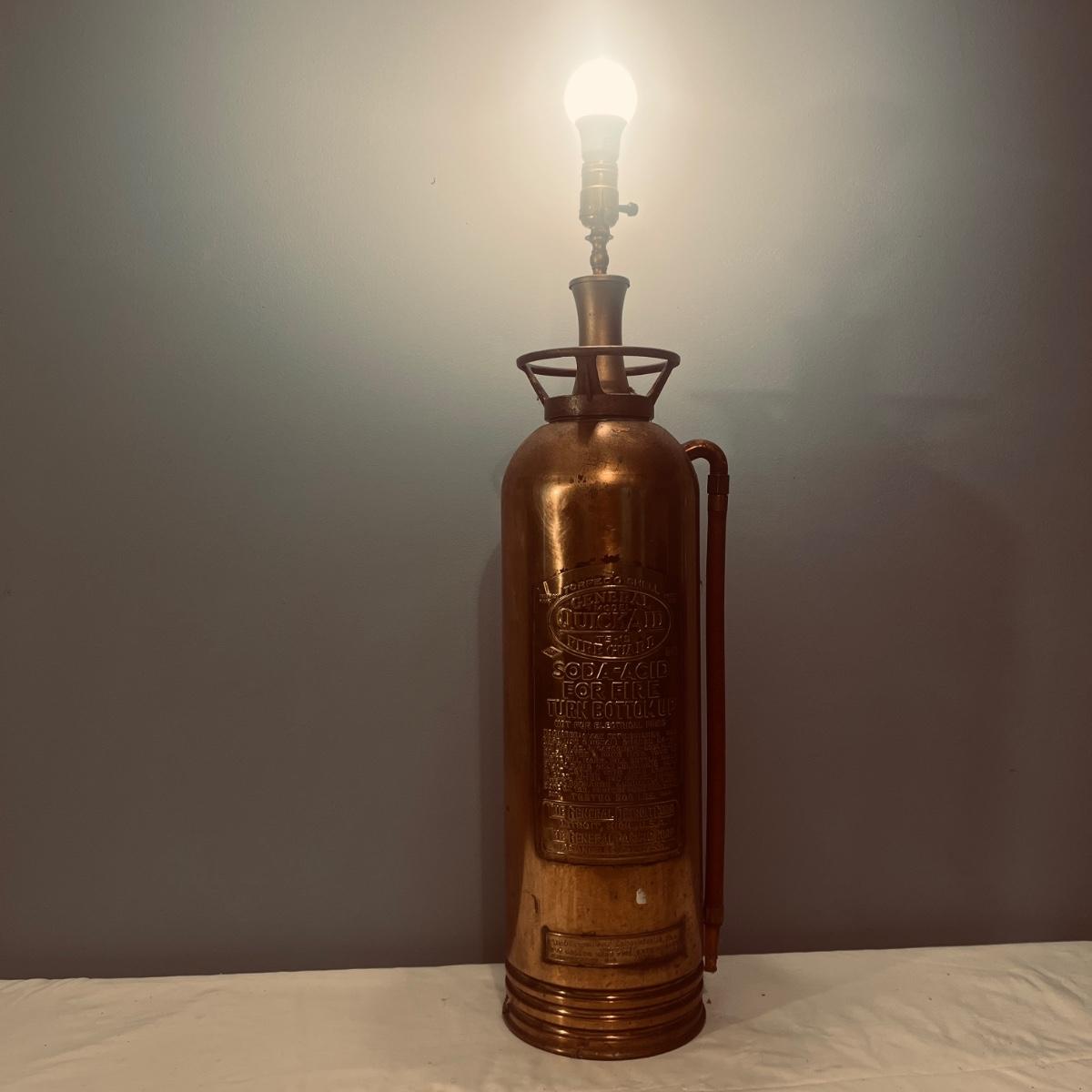 Lot includes a General Quick Aid brass fire extinguisher lamp that powered on when plugged In. Lamp measures 7.25”D x 30”H.