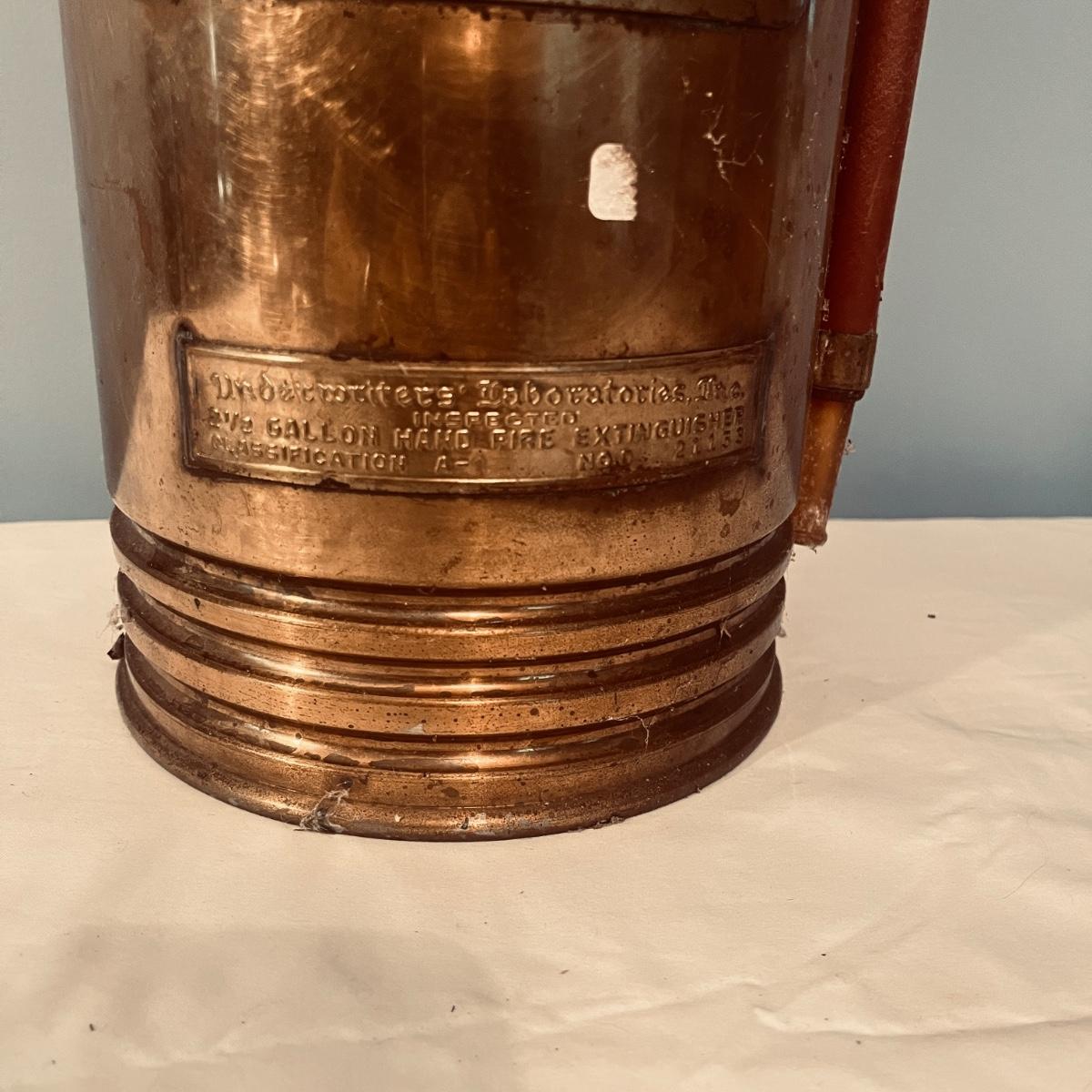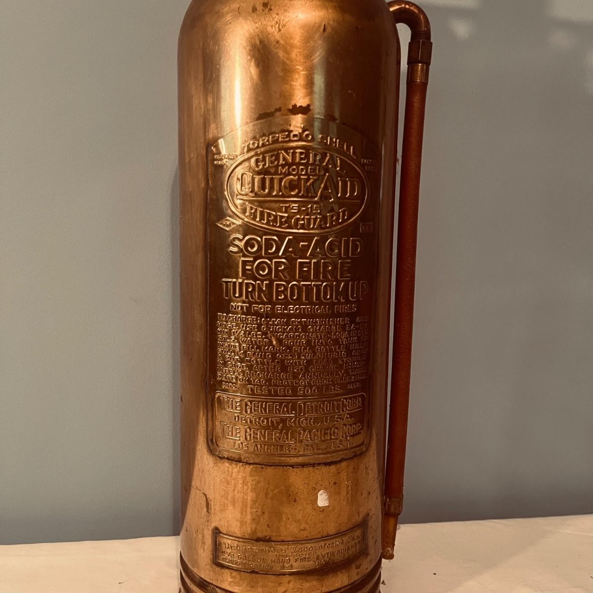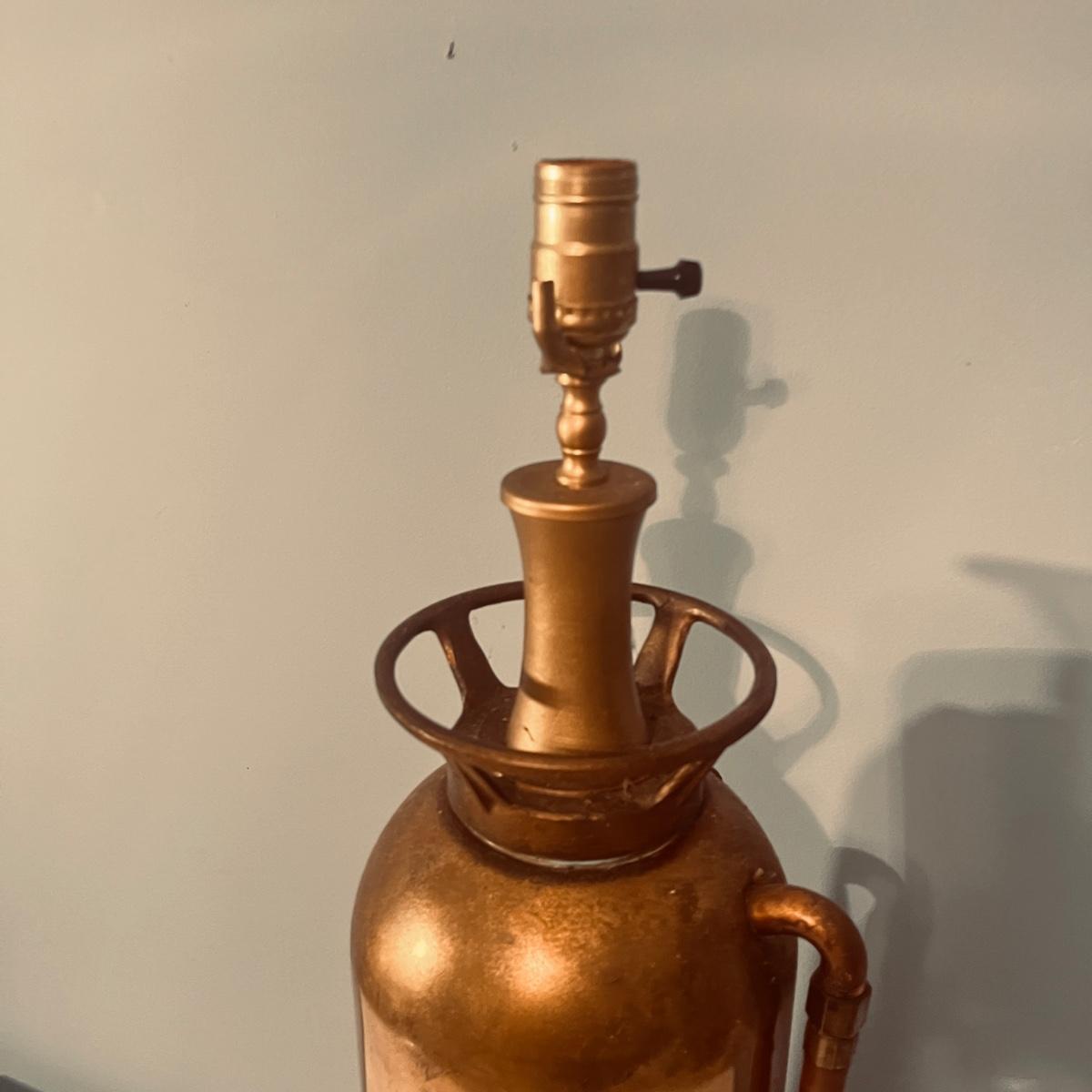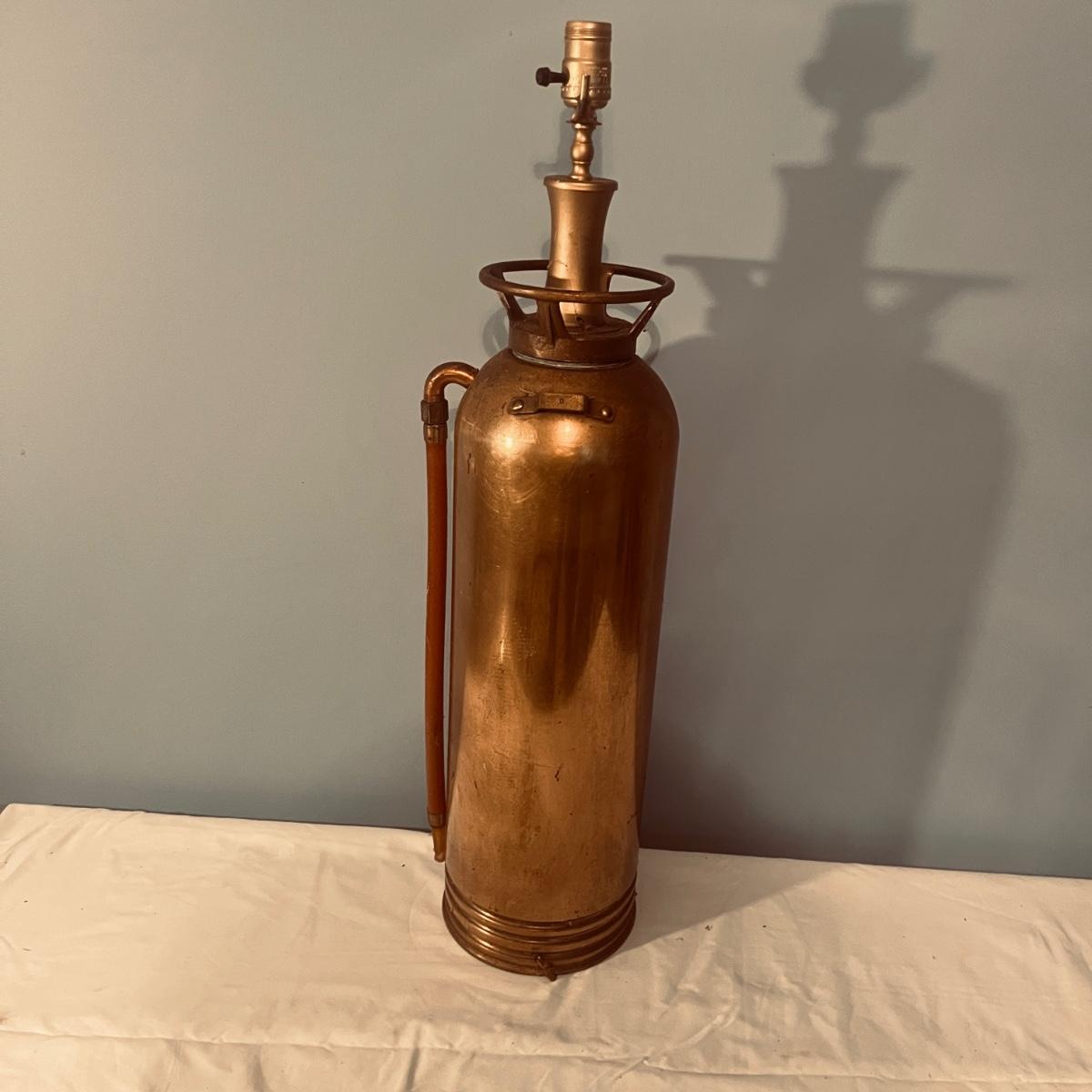 Lot includes a General Quick Aid brass fire extinguisher lamp that powered on when plugged In. Lamp measures 7.25”D x 30”H.