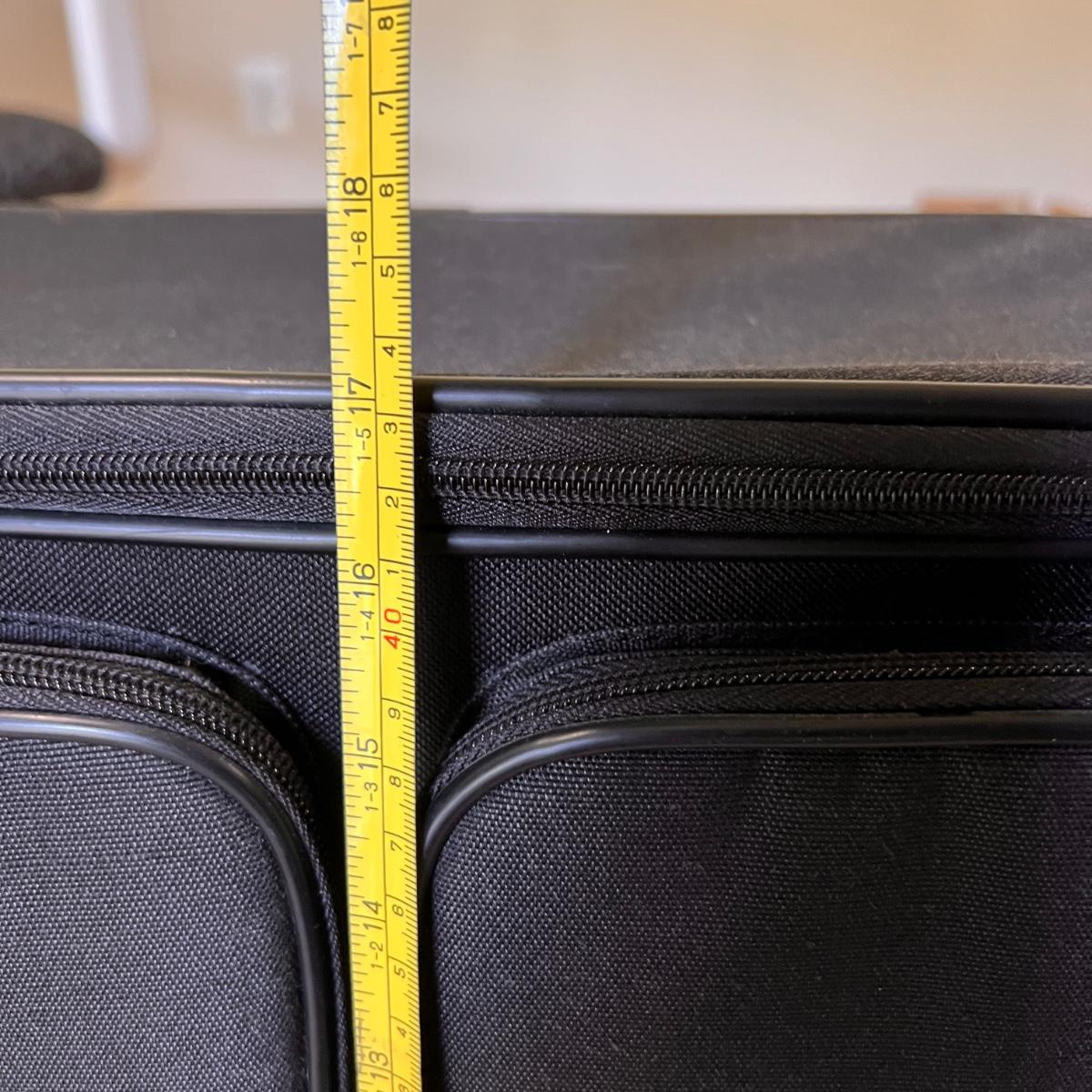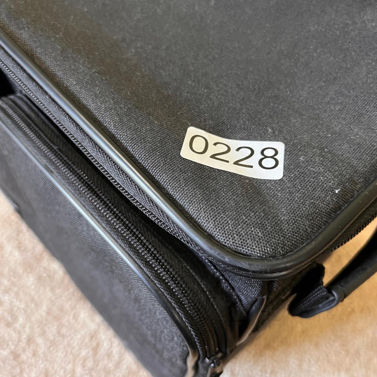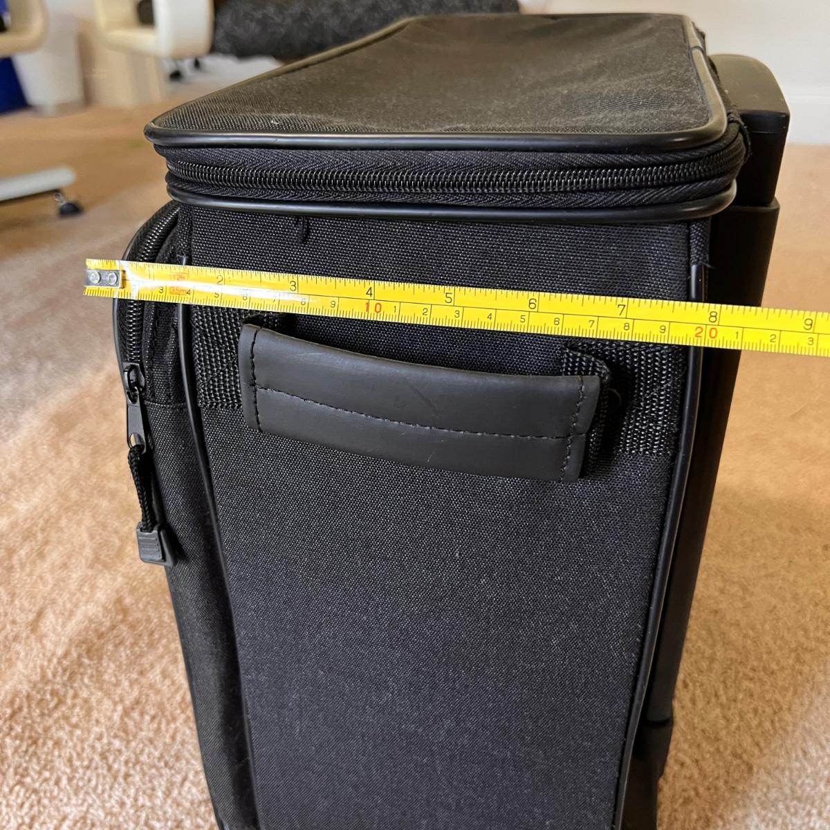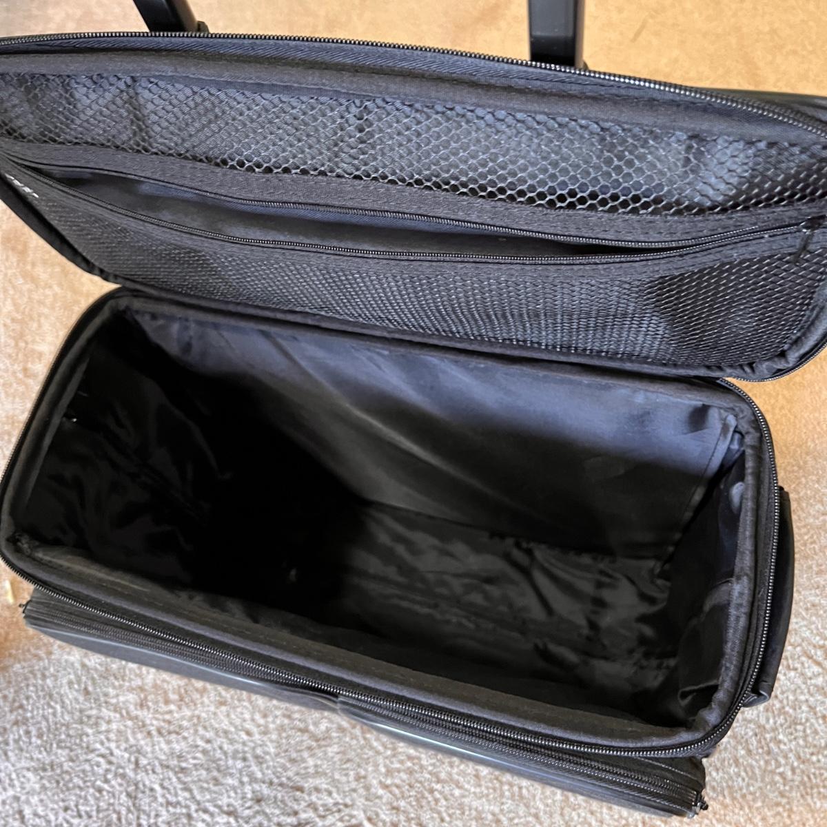 Crafting rolling bag with retractable handle, 2 side handles, 2 front organizing zipper compartments, aluminum frame and nylon material, quiet rolling wheels. In great used condition. See pics for measurements.