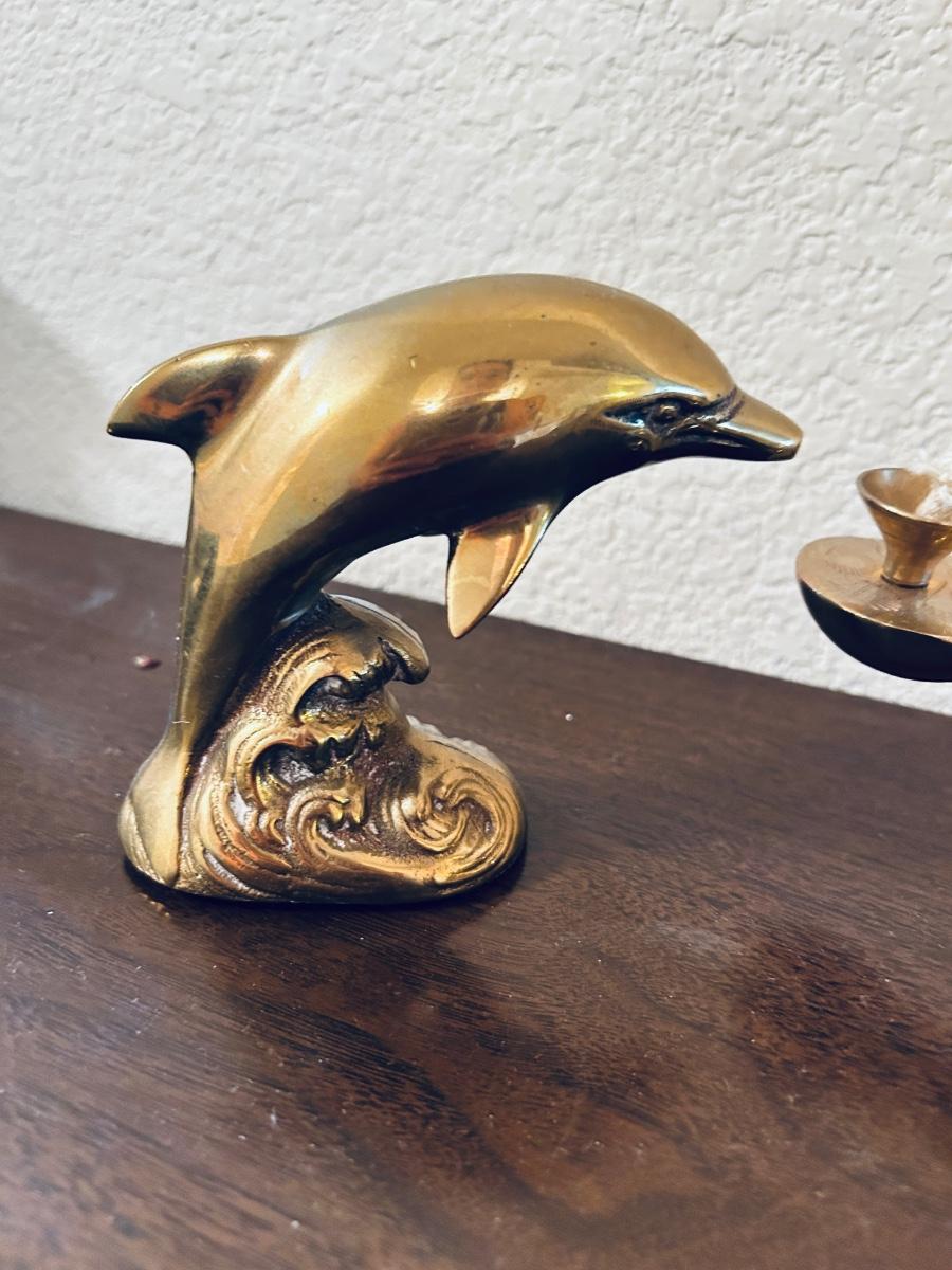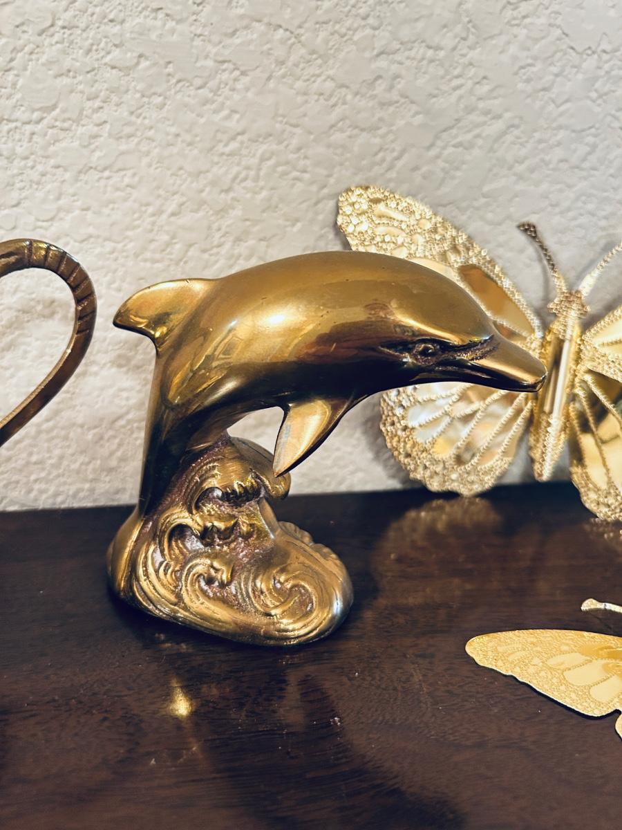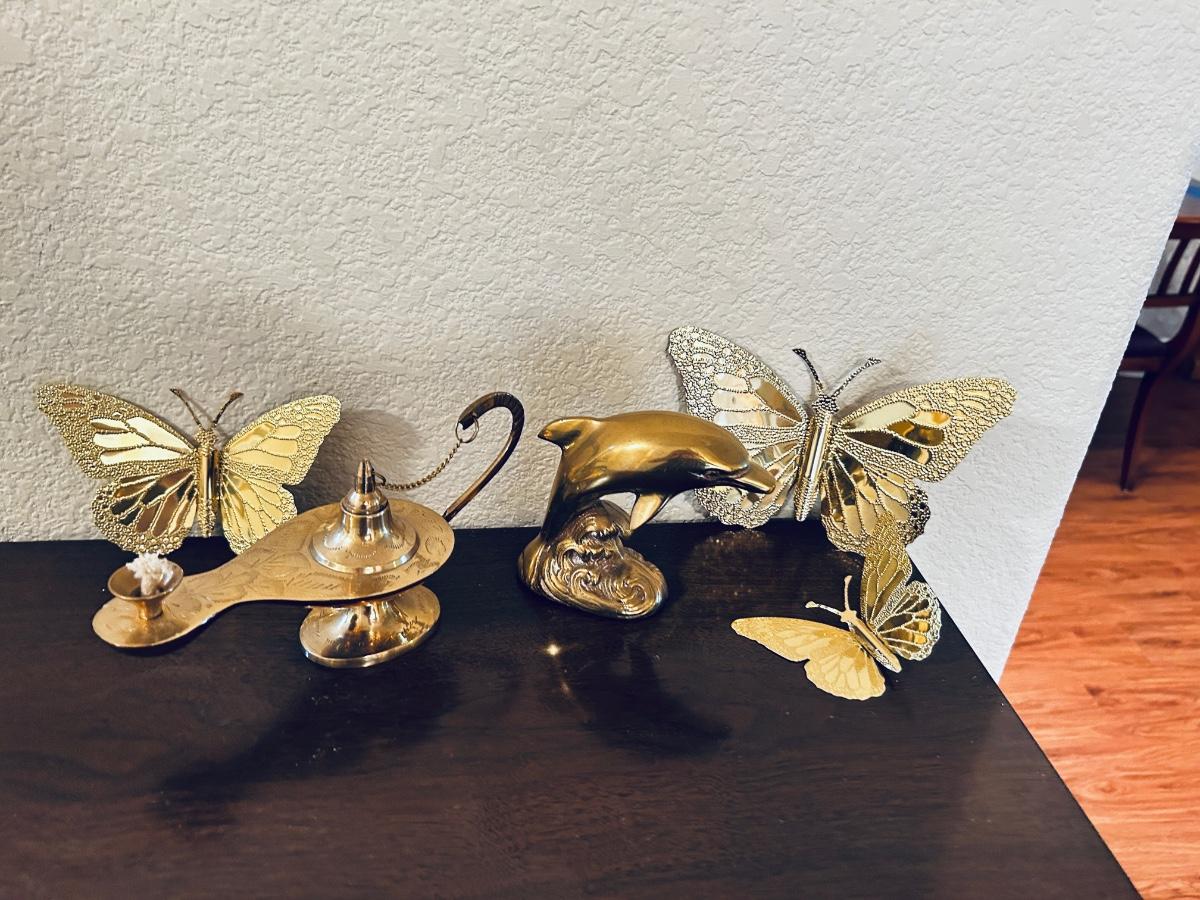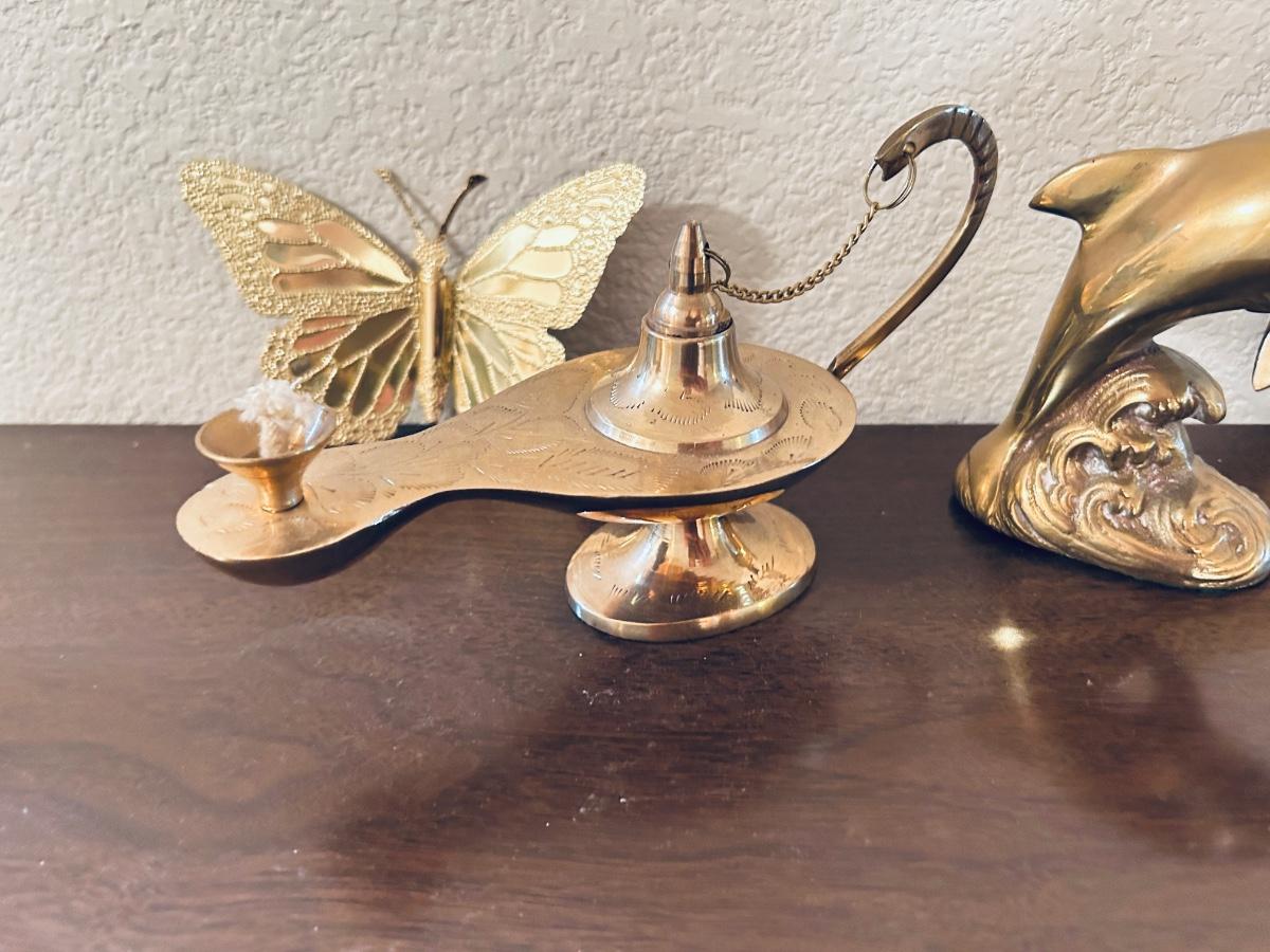 UNIQUE BRASS OIL LAMP, FILLED BRASS DOLPHIN, AND HOME INTERIORS BUTTERFLIES