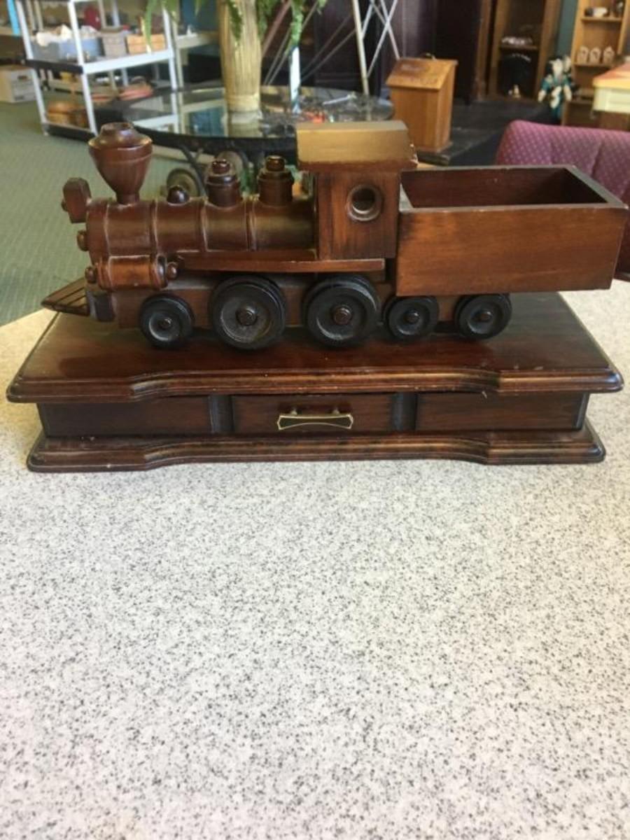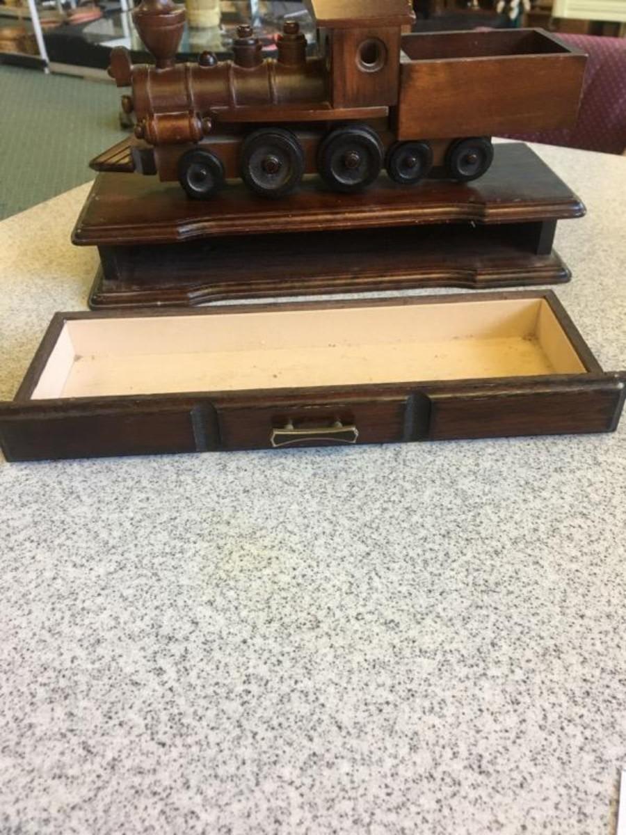 A very unique box with a cool railroad locomotive and drawer for your small stuff.