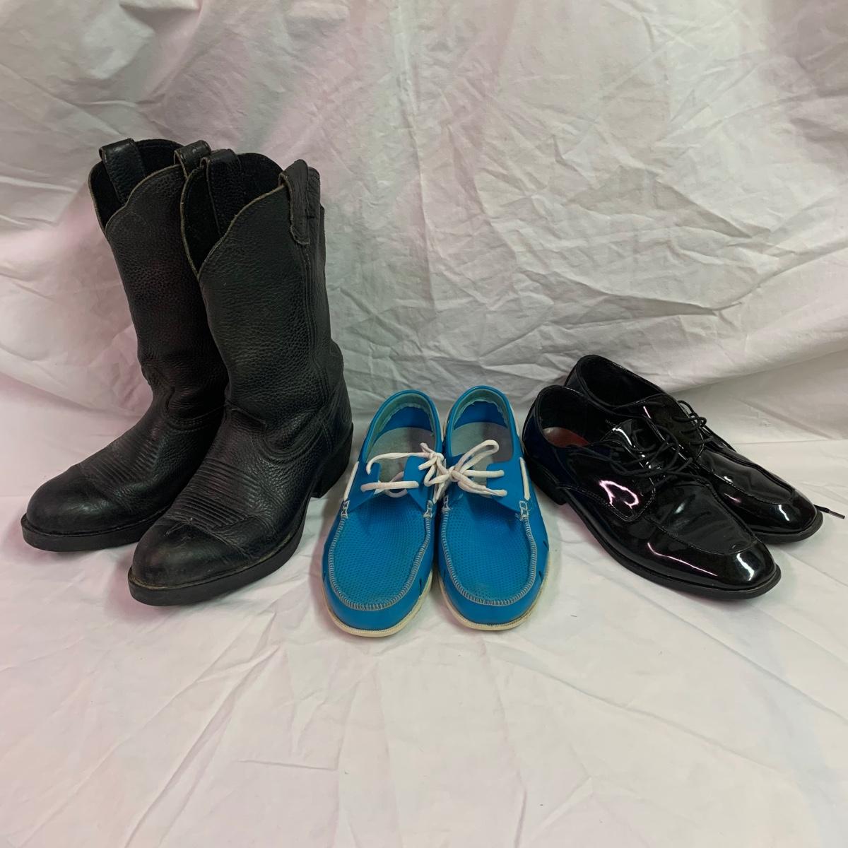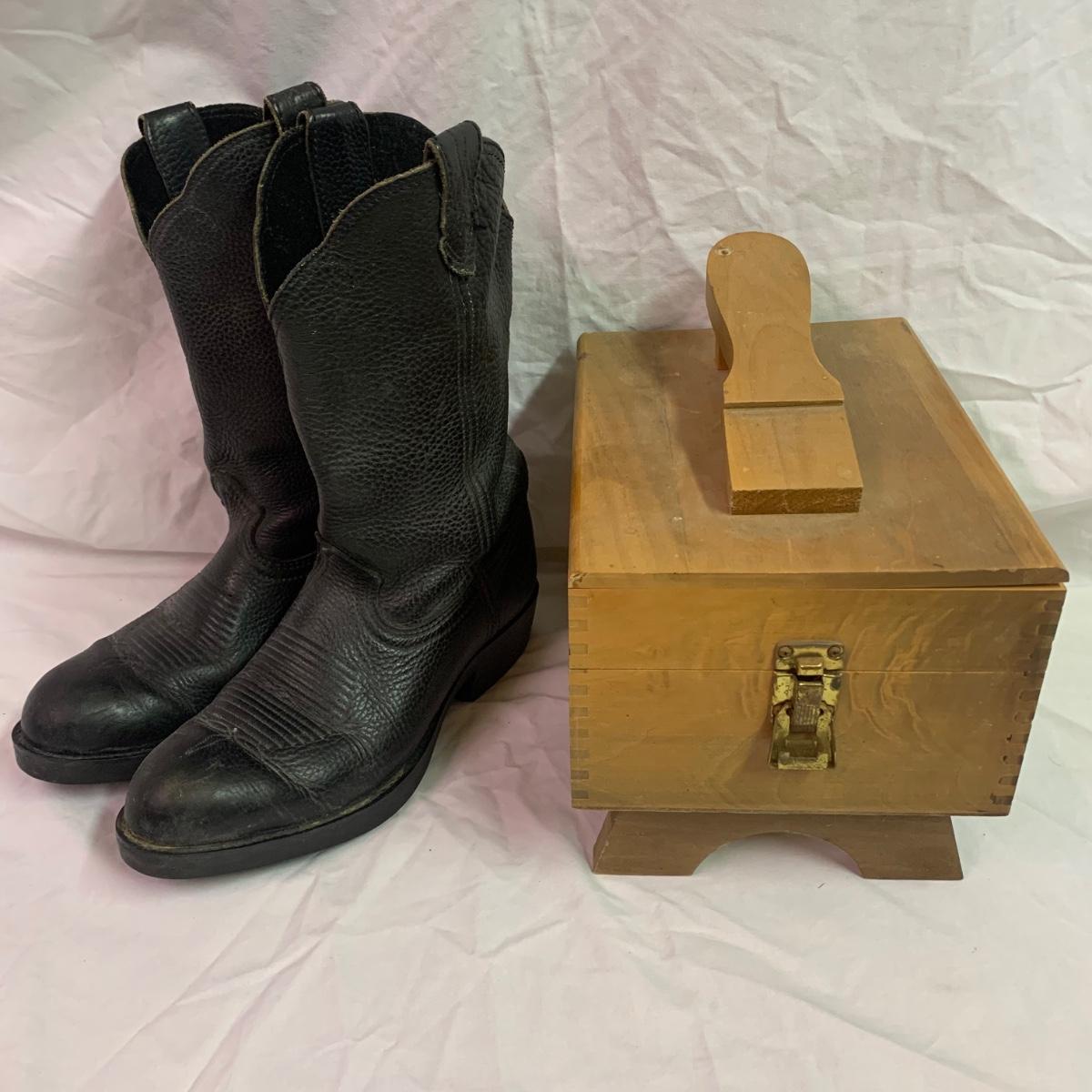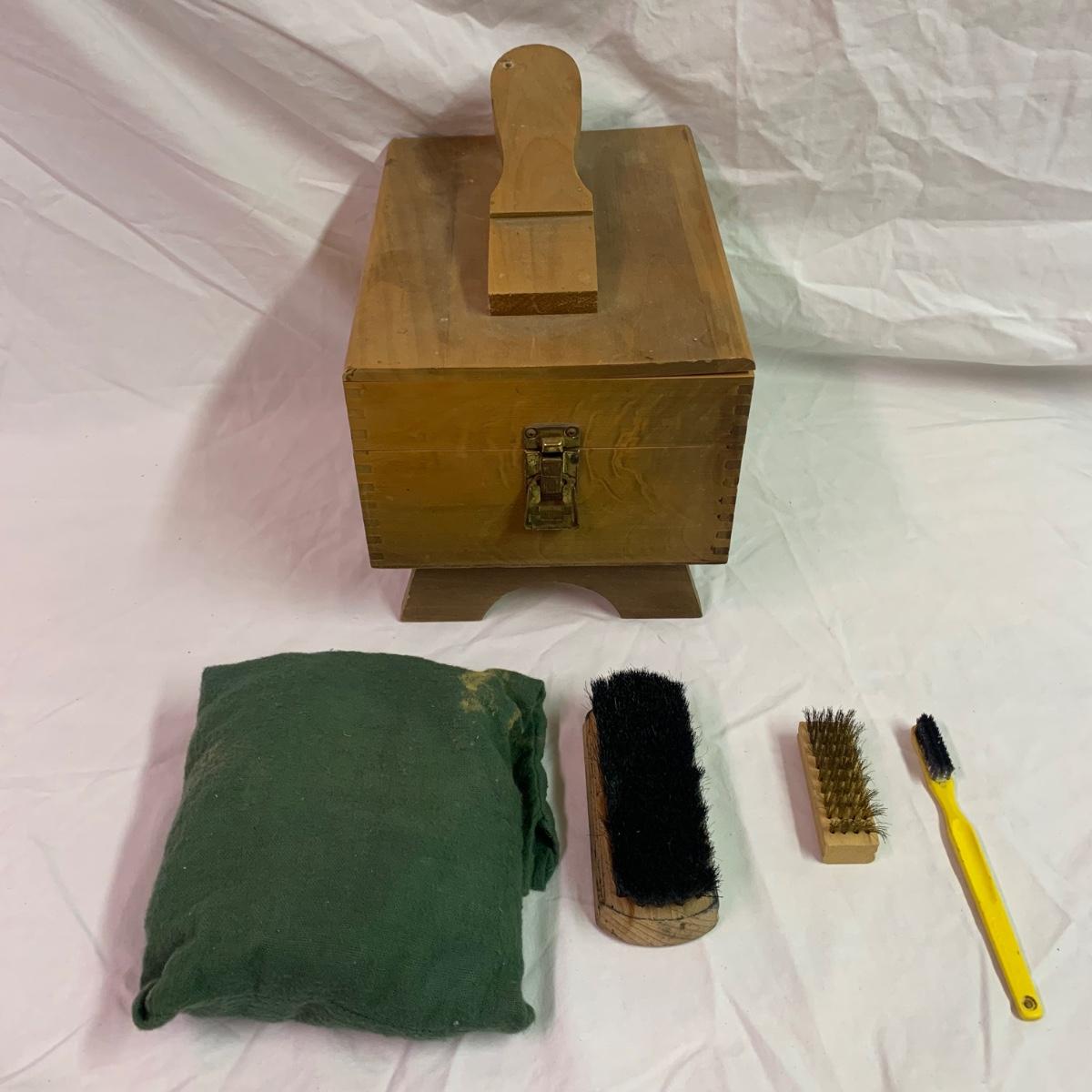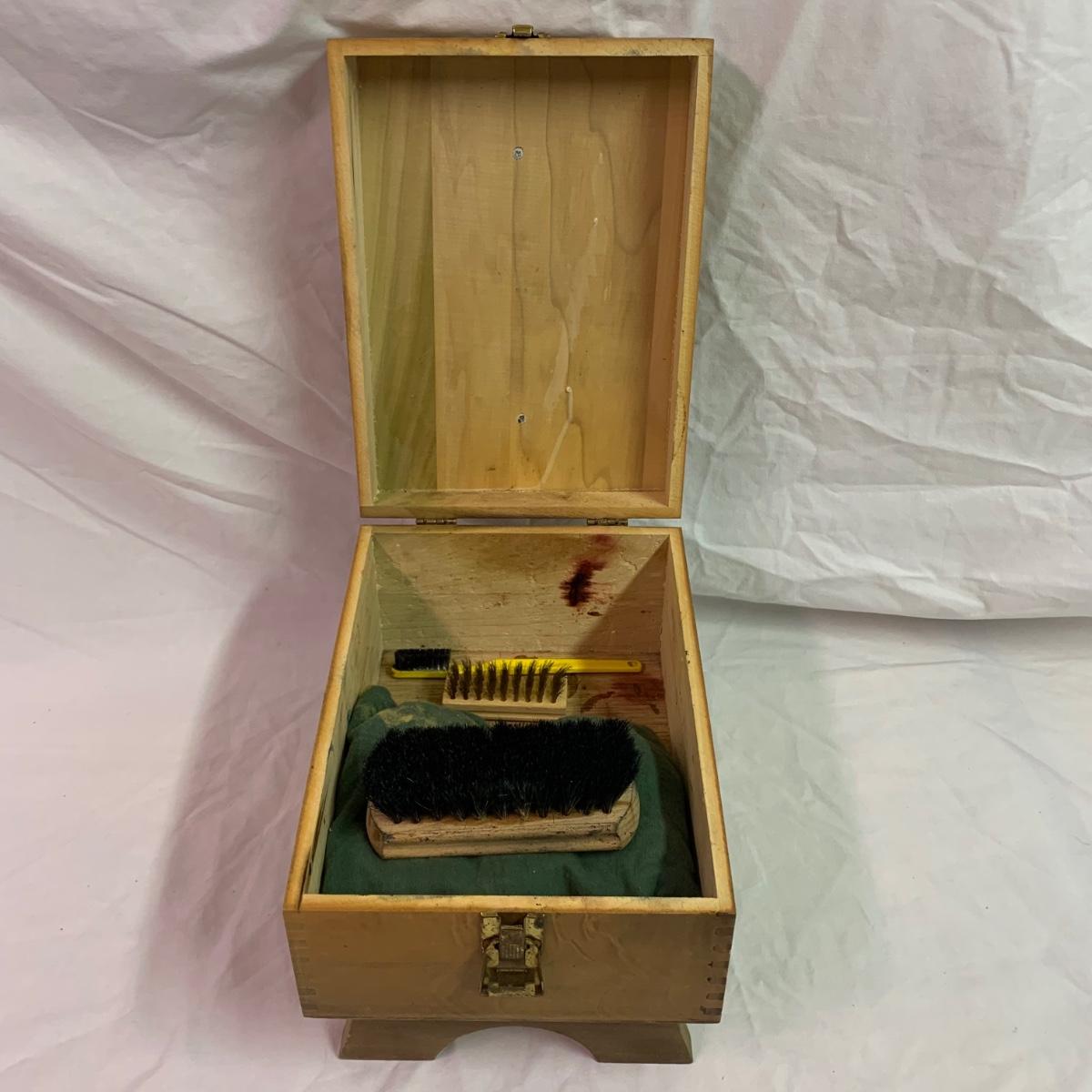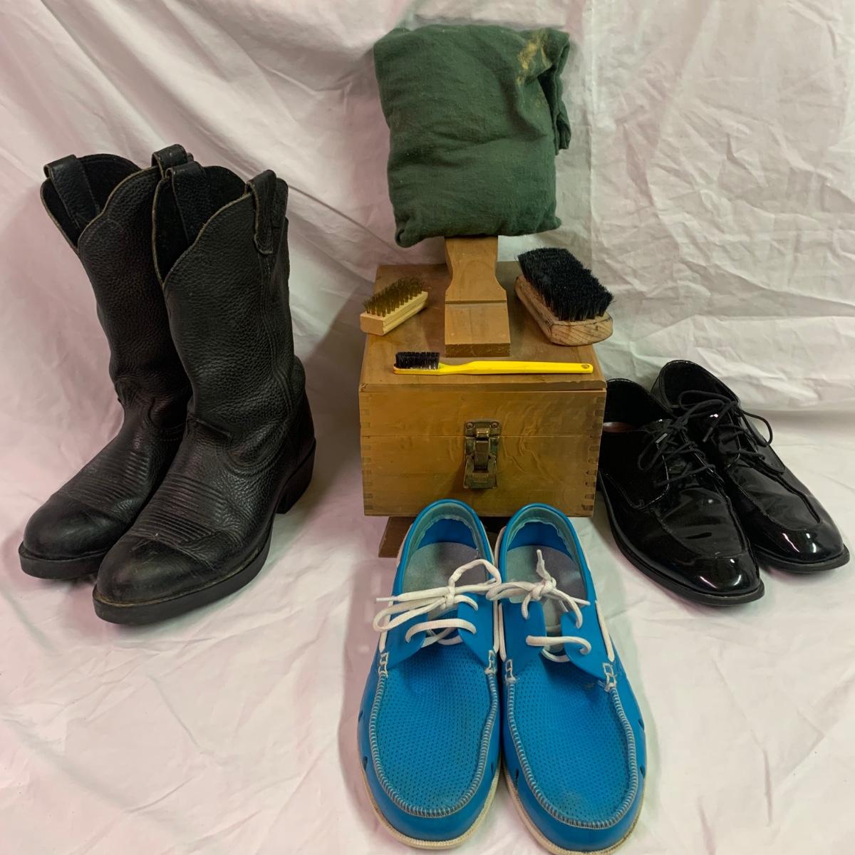 Gentlemen’s shoes and shoeshine valet with brushes lot. This lot includes wooden shoeshine valet box with three brushes and polishing cloths, one pair of black men’s size 10 Georgia work boots, one pair of blue five flip shoes in size 8-9, and one pair of black polished Jean Yves size 10 shoes. All shoes have been used and show signs of wear. See photos for more details. Shipping available.