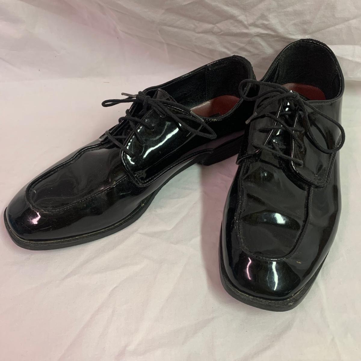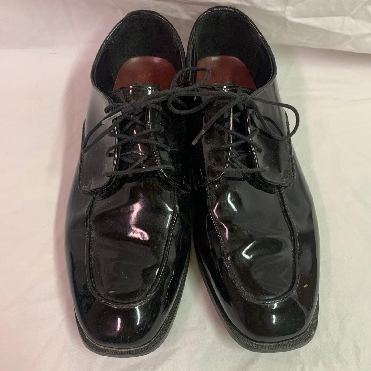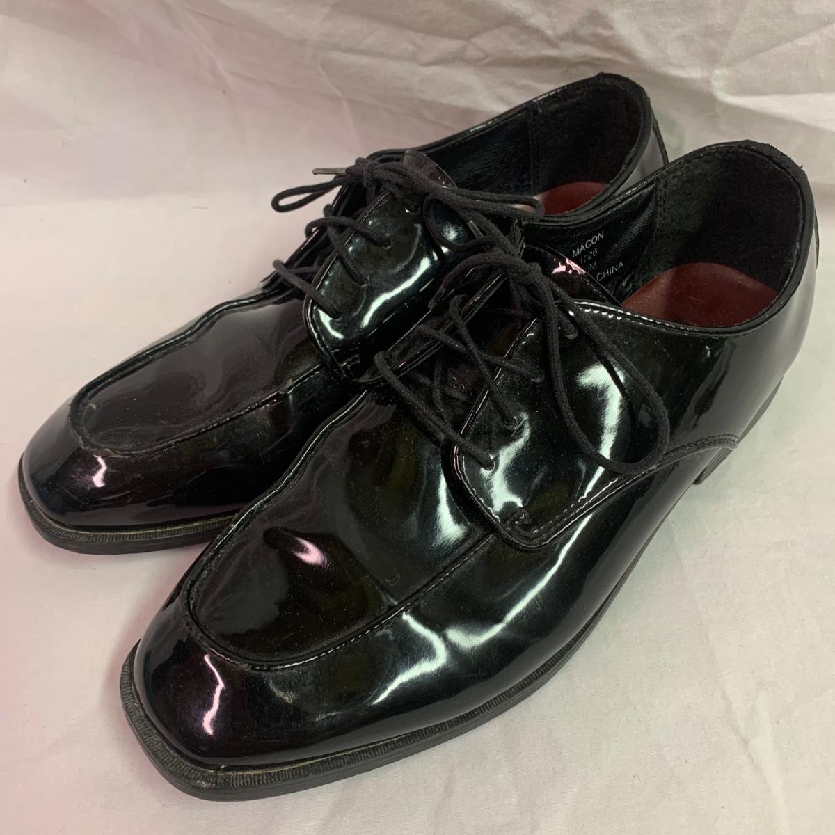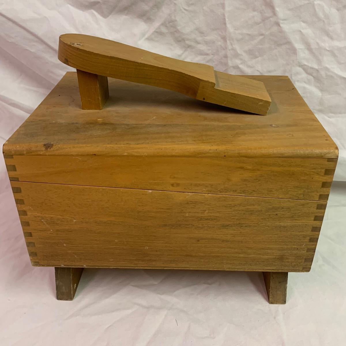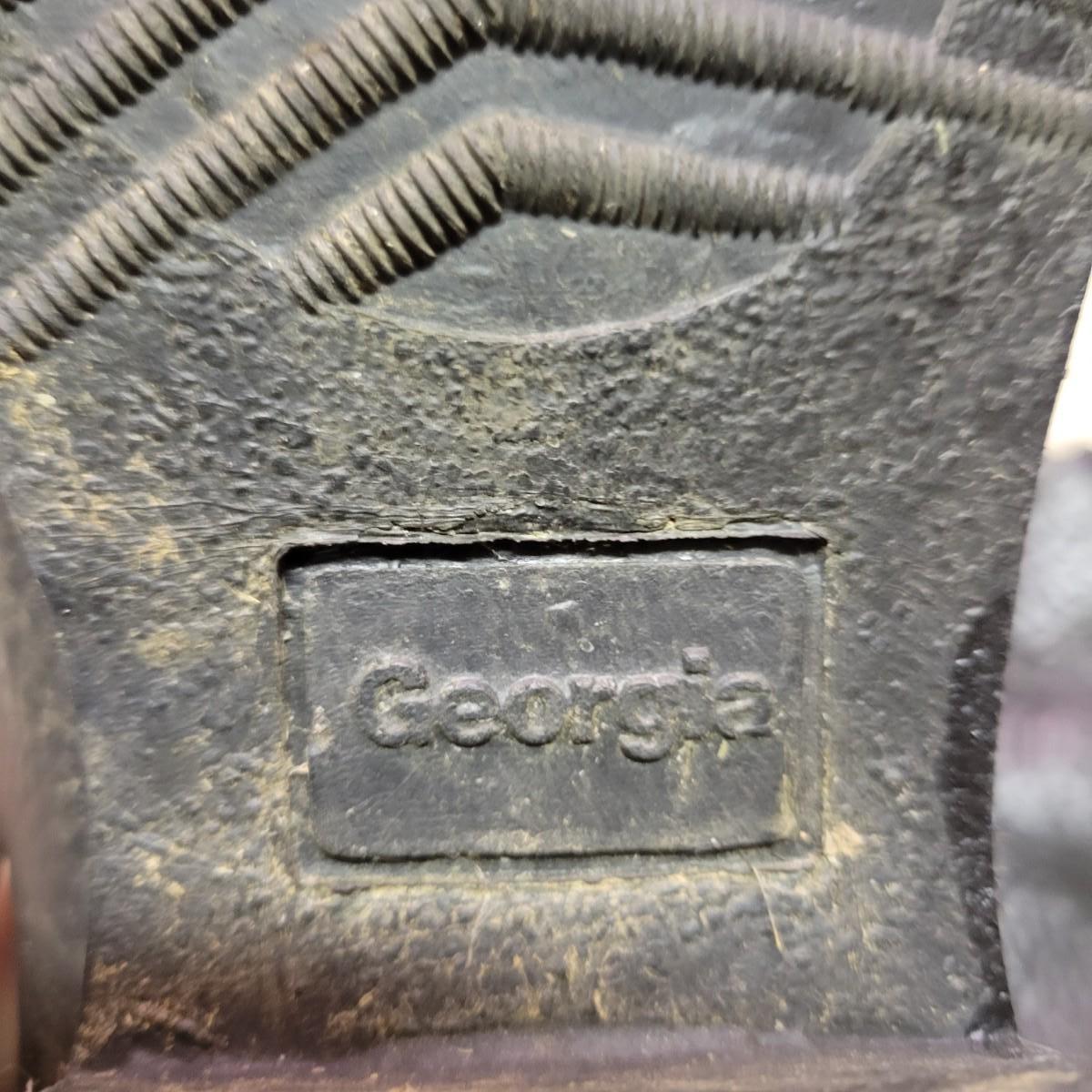 Gentlemen’s shoes and shoeshine valet with brushes lot. This lot includes wooden shoeshine valet box with three brushes and polishing cloths, one pair of black men’s size 10 Georgia work boots, one pair of blue five flip shoes in size 8-9, and one pair of black polished Jean Yves size 10 shoes. All shoes have been used and show signs of wear. See photos for more details. Shipping available.