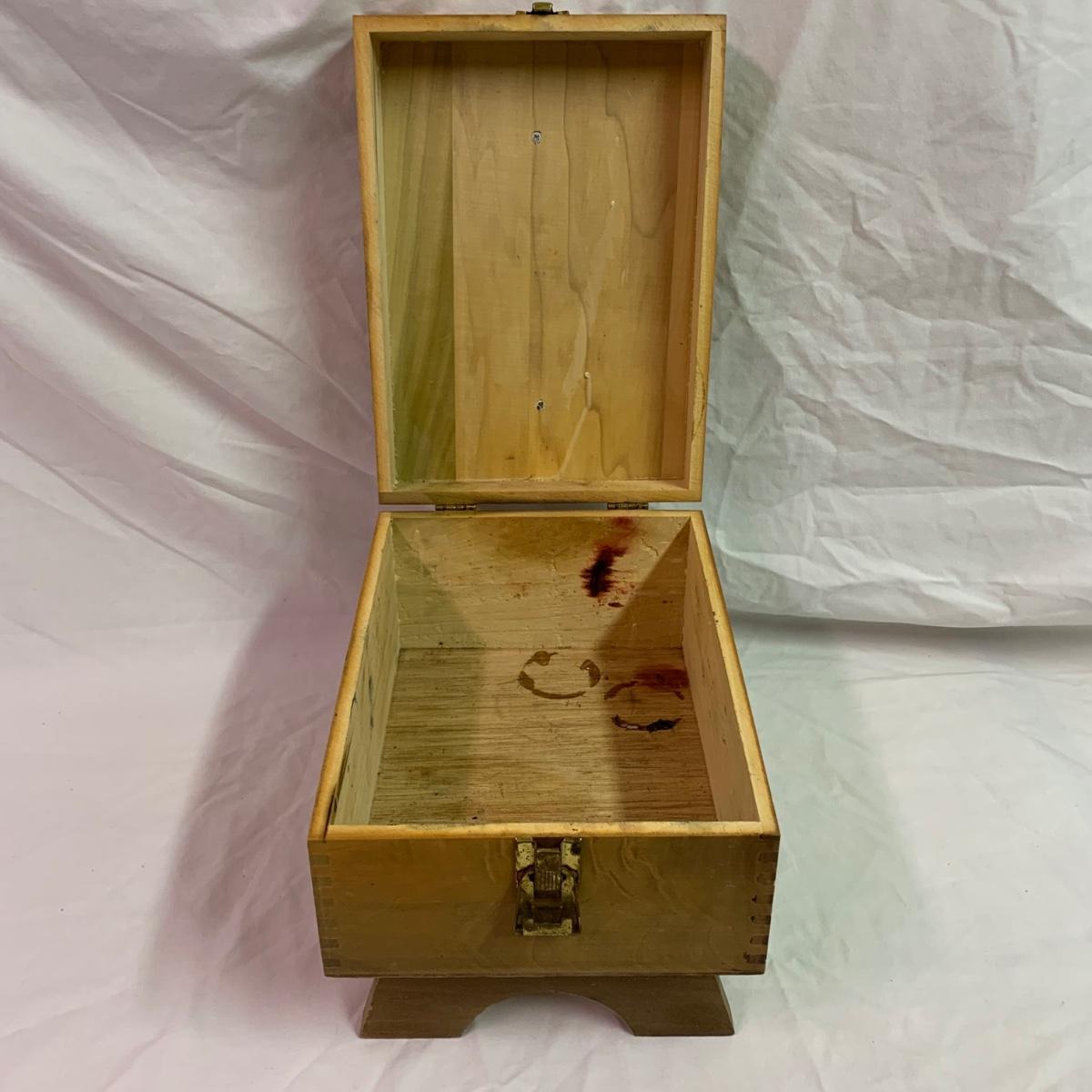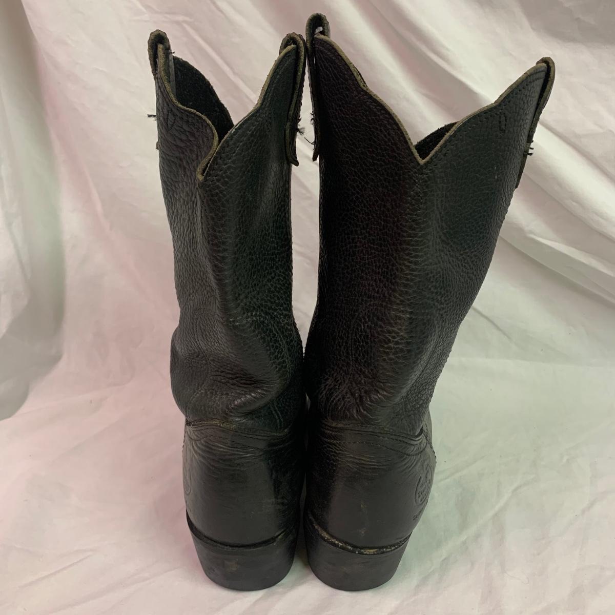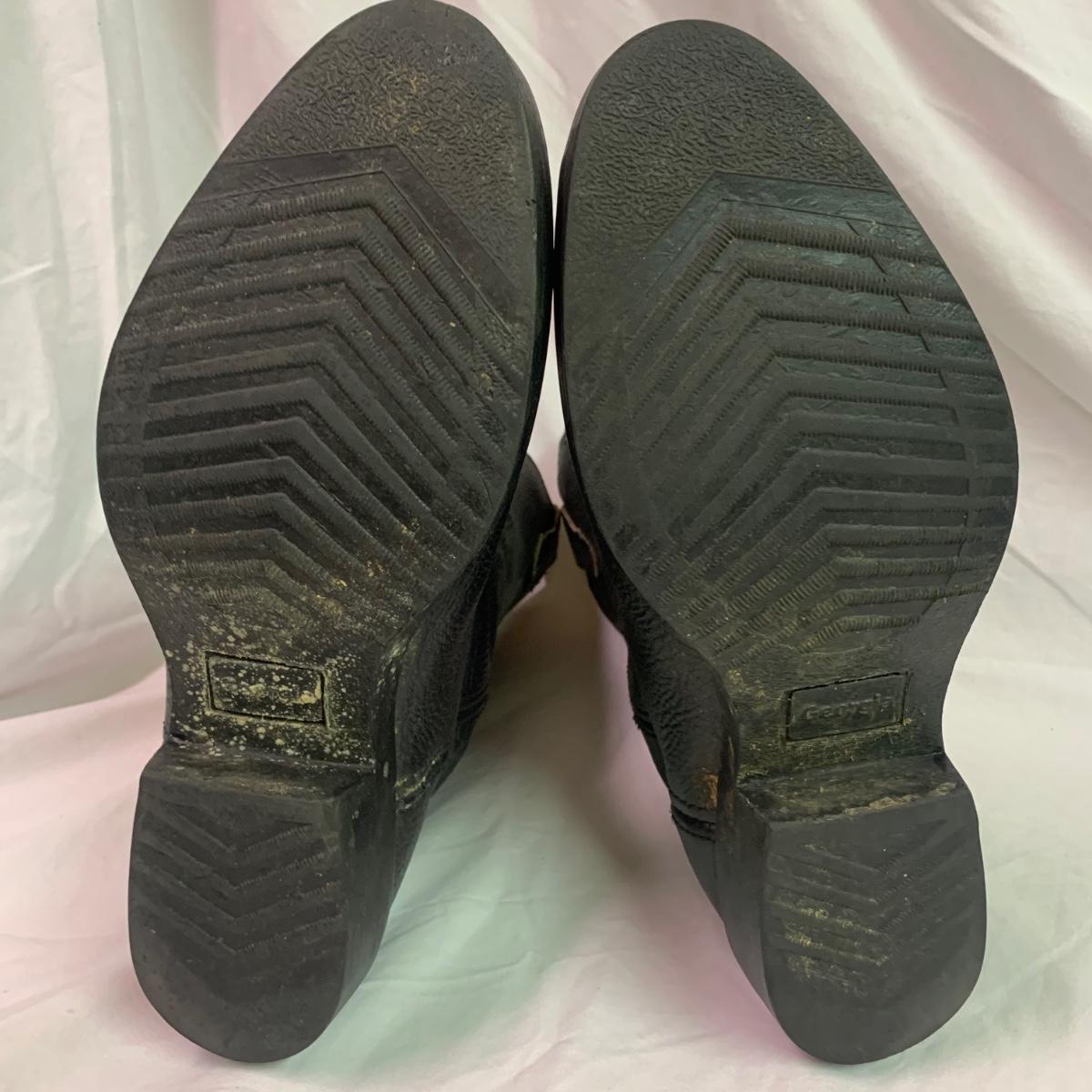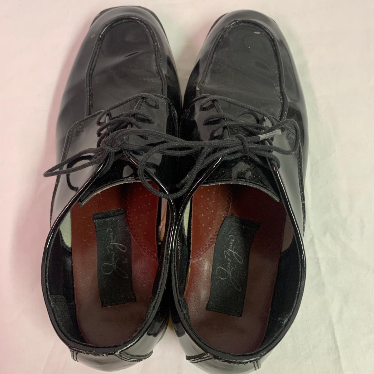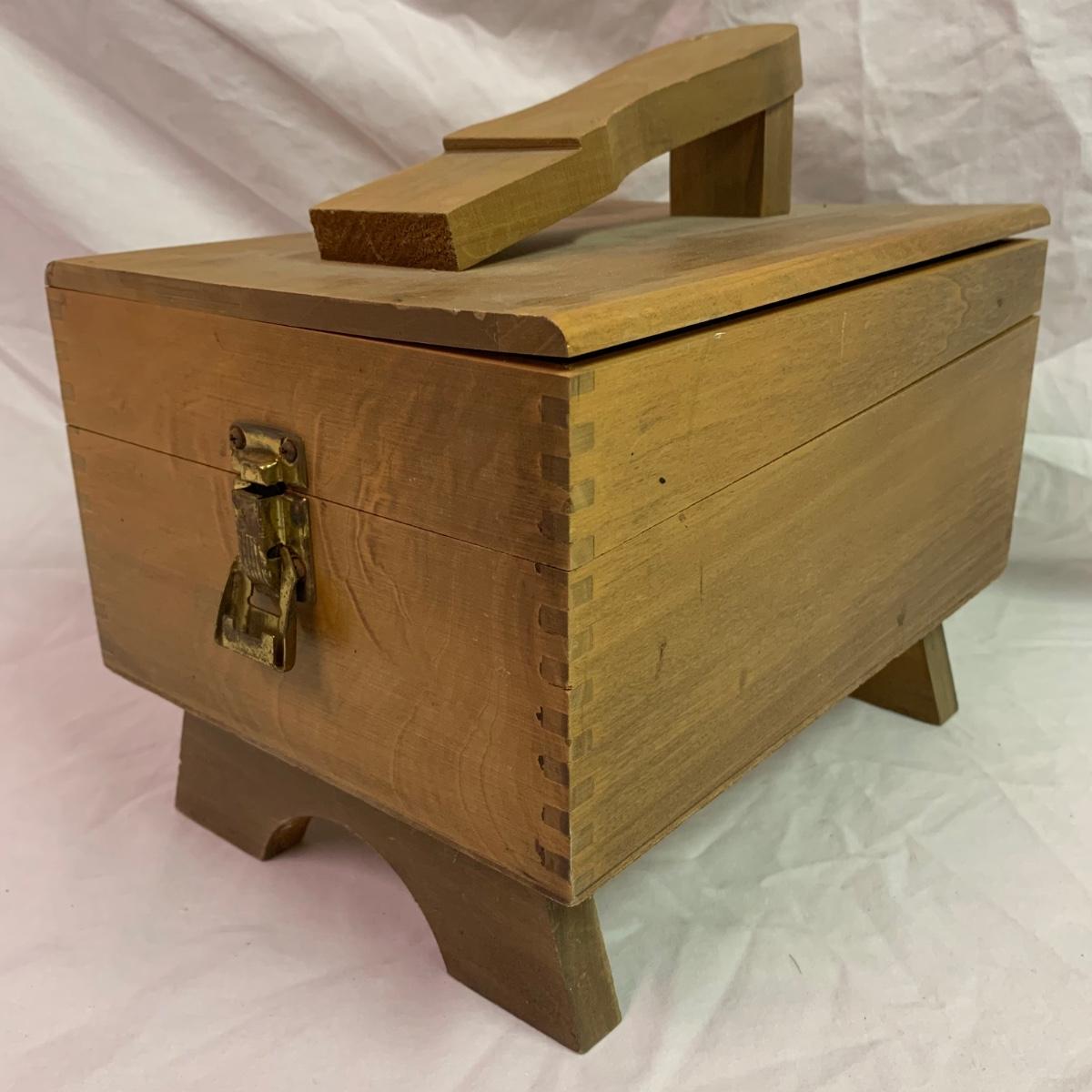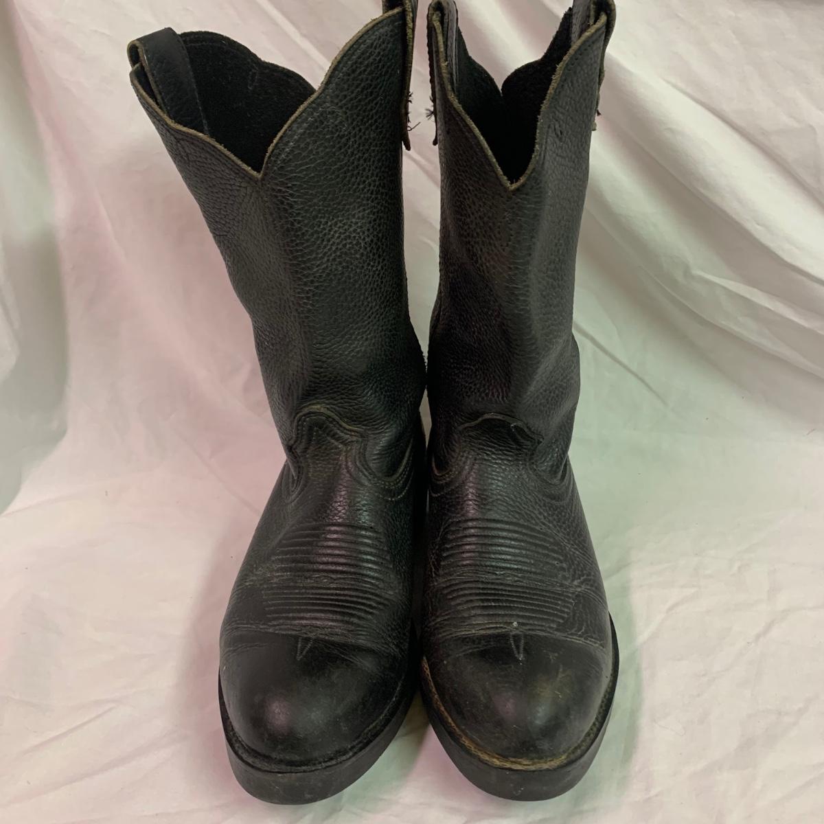 Gentlemen’s shoes and shoeshine valet with brushes lot. This lot includes wooden shoeshine valet box with three brushes and polishing cloths, one pair of black men’s size 10 Georgia work boots, one pair of blue five flip shoes in size 8-9, and one pair of black polished Jean Yves size 10 shoes. All shoes have been used and show signs of wear. See photos for more details. Shipping available.