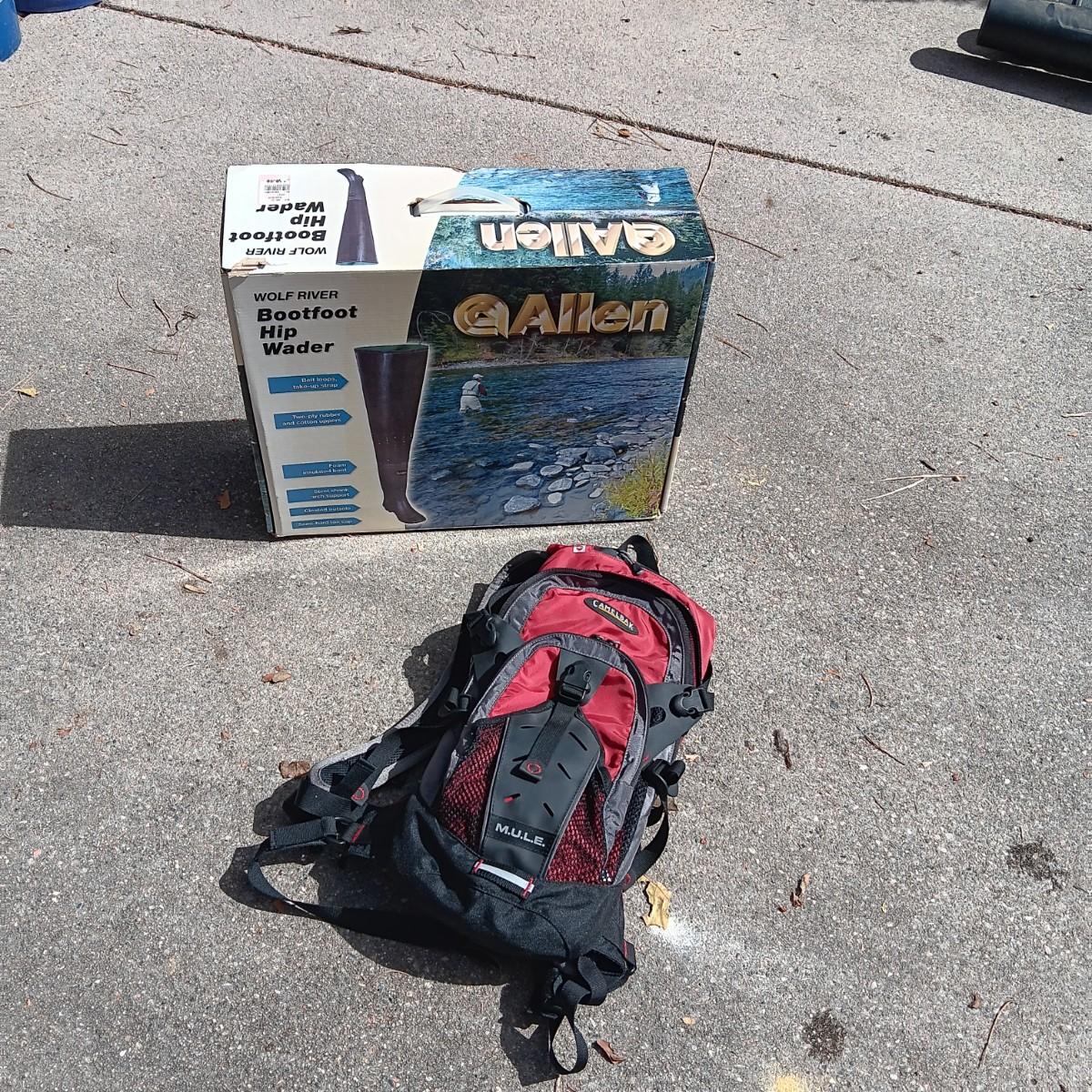 GENTY USED BOOTFOOT HIP WADERS SIZE 11 AND A CAMELBAK