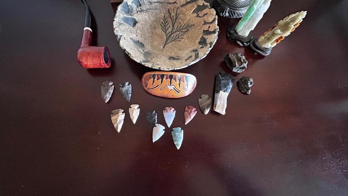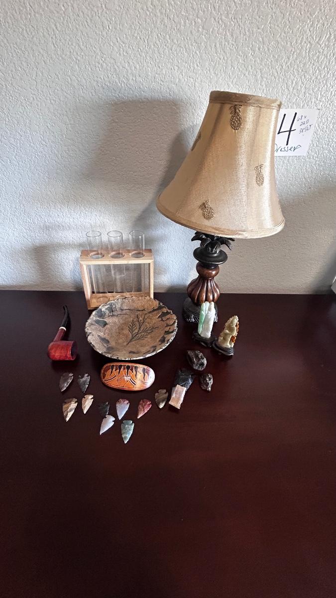 ARROW HEADS, HAND CRAFTED SIGNED BOWL, SMALL LAMP,
