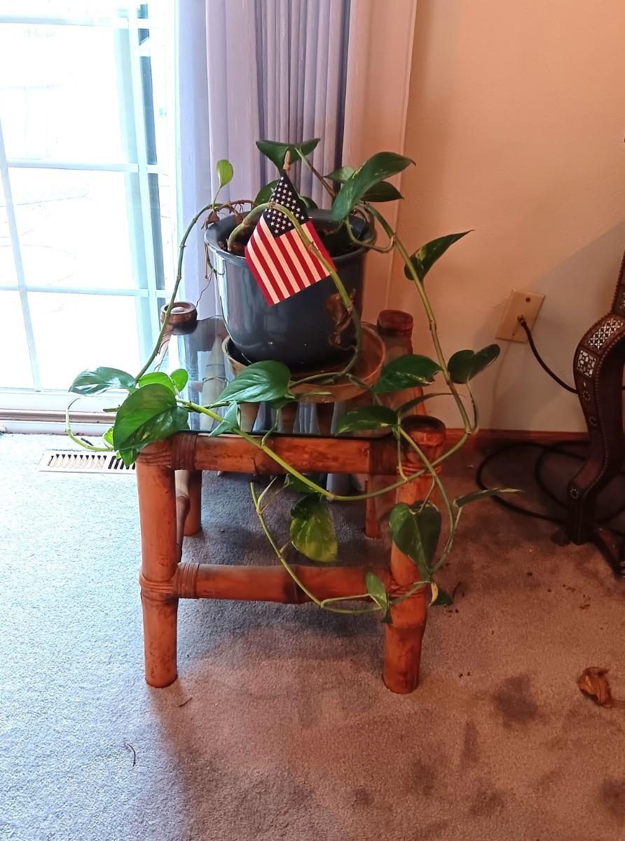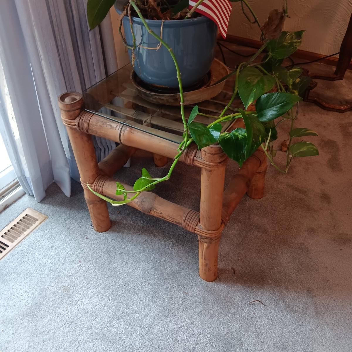 GENUINE BAMBOO END TABLE WITH GLASS TOP PLUS A LIVE PLANT