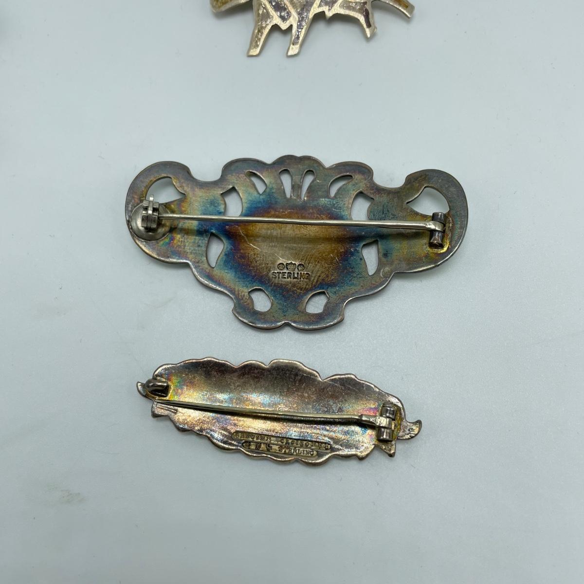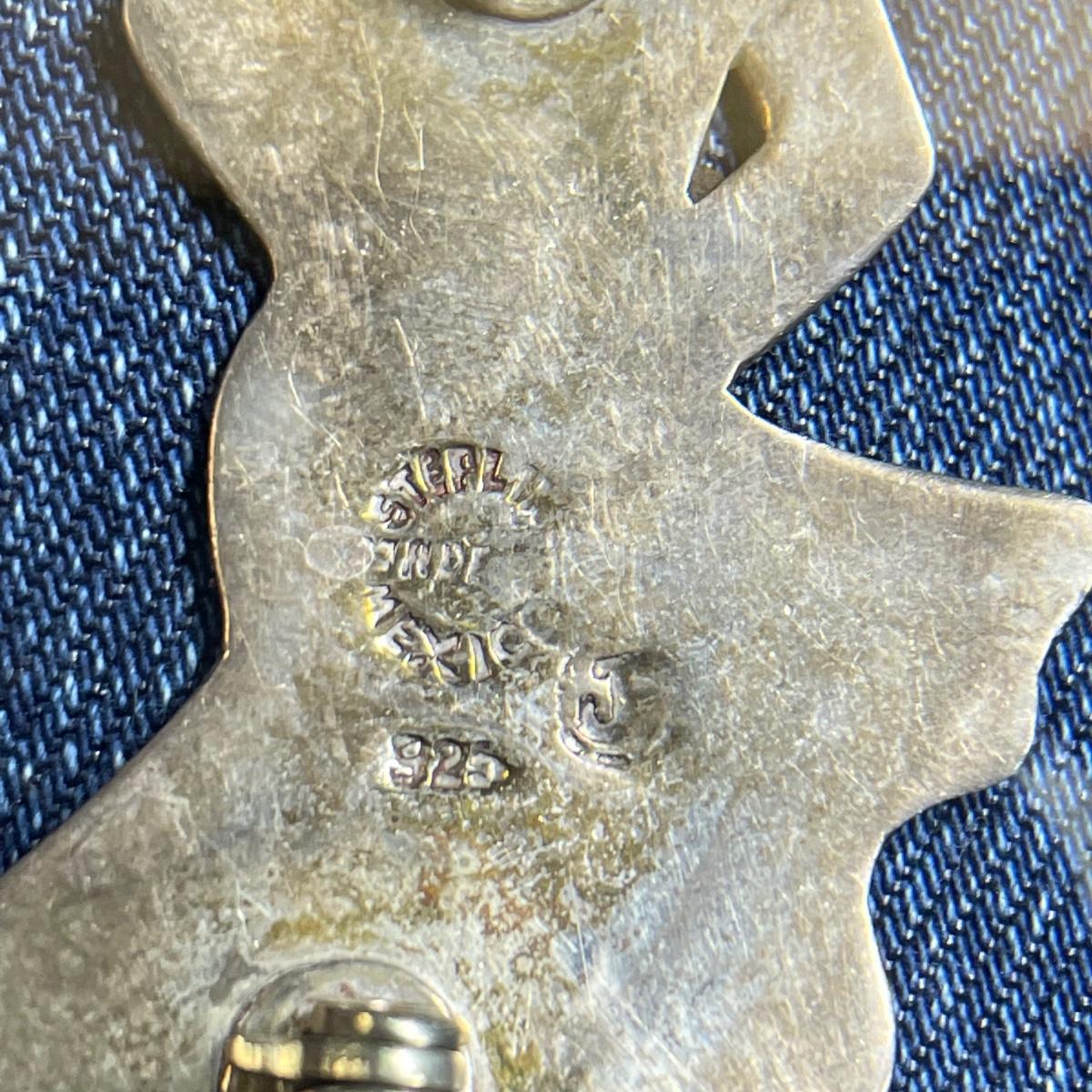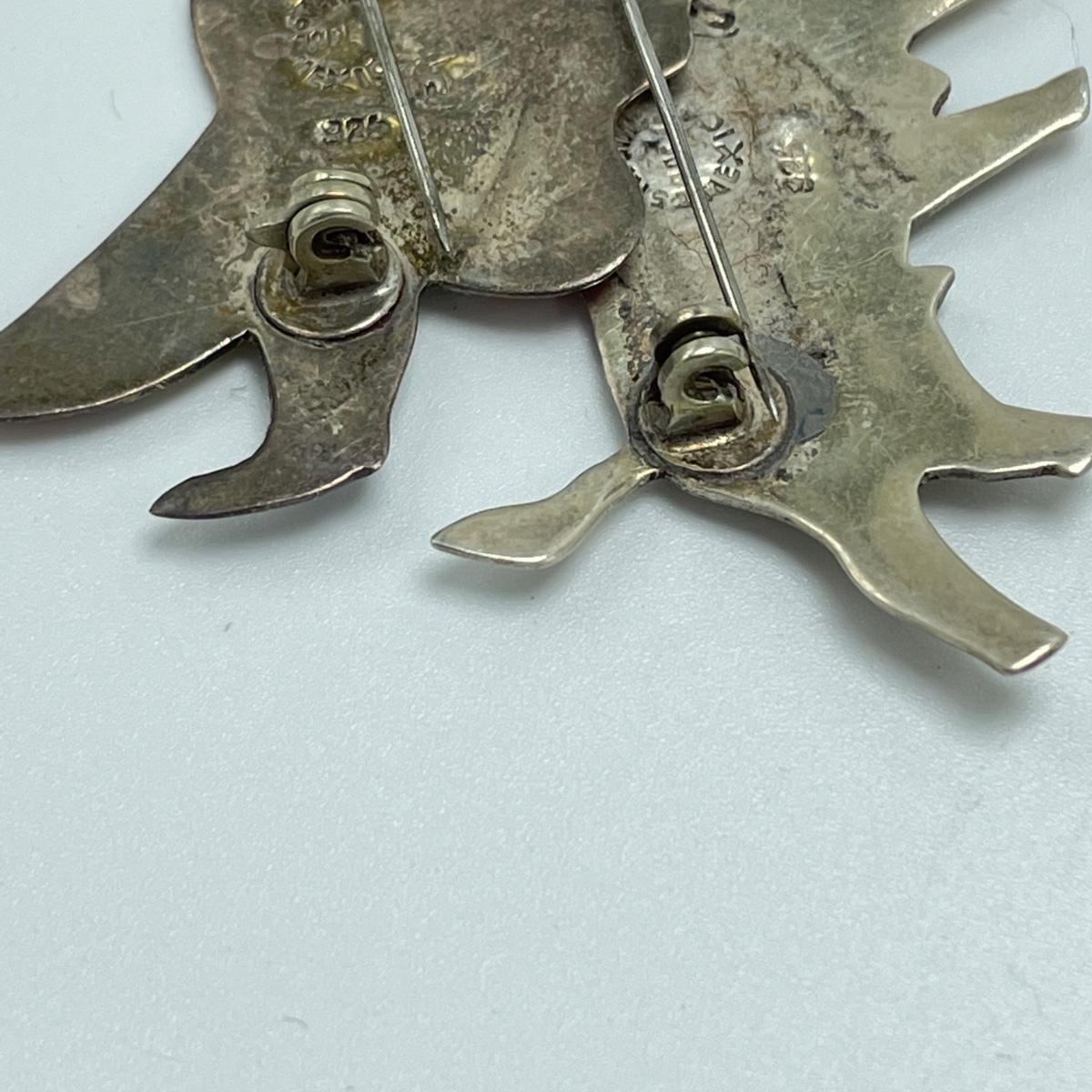 Five brooches, all marked. First, two Lily brooches, the smaller one is marked Genuine Cloisonné, both are marked Sterling. A bull and conquistador marked Sterling and 925. This pair is also marked made in Mexico. The bull needs a small repair to the clasp, it is missing its closing hinge. Lastly, a large 2.5” diameter Mother of Pearl or abalone like brooch/pendant combo, marked Made in Mexico with an eagle stamp. See images. Shipping available. Starting bid is at or near melt value.