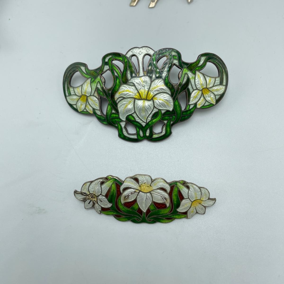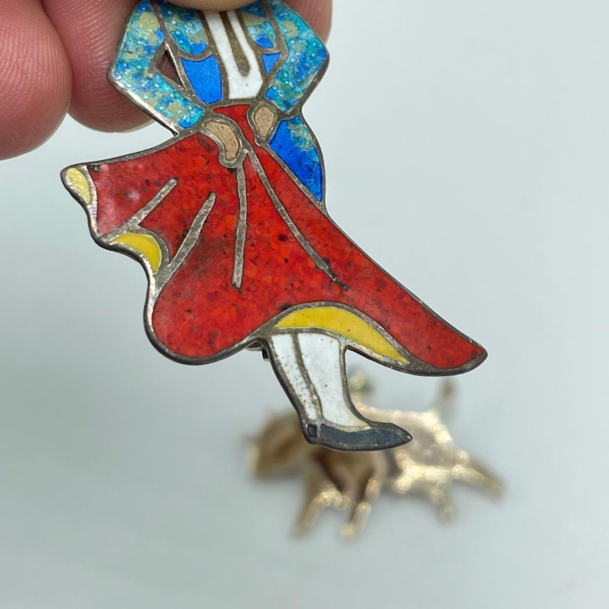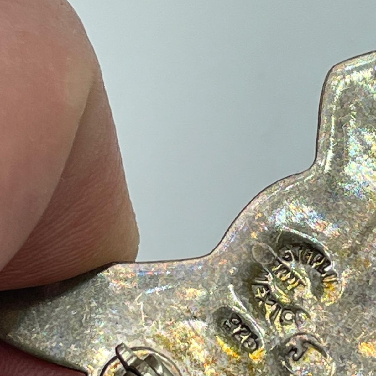 Five brooches, all marked. First, two Lily brooches, the smaller one is marked Genuine Cloisonné, both are marked Sterling. A bull and conquistador marked Sterling and 925. This pair is also marked made in Mexico. The bull needs a small repair to the clasp, it is missing its closing hinge. Lastly, a large 2.5” diameter Mother of Pearl or abalone like brooch/pendant combo, marked Made in Mexico with an eagle stamp. See images. Shipping available. Starting bid is at or near melt value.