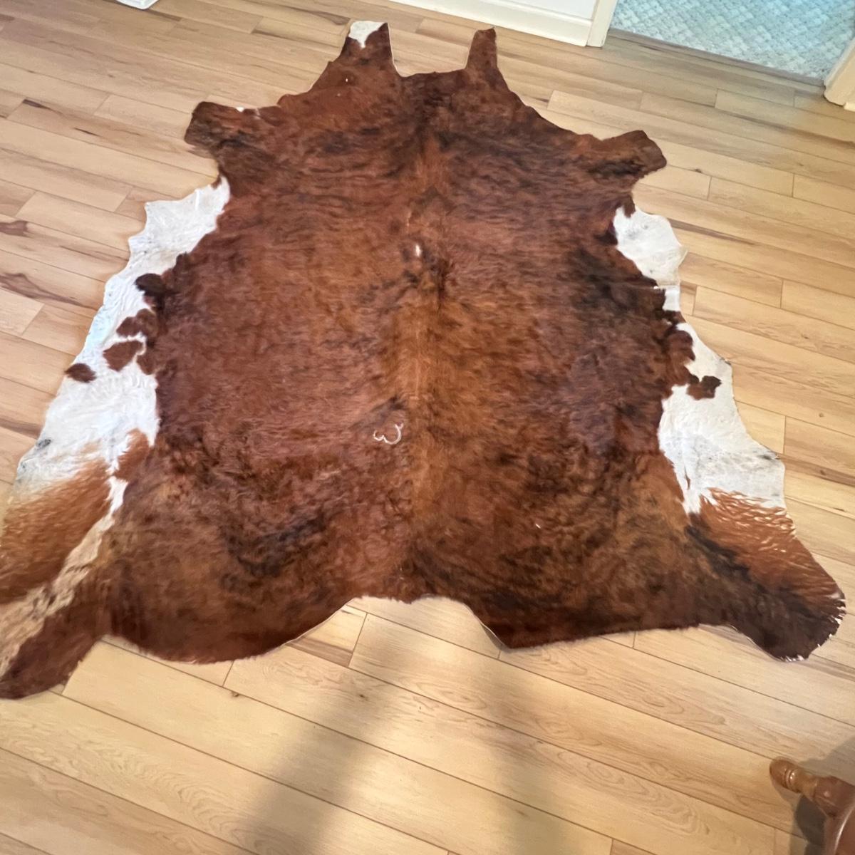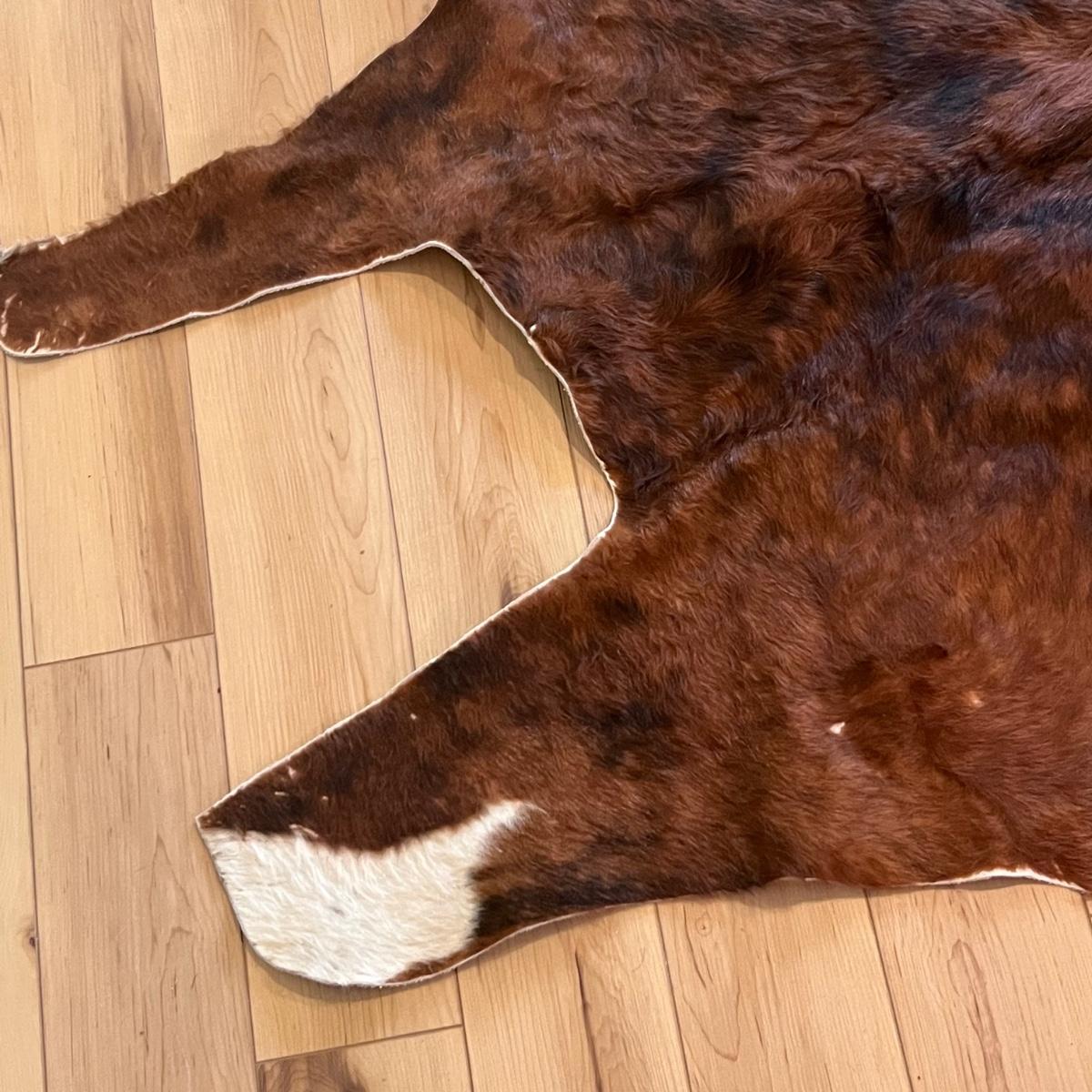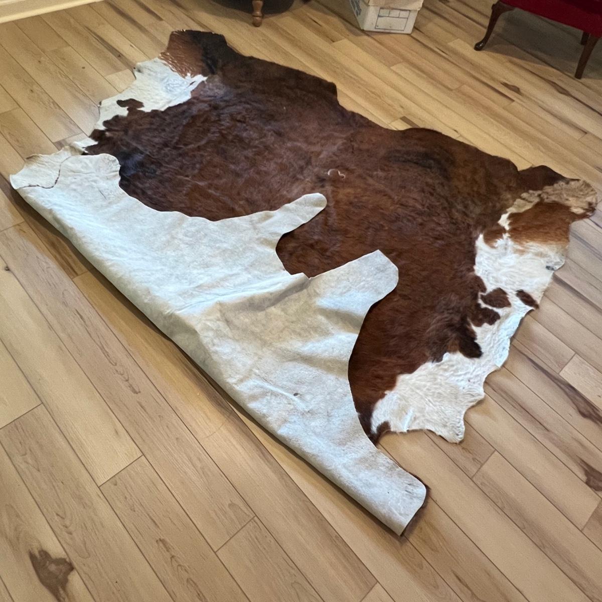 This cowhide measures approximately 7’ x 7’5”. Note that this cow was brand. see images for label.