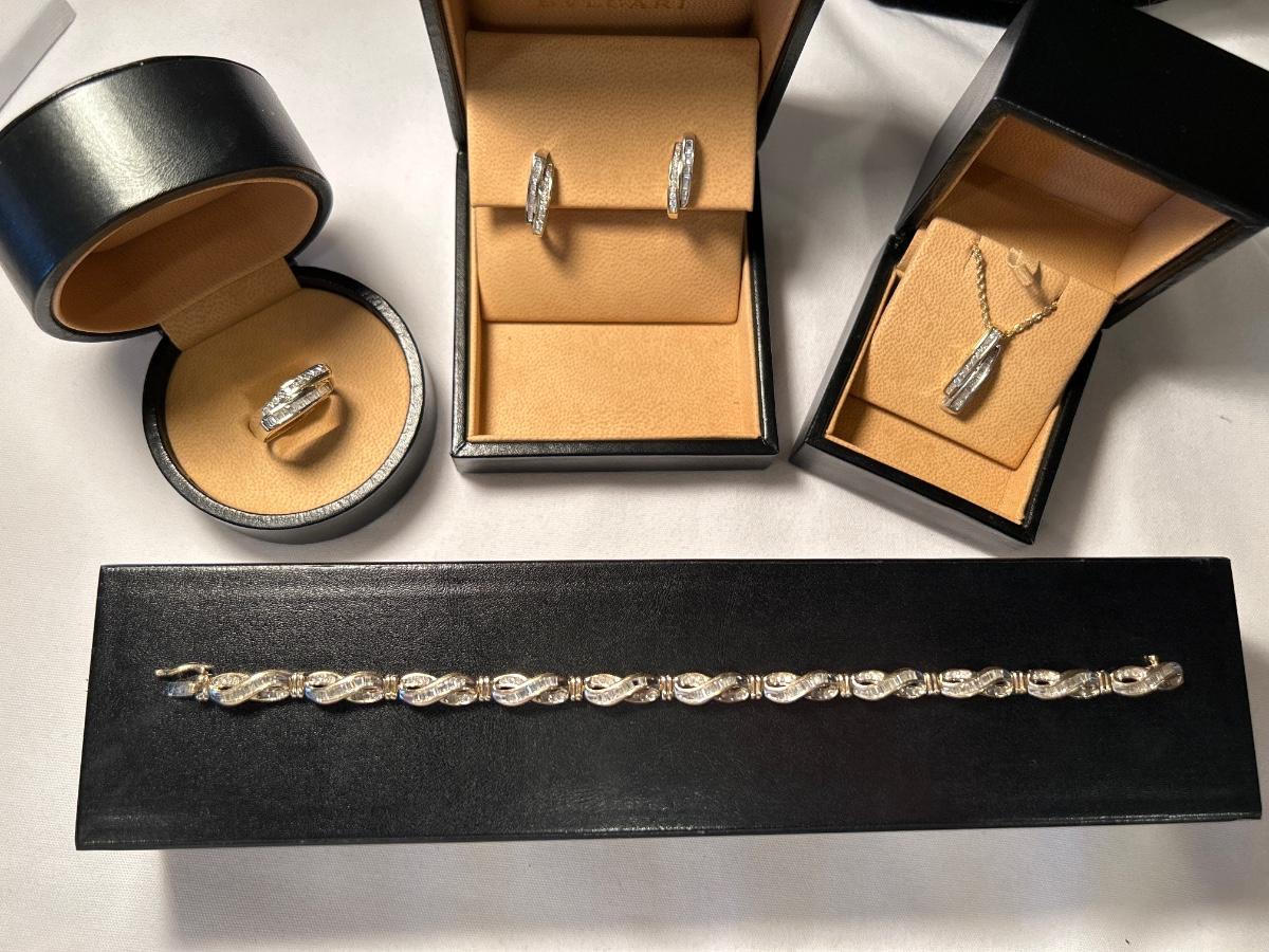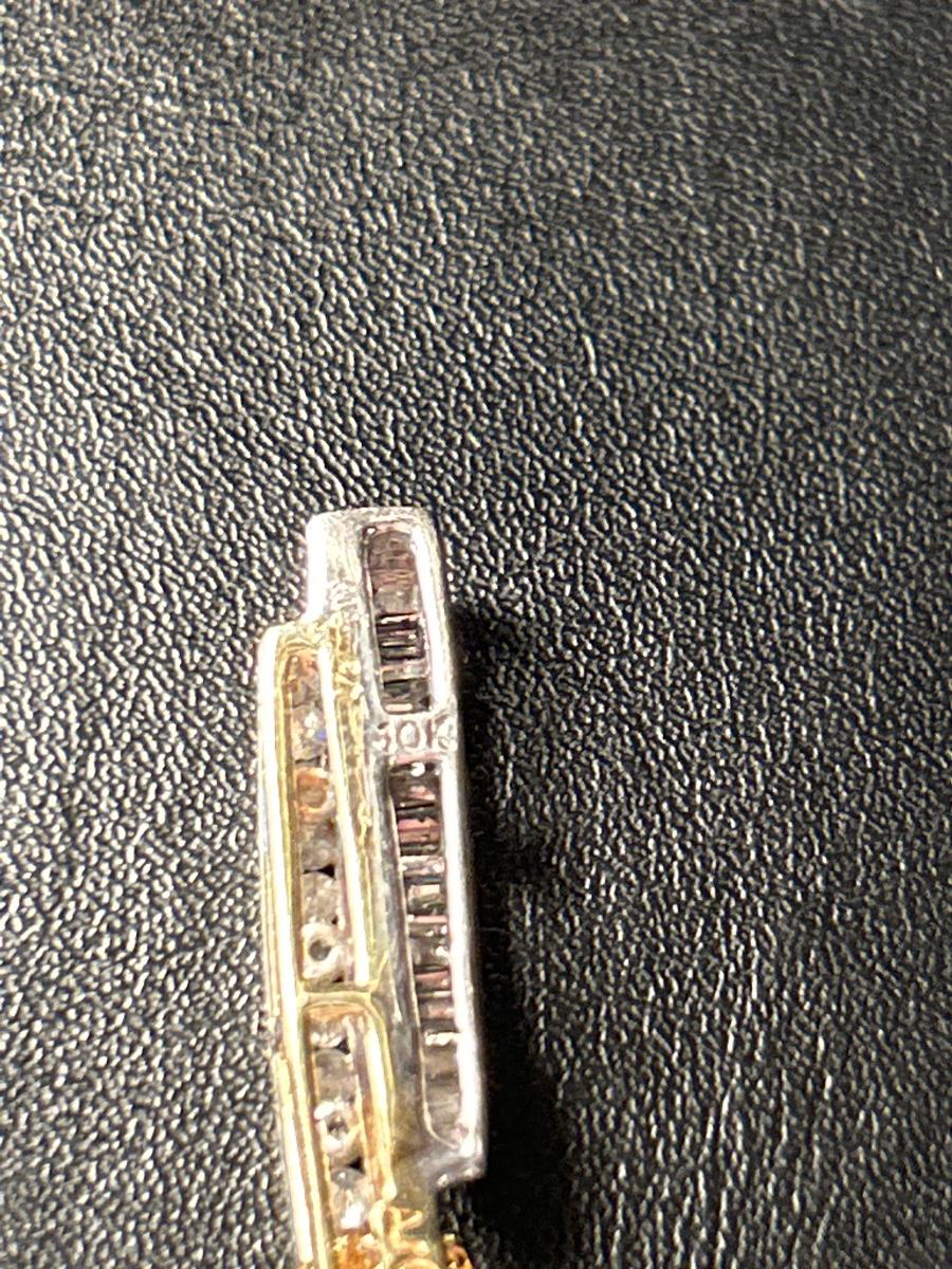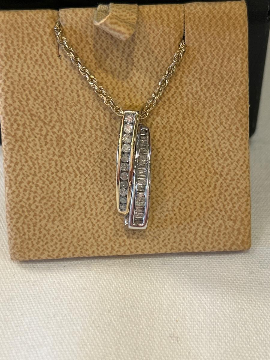 10K white & yellow gold diamond set. The ring is a size 10, the chain on the necklace is a 22 inch & the earrings are clip on. Boxes are not included