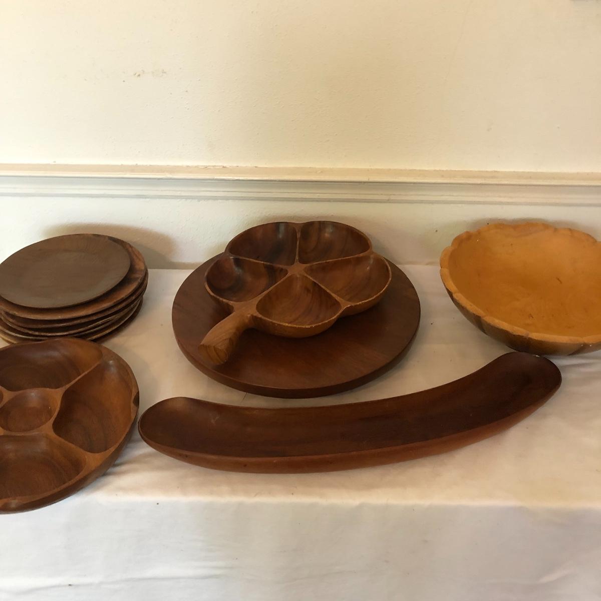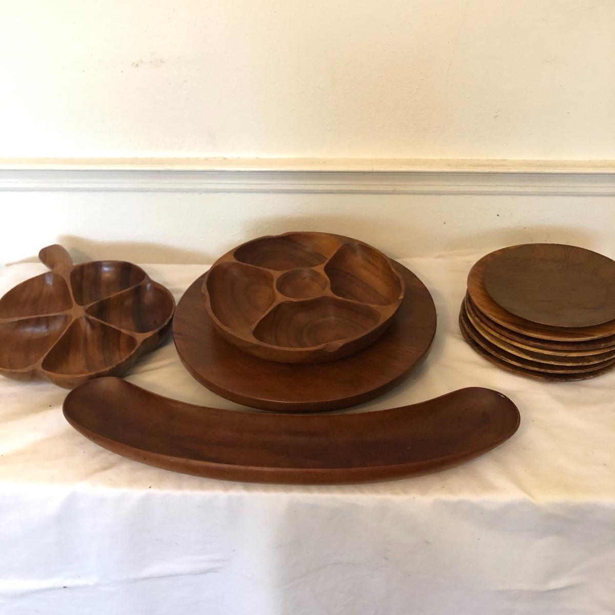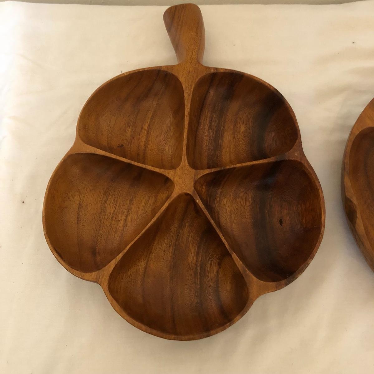 Monkey pod wooden clover shaped bowl is accompanied by a Hawaiian monkey pod dip dish along with various other wooden serving pieces