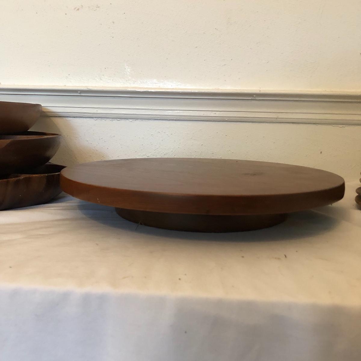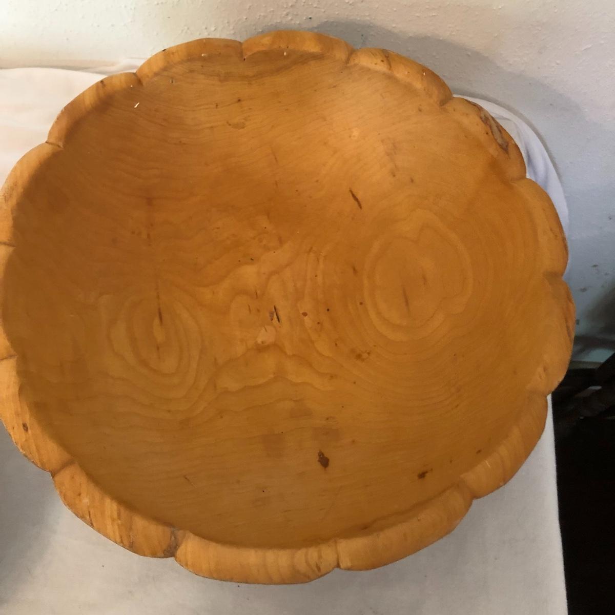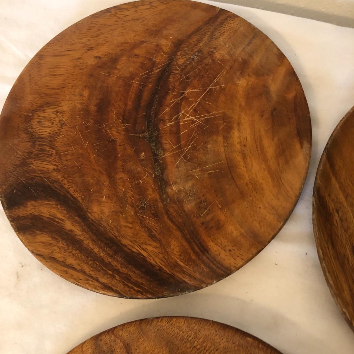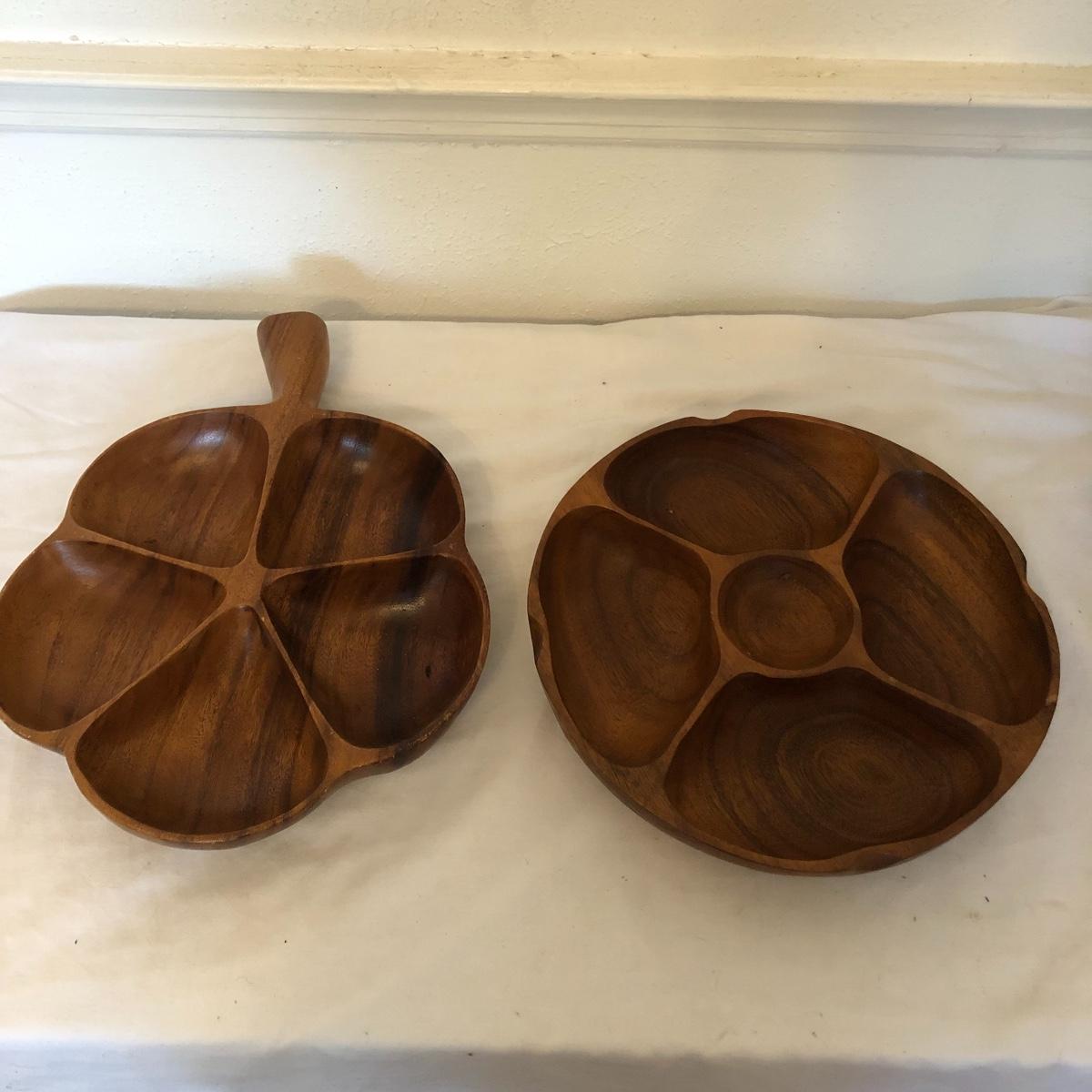 Monkey pod wooden clover shaped bowl is accompanied by a Hawaiian monkey pod dip dish along with various other wooden serving pieces