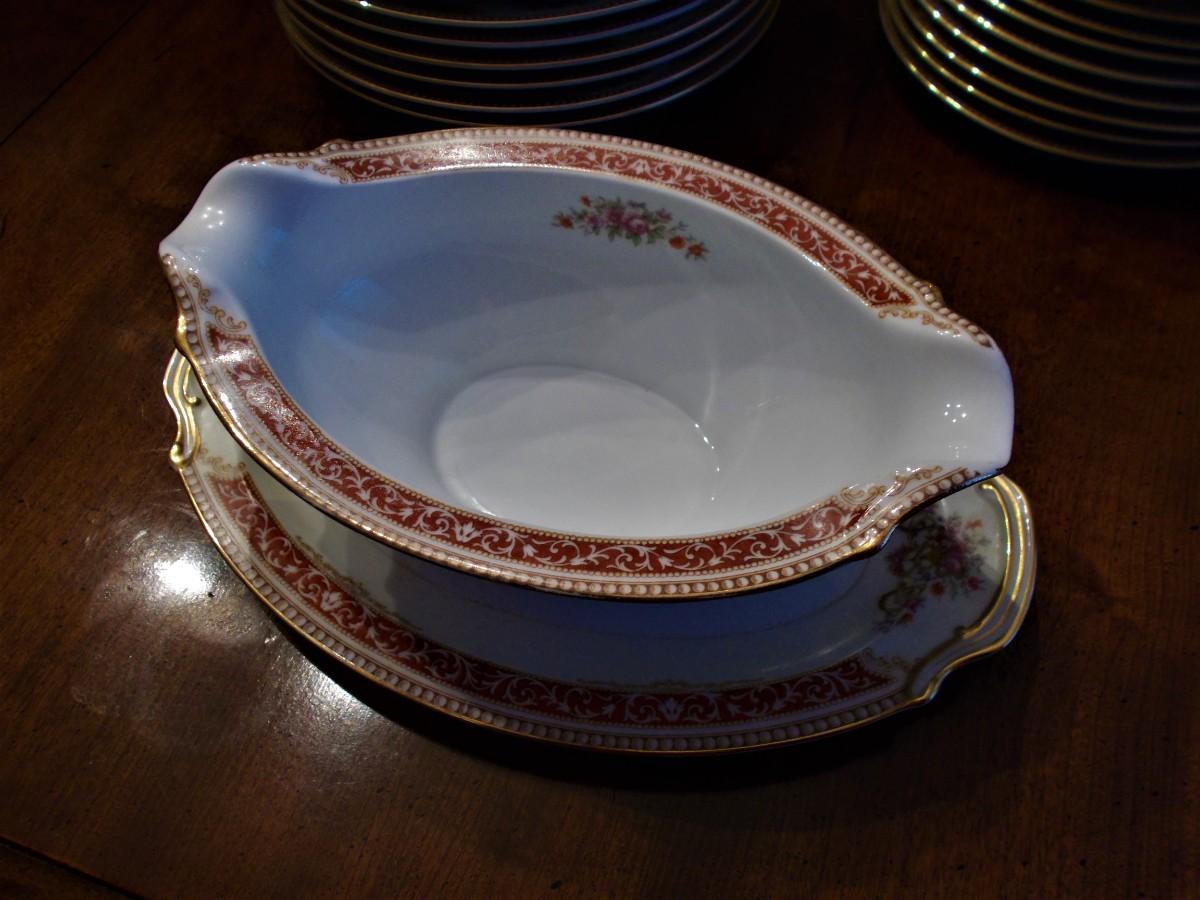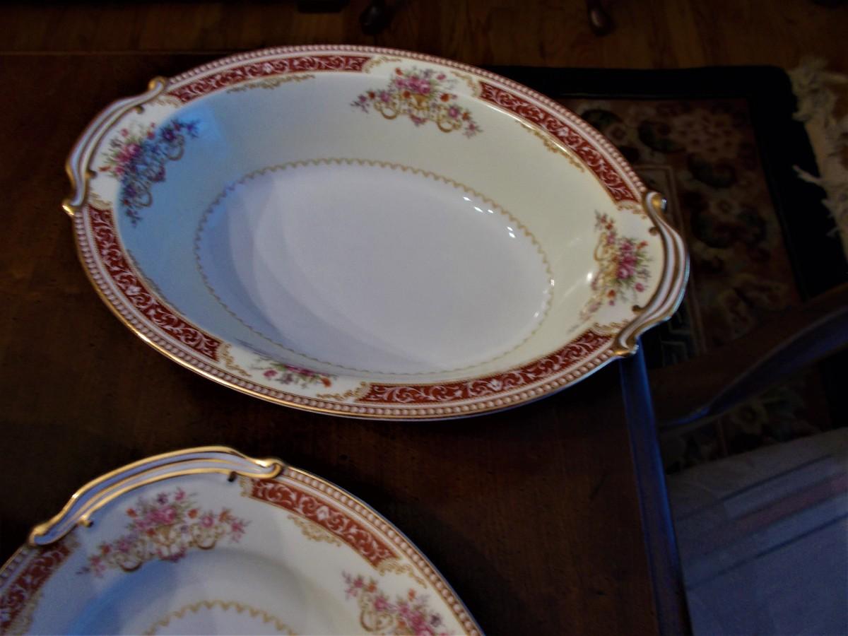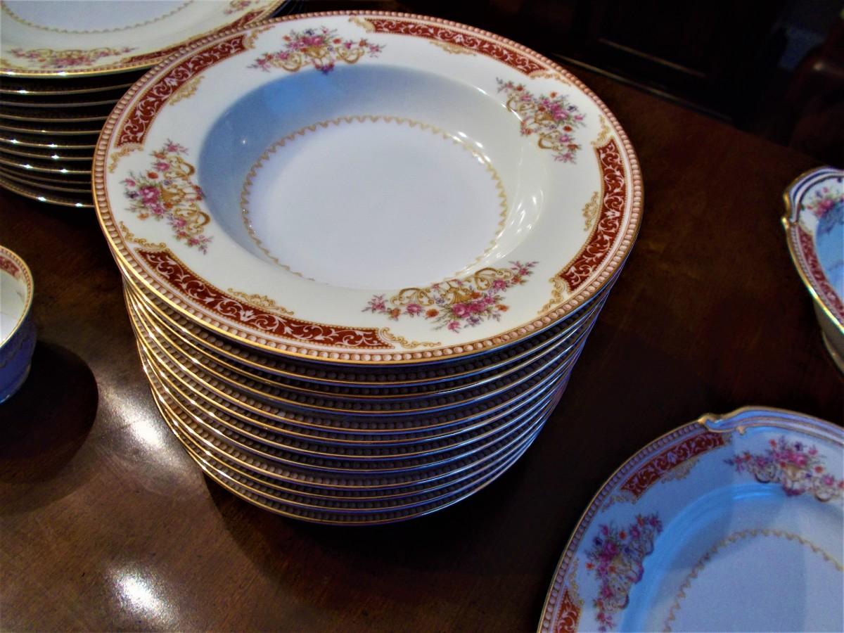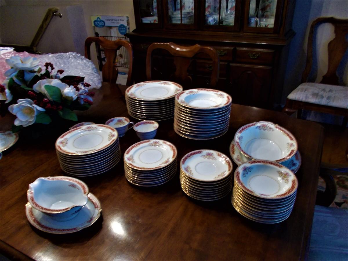 This beautiful set is genuine Noritake China made in Occupied Japan. It consists of 167 gold trimmed pieces and an additional 6 pieces which have damage (chips) are included in addition to the 167 for repair. "Replacements Ltd" can repair these pieces if they are sent to them. The pattern is "Mystery". You can also purchase additional pieces from Replacements ltd as well. This is a rare pattern. This set includes 11 dinner plates, 11 salad plates,9 bread plates, 12 soup bowls, 10 berry bowls, 3 cups, 9 saucers, 1 gravy boat and tray, 1 platter, and a vegetable serving bowl. The last picture shows the 6 damaged pieces.