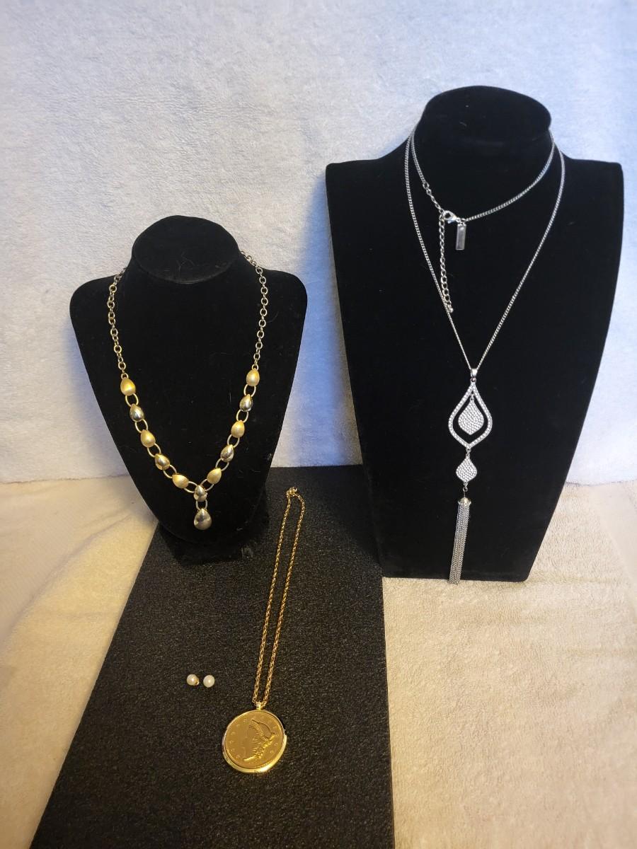 GENUINE PEARL EARRINGS, TRIFARI NECKLACE AND 2 OTHER NECKLACES