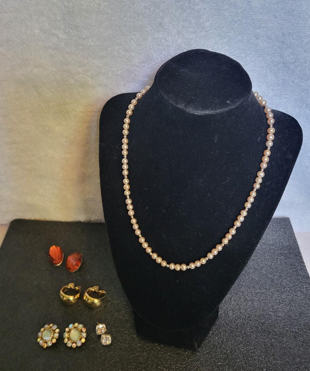 GENUINE PEARL NECKLACE AND 4 PAIRS OF EARRINGS