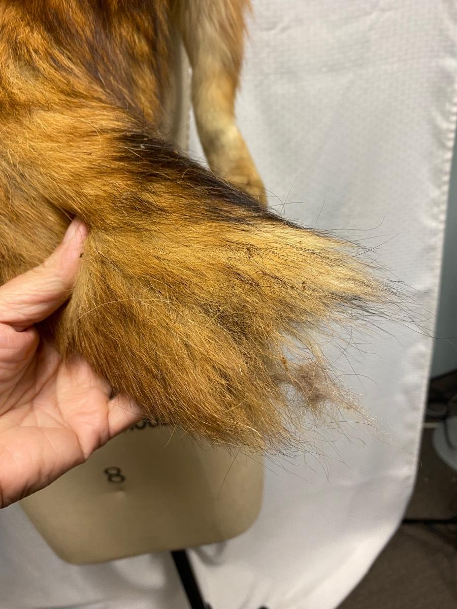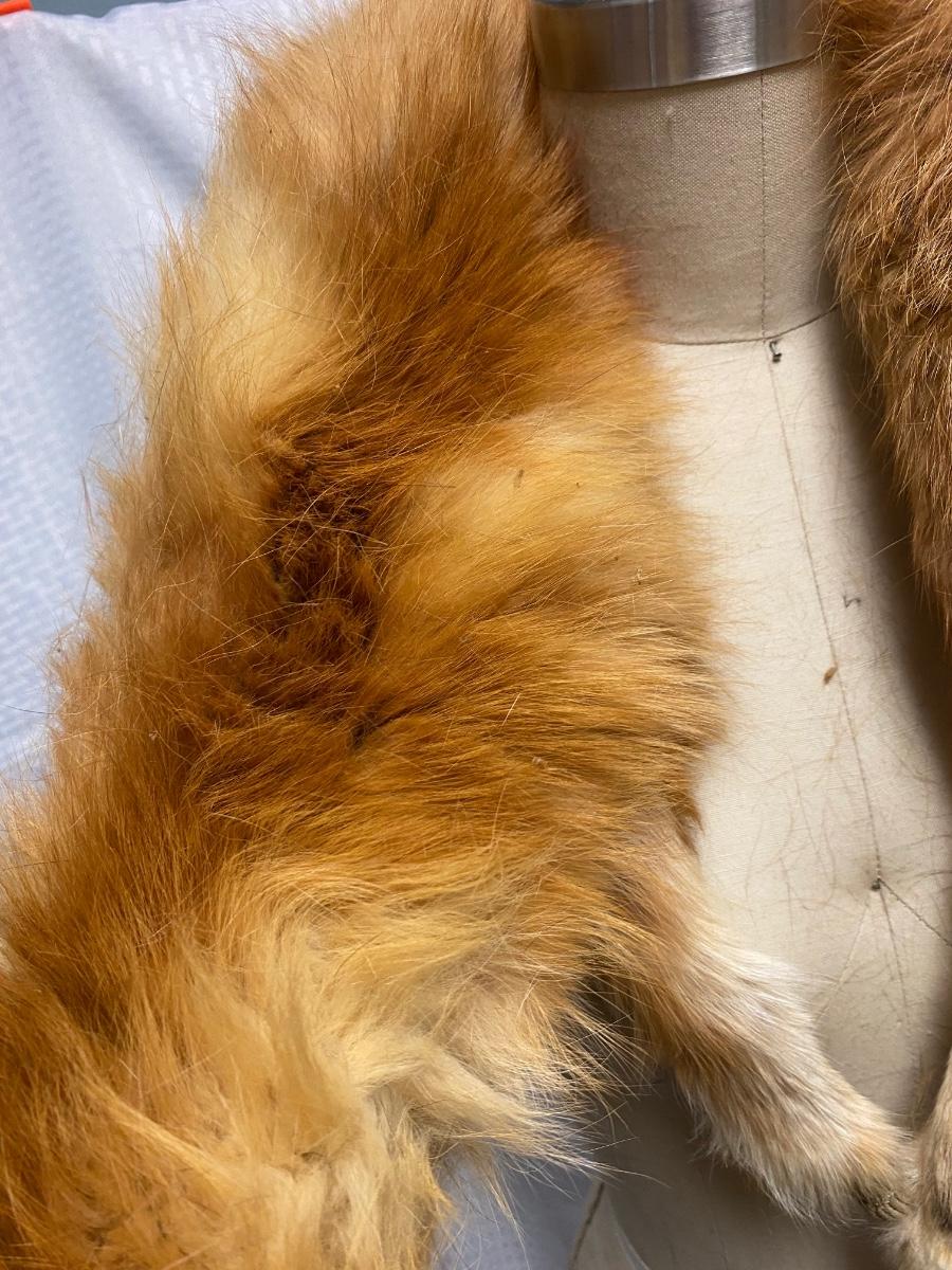 Genuine Real Red Fox Fur Shawl Shoulder Wrap with Head, Legs, & Tail. Vintage condition. Unfortunately, the fur has started to degrade, the white tail tip common with red fox has fallen off and the tail fur will pull apart if not handled gently. Full body fox with a clip at mouth for securing around shoulders. About 4' total length. See photos.