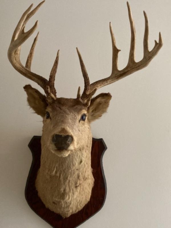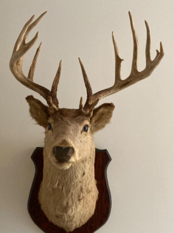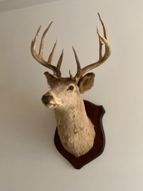 Client hunted this buck in the 1960s in Pierre, South Dakota and had it professionally mounted on wood crest. Appears to be 16 points. Blond with spots (not a deer expert!)