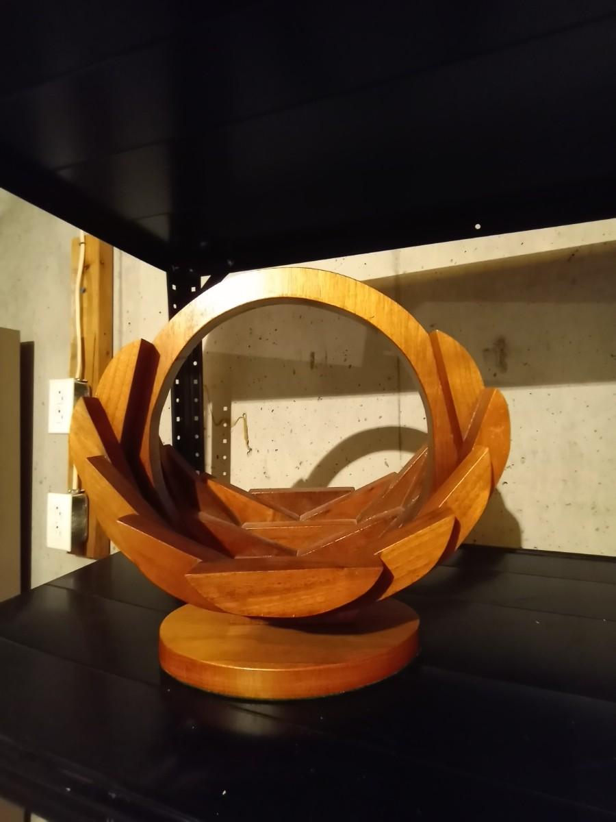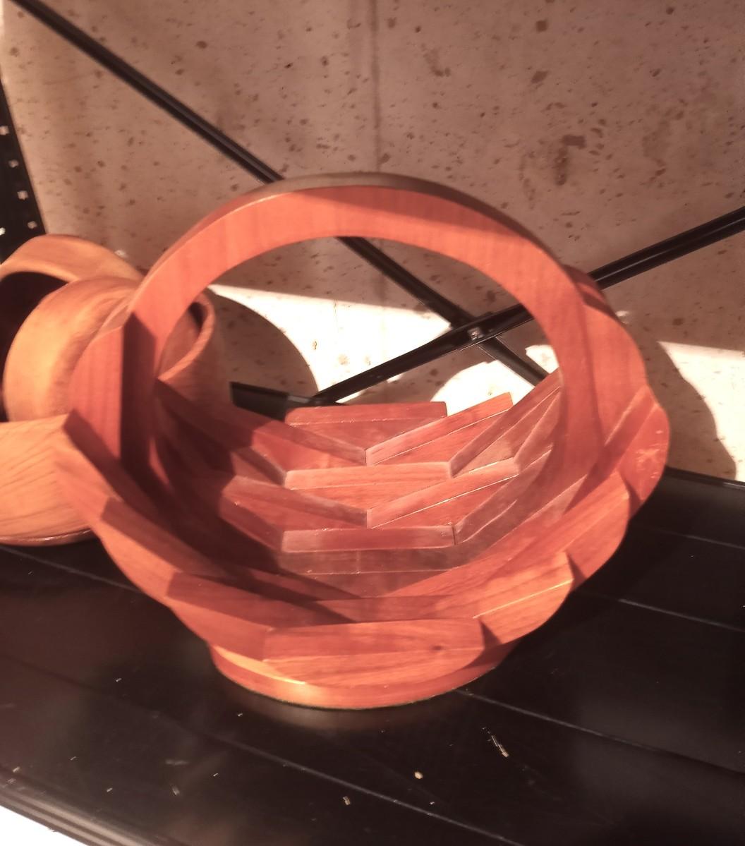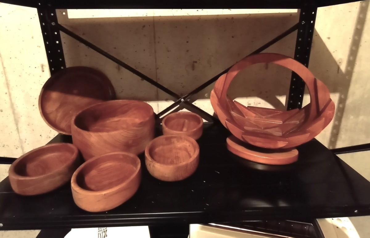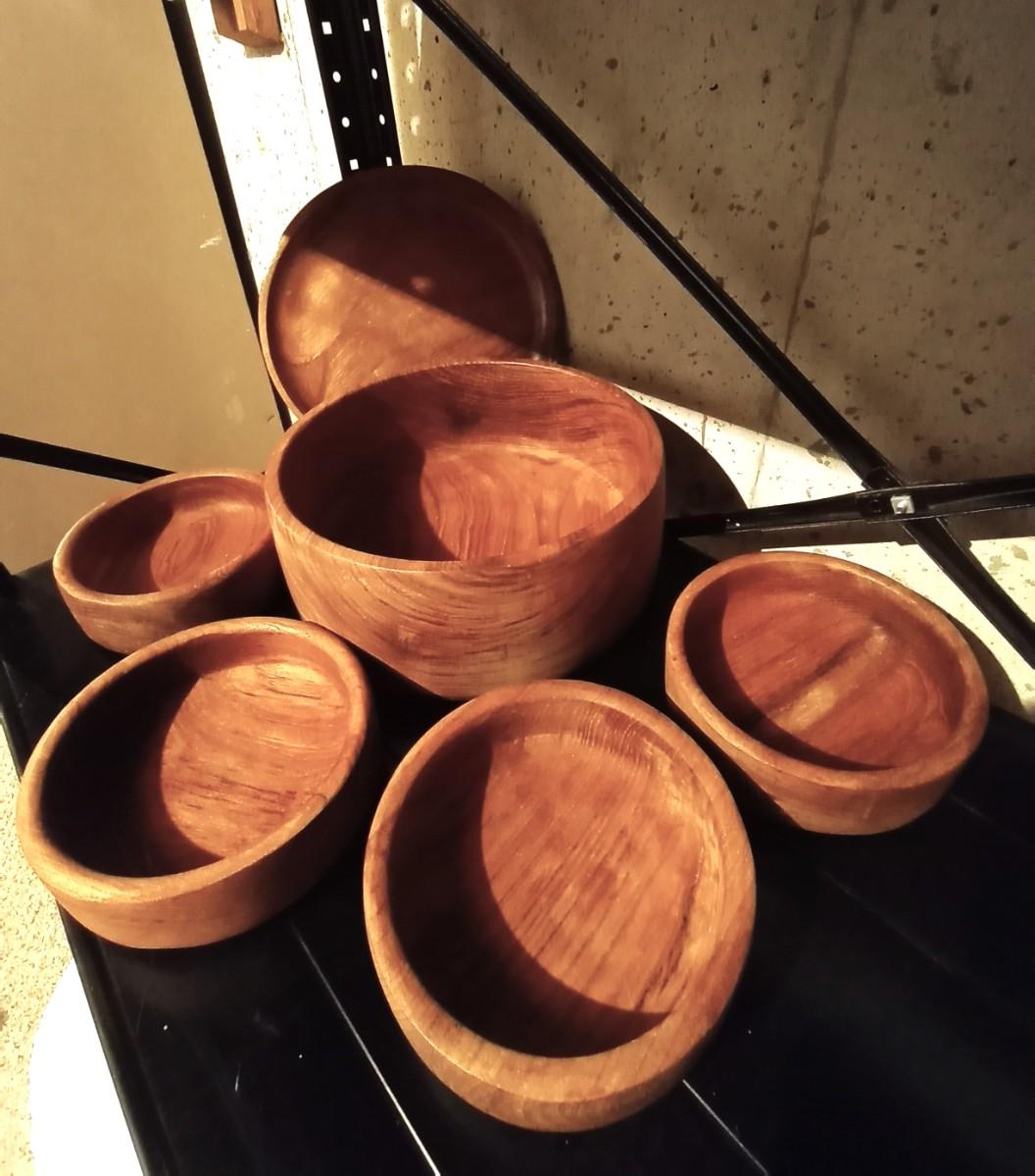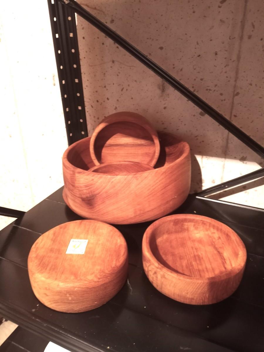 GENUINE TEAK SALAD SERVER 10" ROUND AND FOUR BOWLS AND WOODEN BASKET 12X12