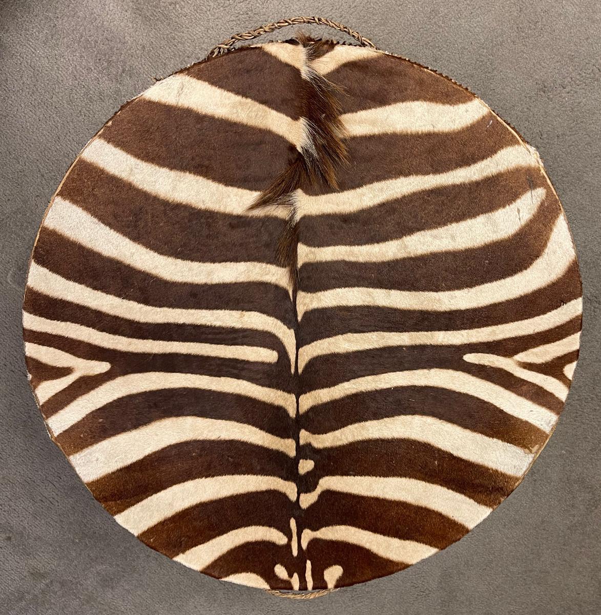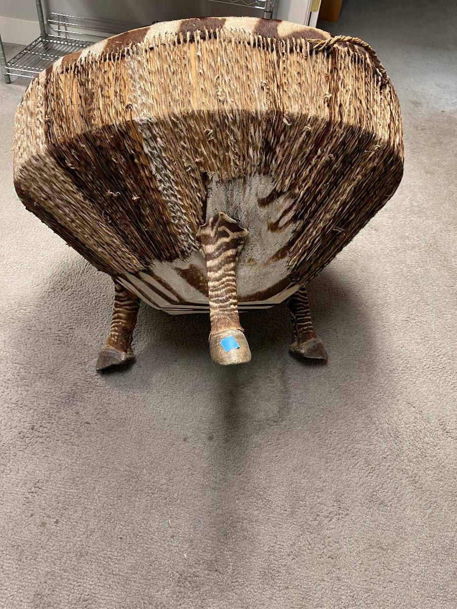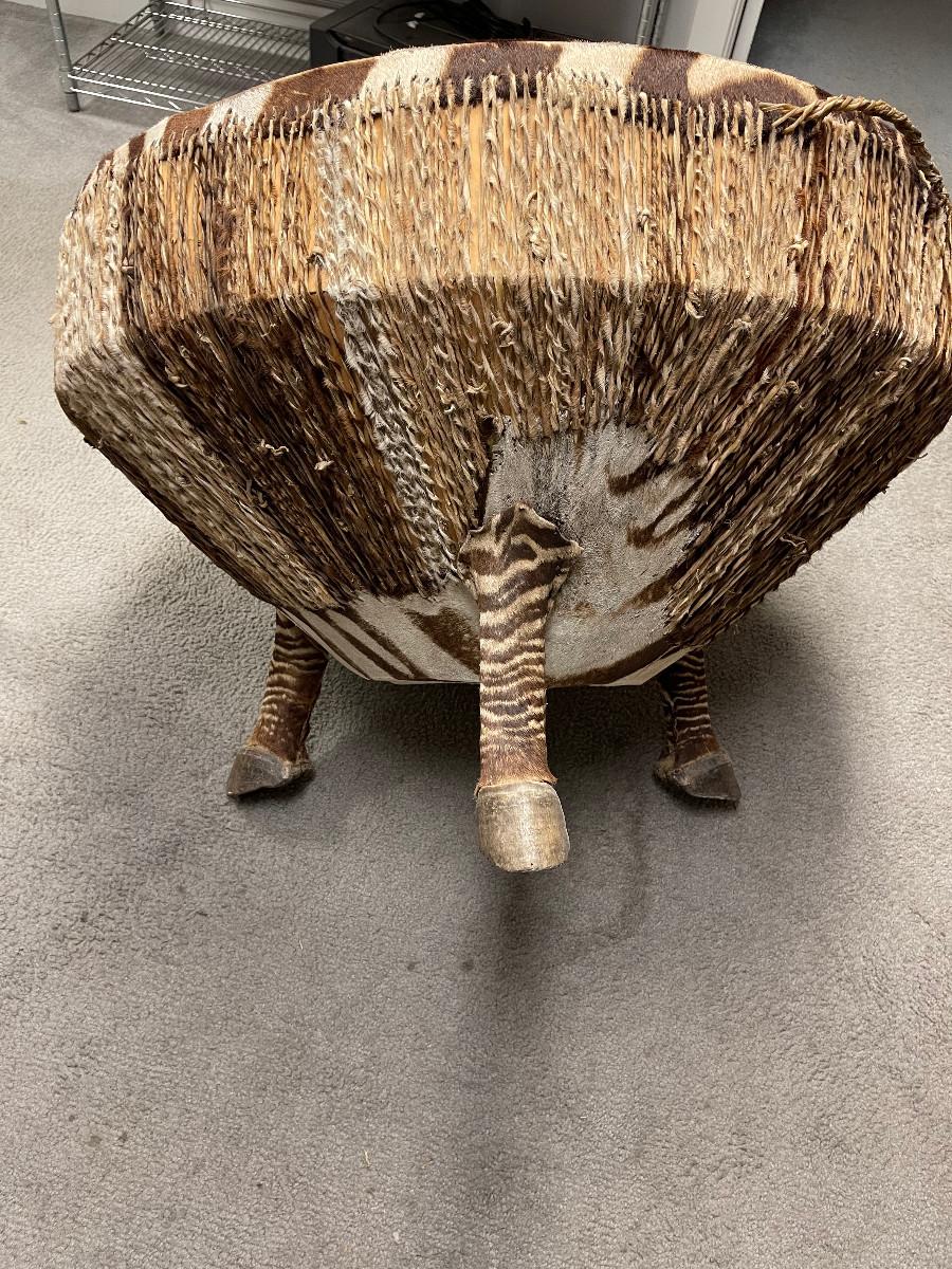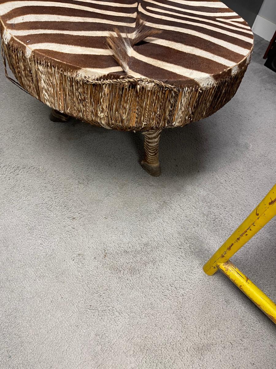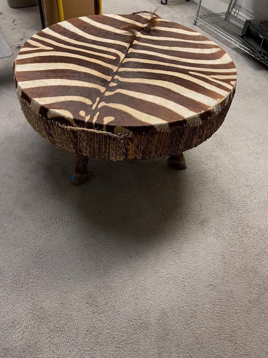 Unique item genuine stretched zebra hide drum round table. 40" diameter about 20" tall, tripod legs real hooves.