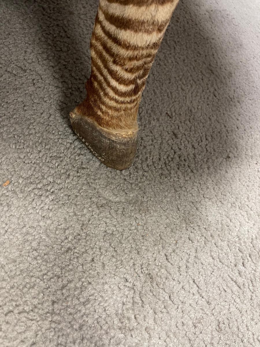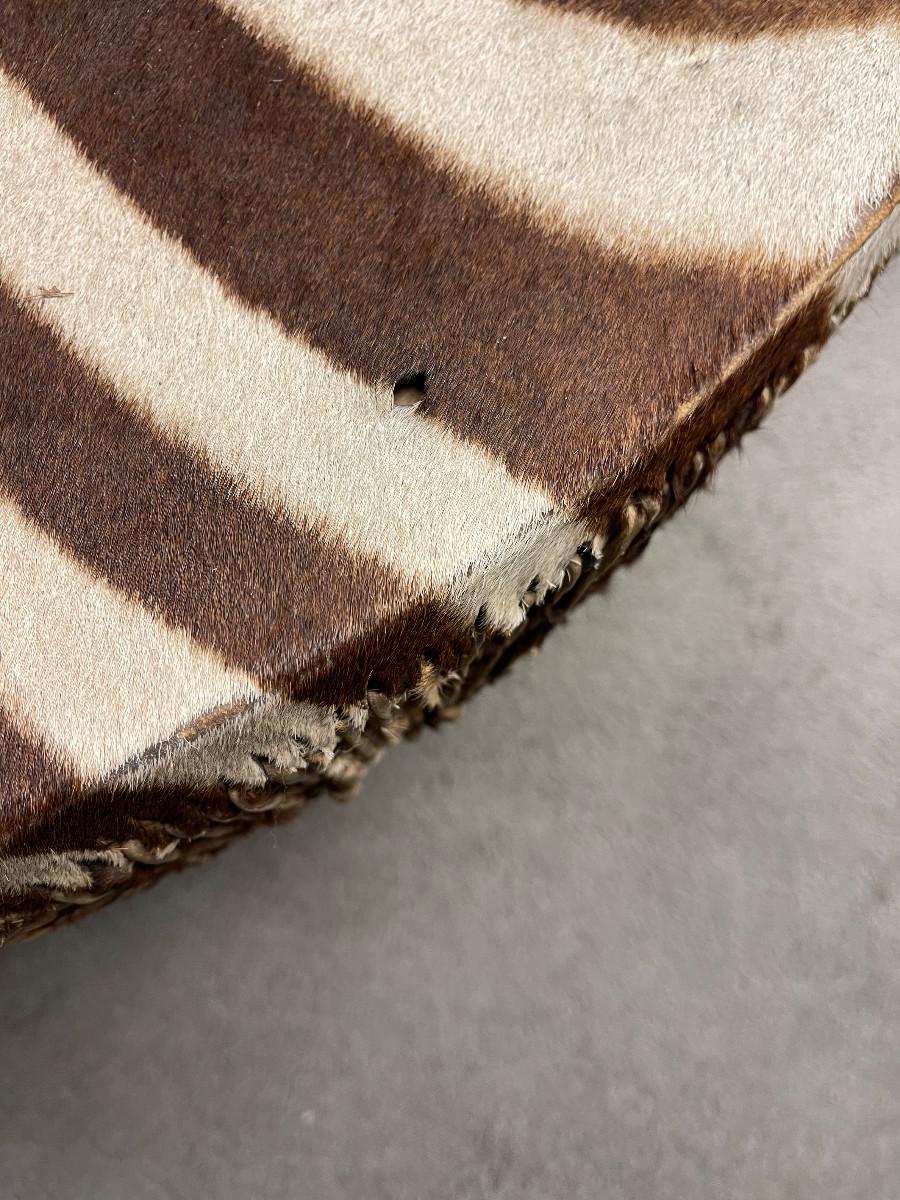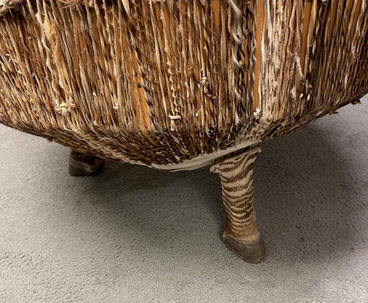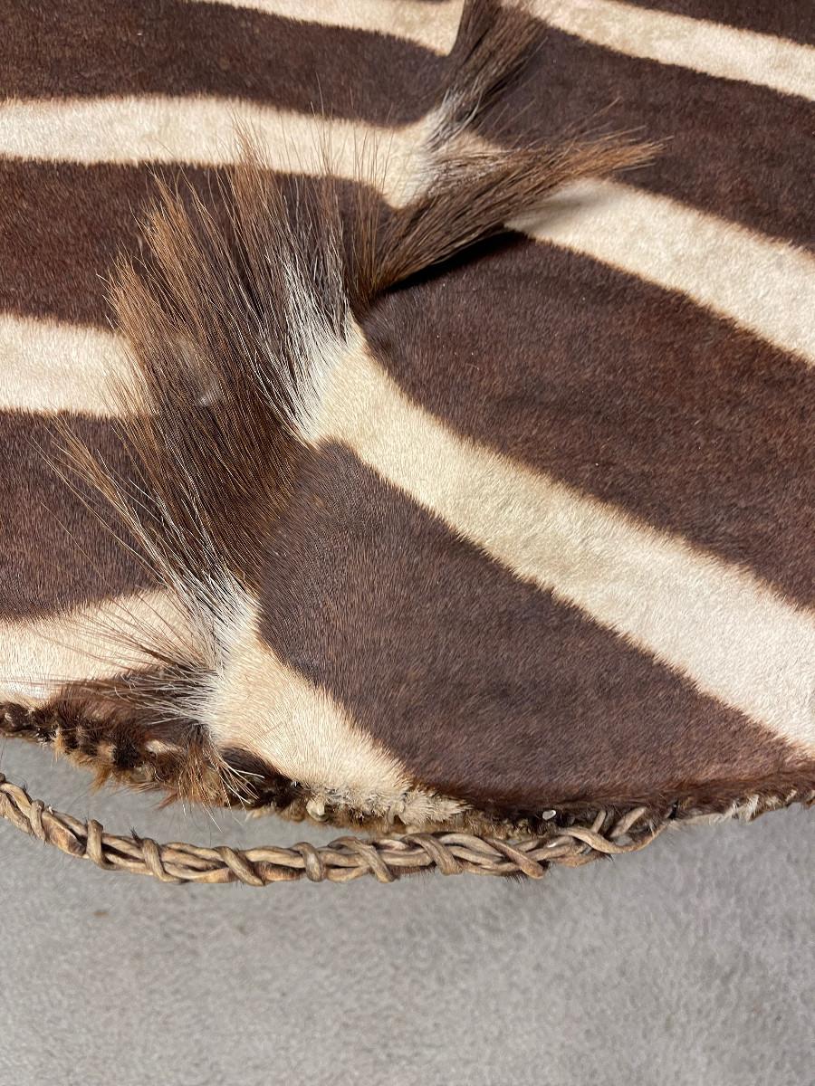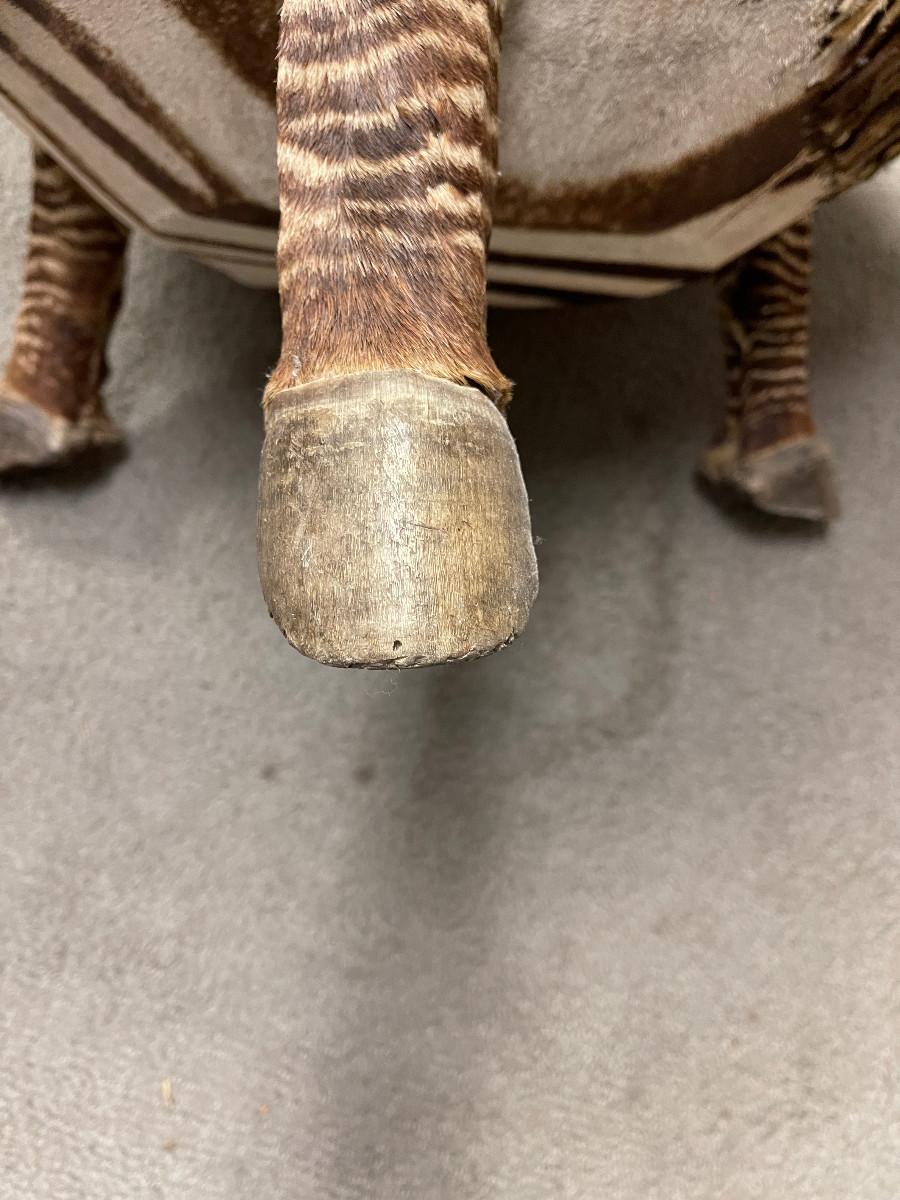 Unique item genuine stretched zebra hide drum round table. 40" diameter about 20" tall, tripod legs real hooves.