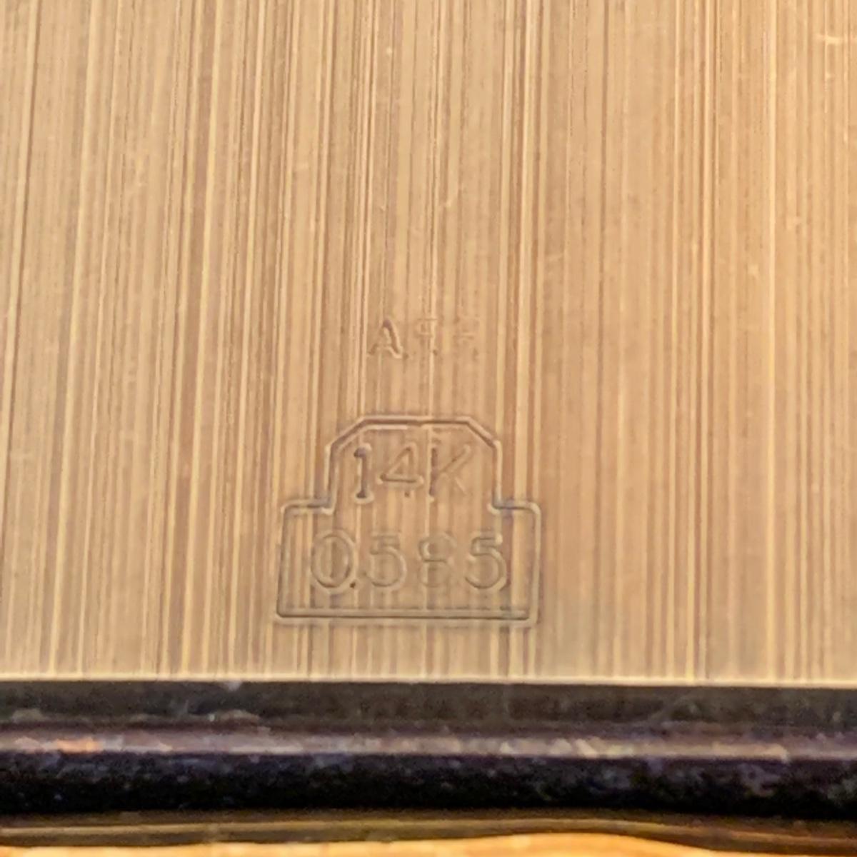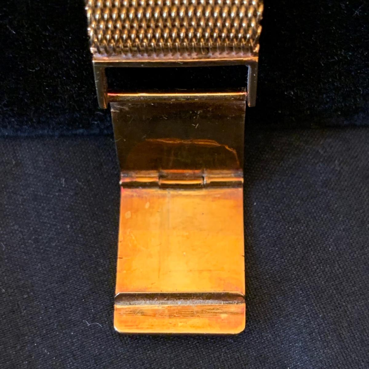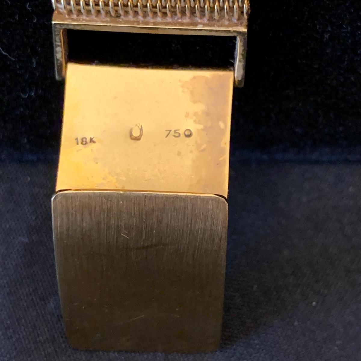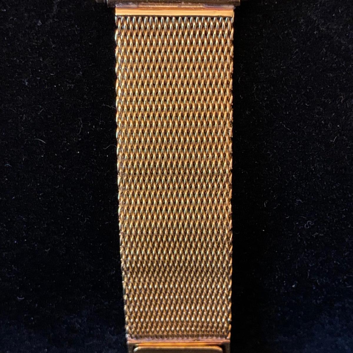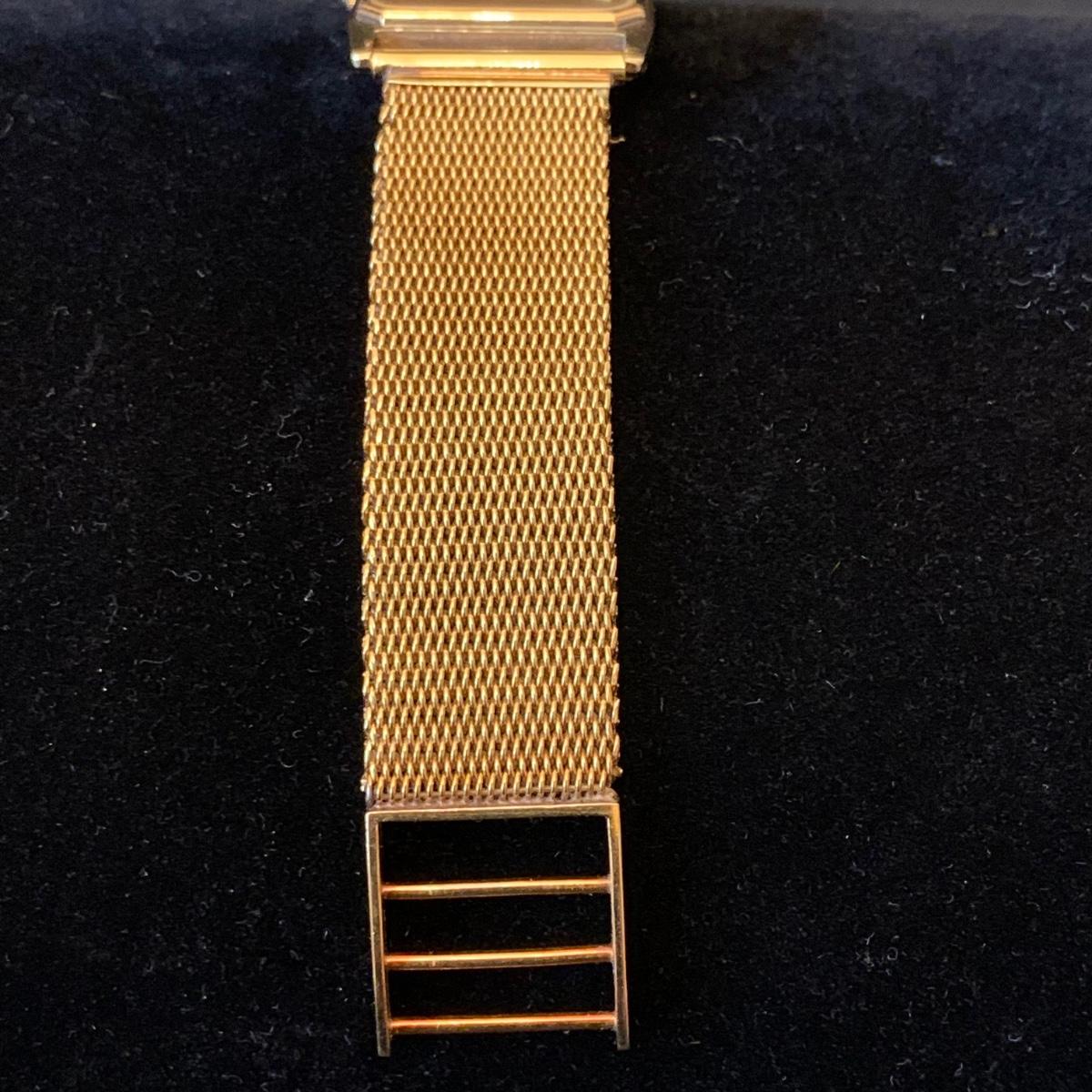 Beautiful 14K gold quartz watch by Genève that features a mesh watch band. It is Swiss made. marked 0585. Back of watch is marked 14K, clasp is marked 18K. Watch face measures about 1” x 1.25”. It is about 7.5” long. It is not currently ticking and likely needs a new battery. Watch comes in a box.