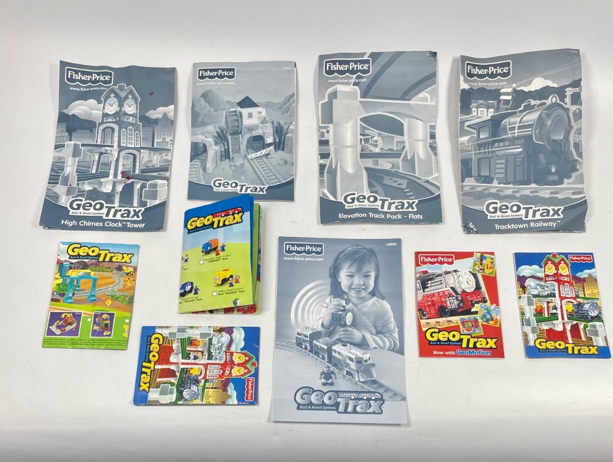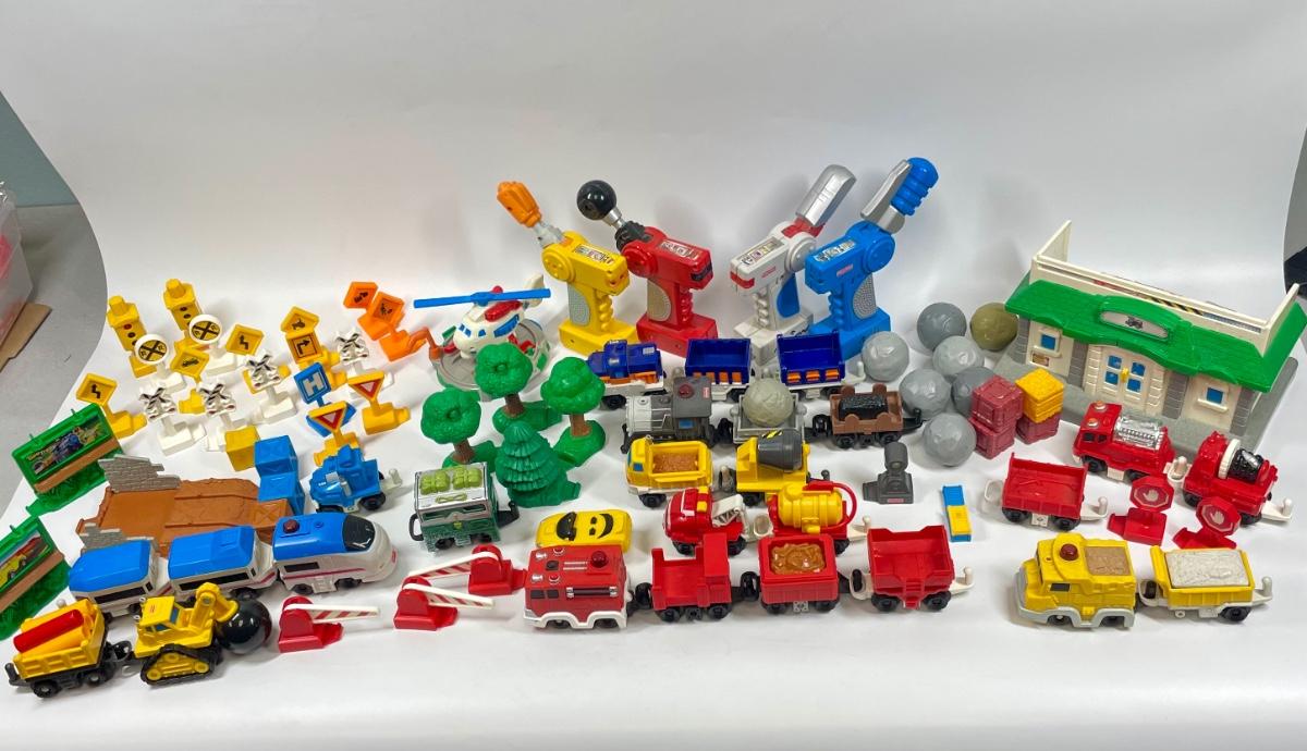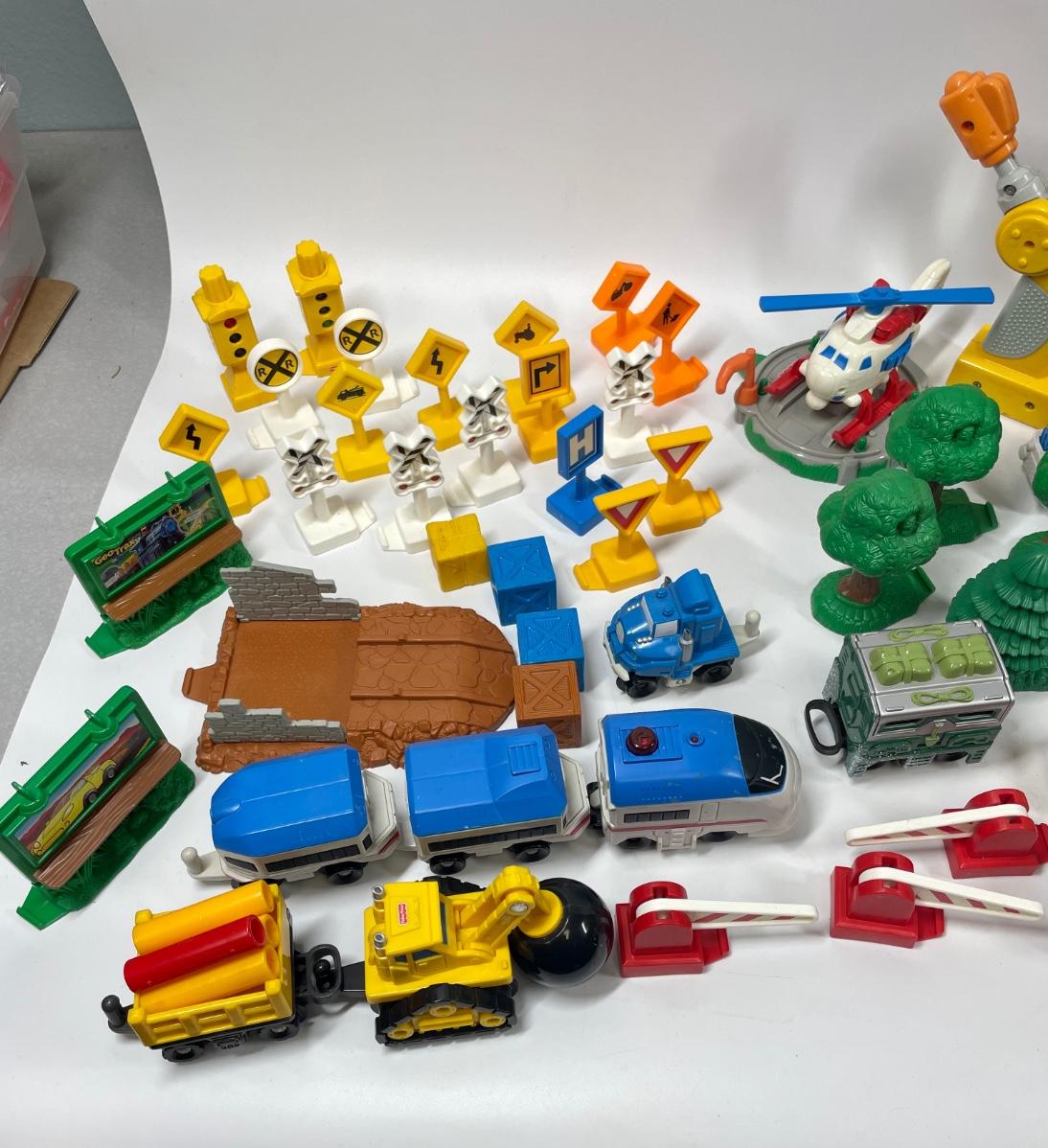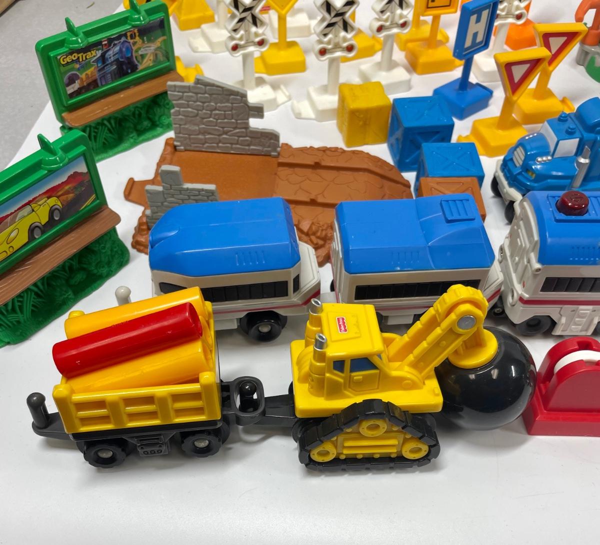 Huge lot of Geo Trax items: Trains, train controllers, vehicles, road signs, traffic signals, helicopter, trees, instruction manuals and a building.