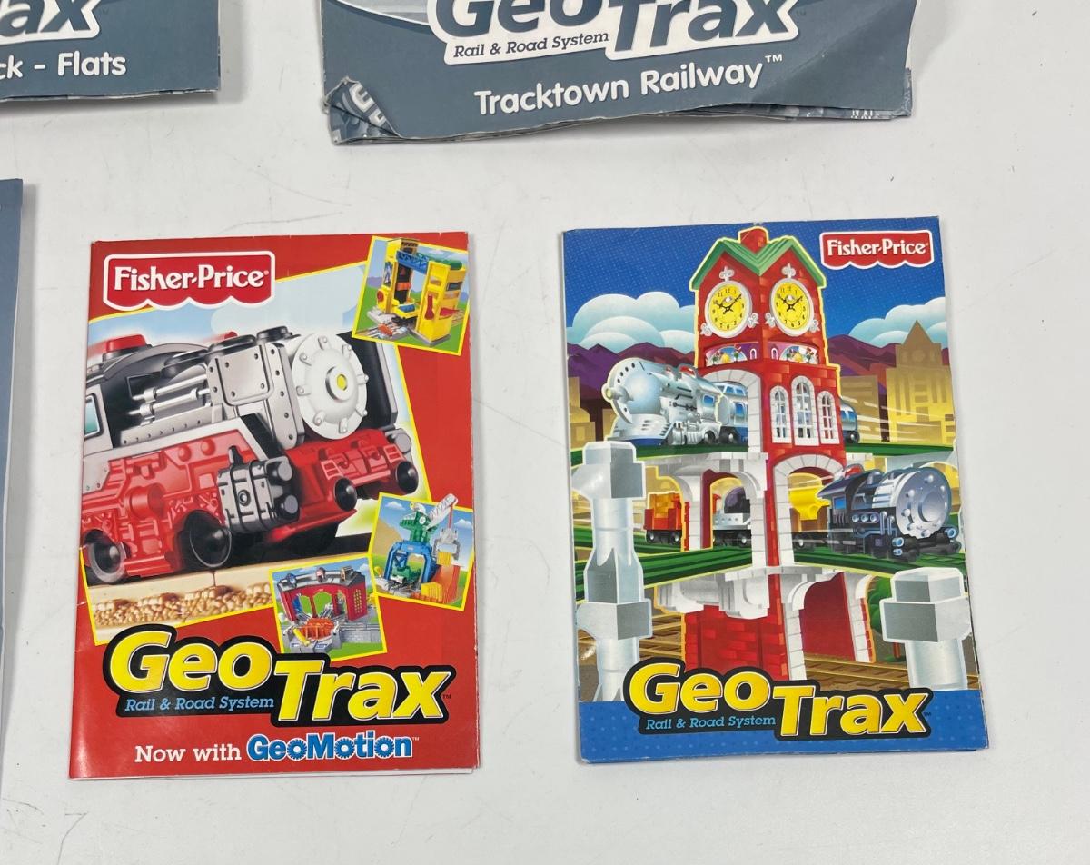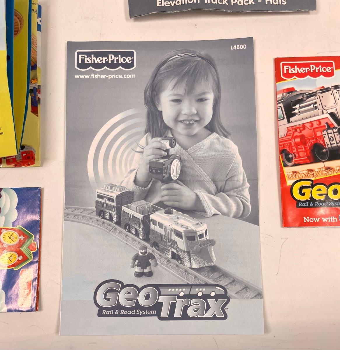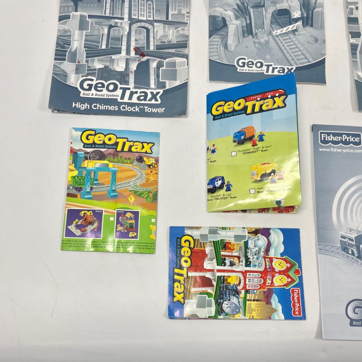 Huge lot of Geo Trax items: Trains, train controllers, vehicles, road signs, traffic signals, helicopter, trees, instruction manuals and a building.