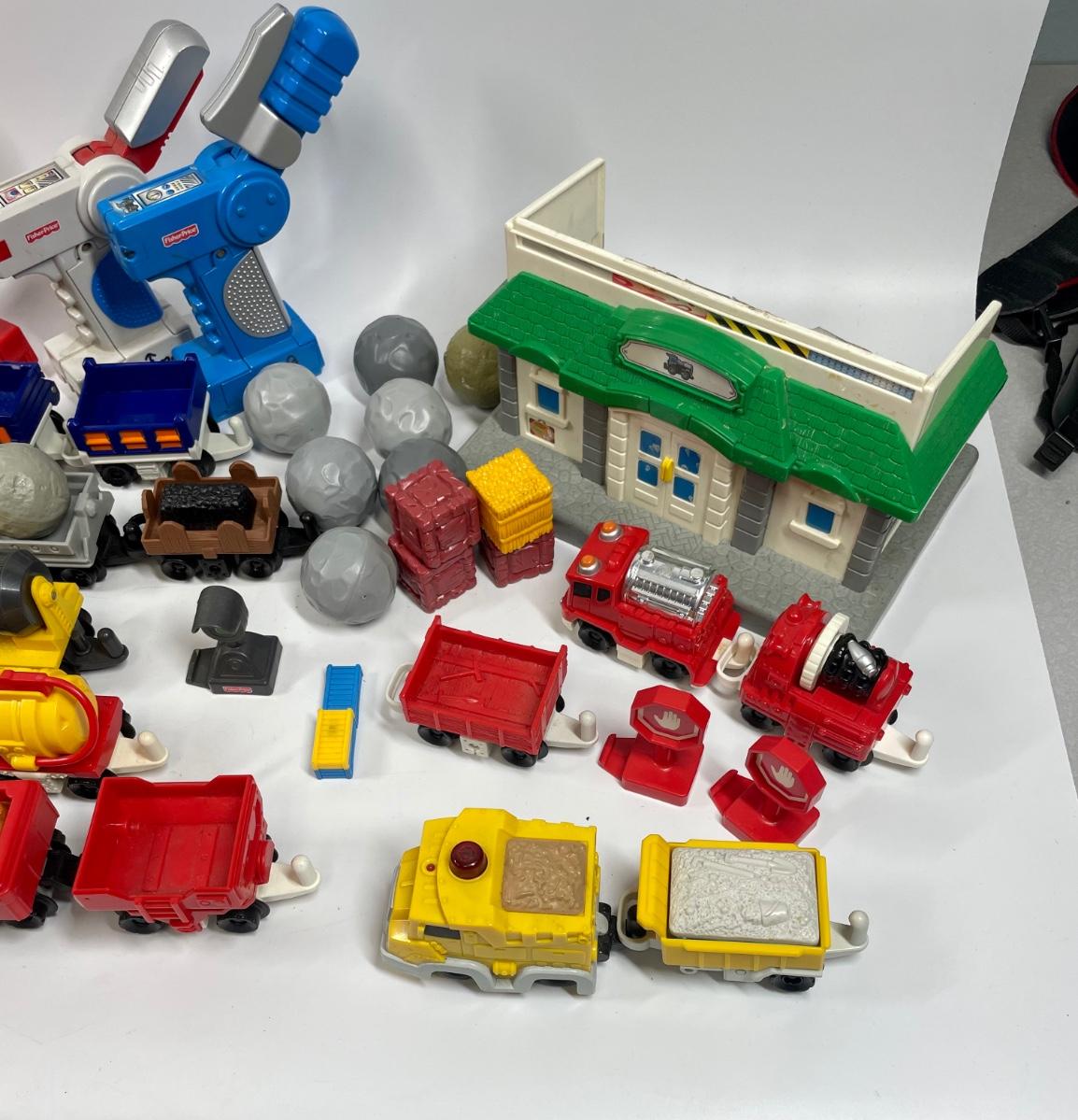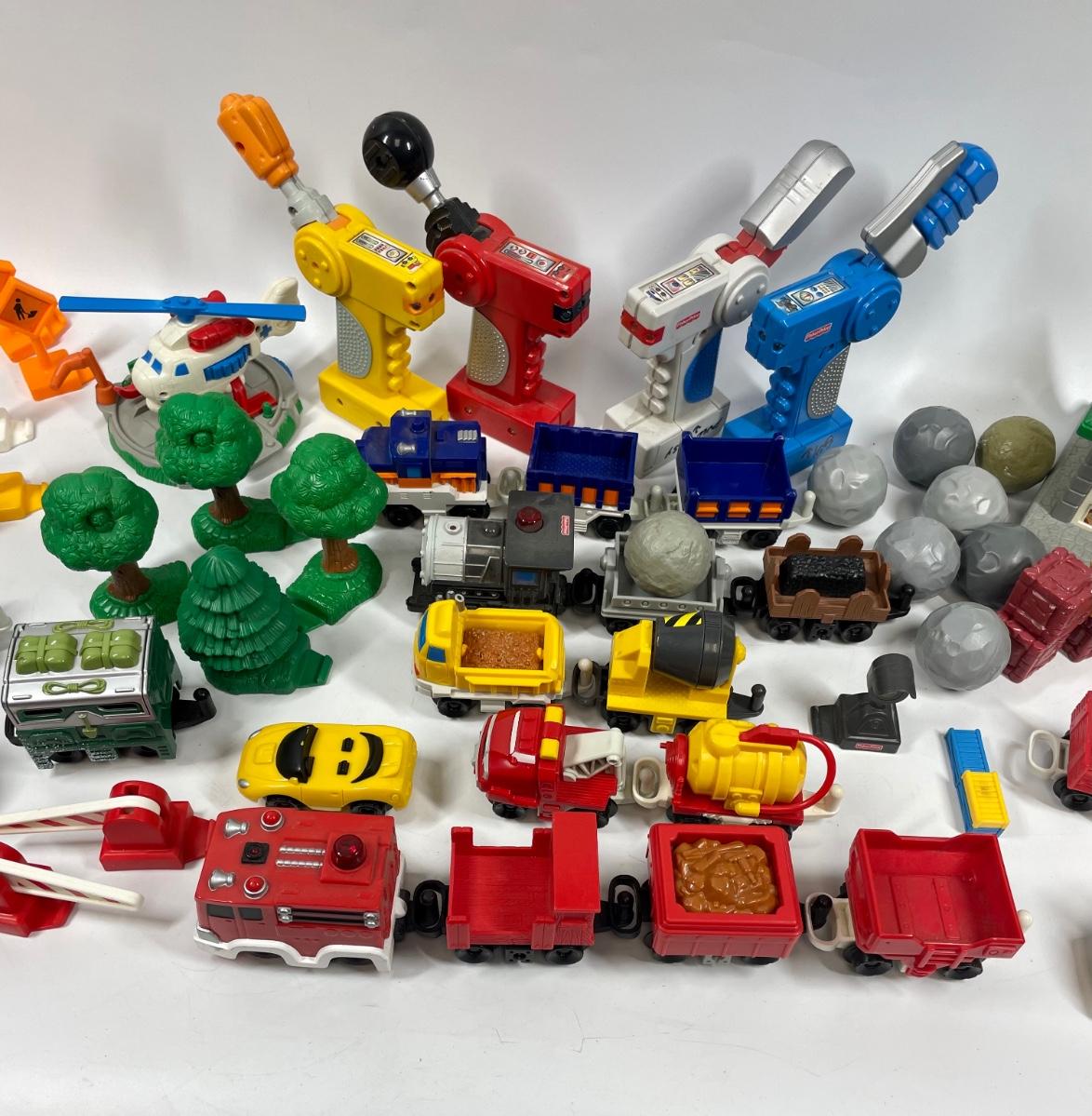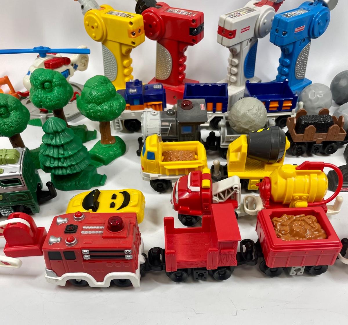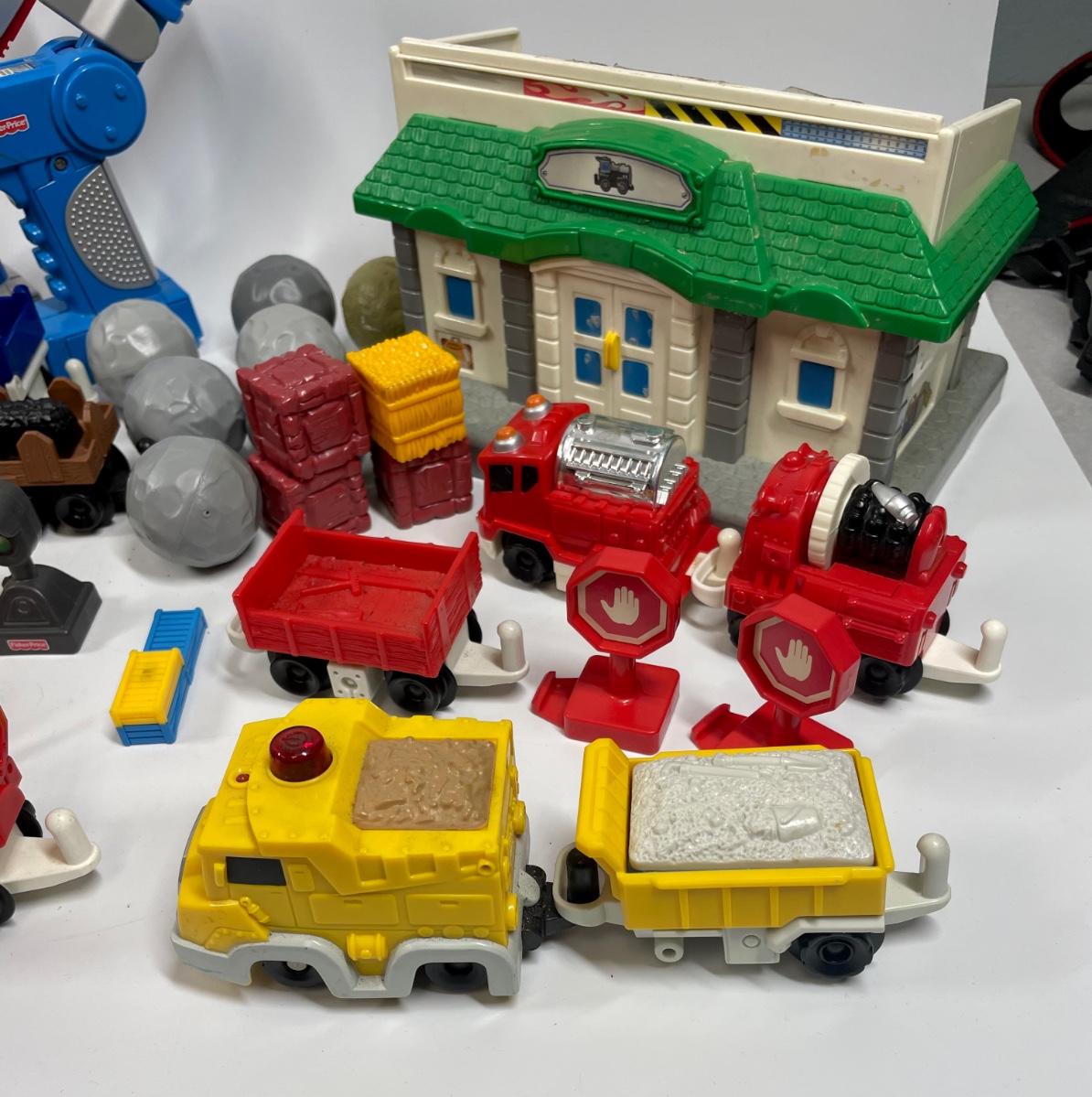 Huge lot of Geo Trax items: Trains, train controllers, vehicles, road signs, traffic signals, helicopter, trees, instruction manuals and a building.