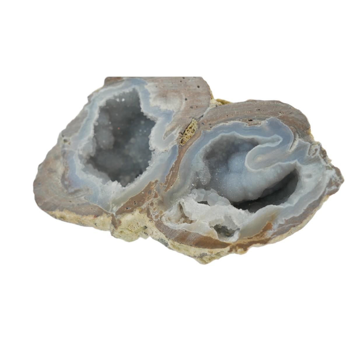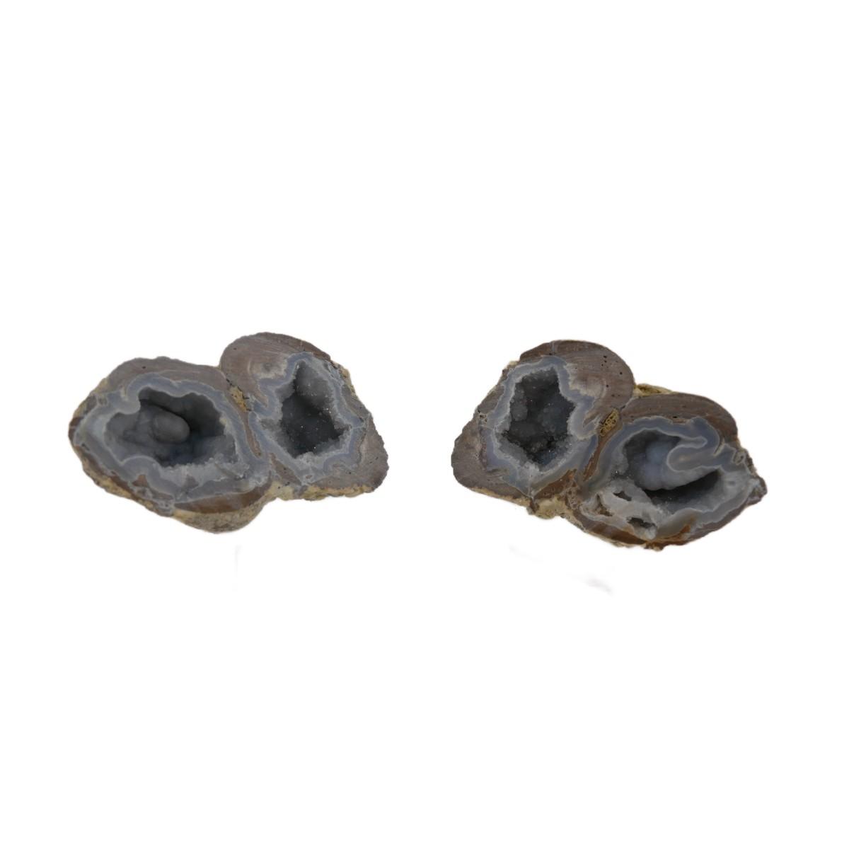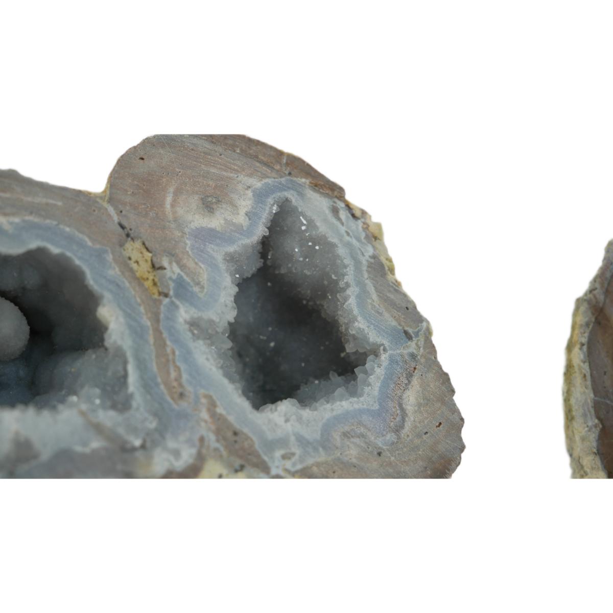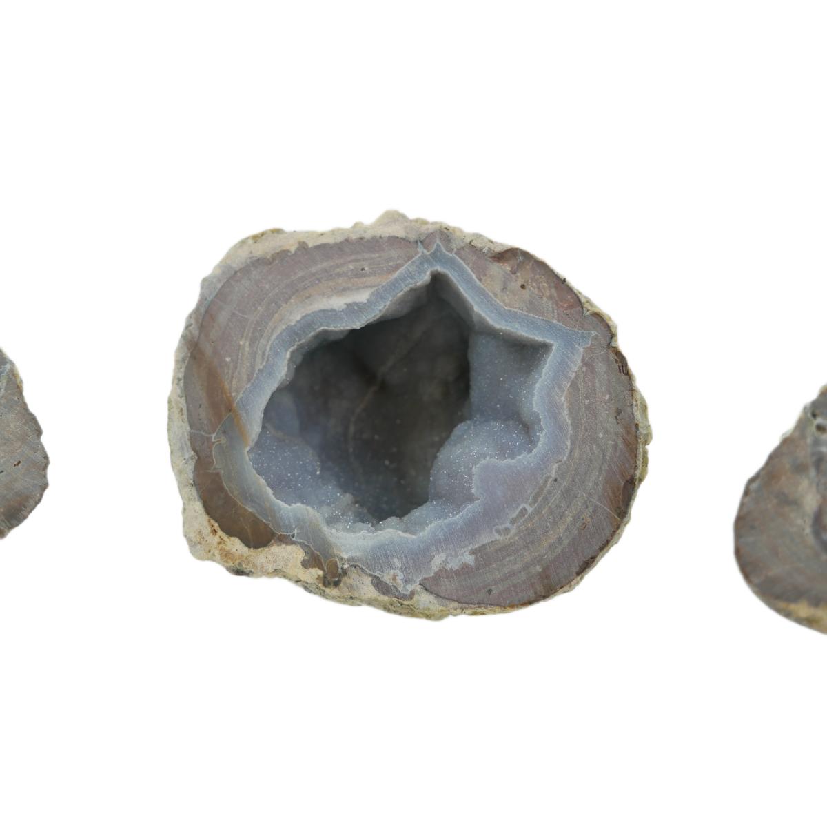 Three halved geode specimens. One is a dual geode cut with both halves and the other is one single half of a cut geode. Incredibly stunning pieces! Beautiful periwinkle blue/purple color. Superb condition! Stands not included. Largest measures L 4" x H 2" x W 2". Lot weighs 14 oz. (R14)
